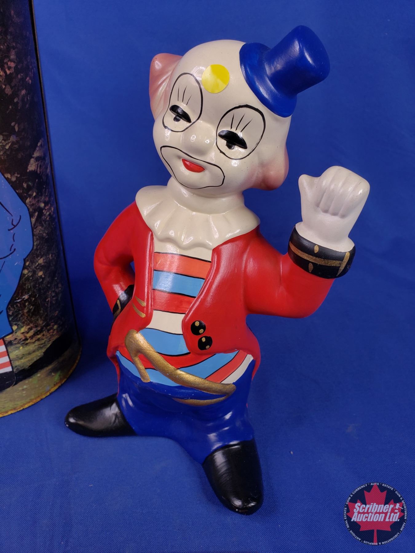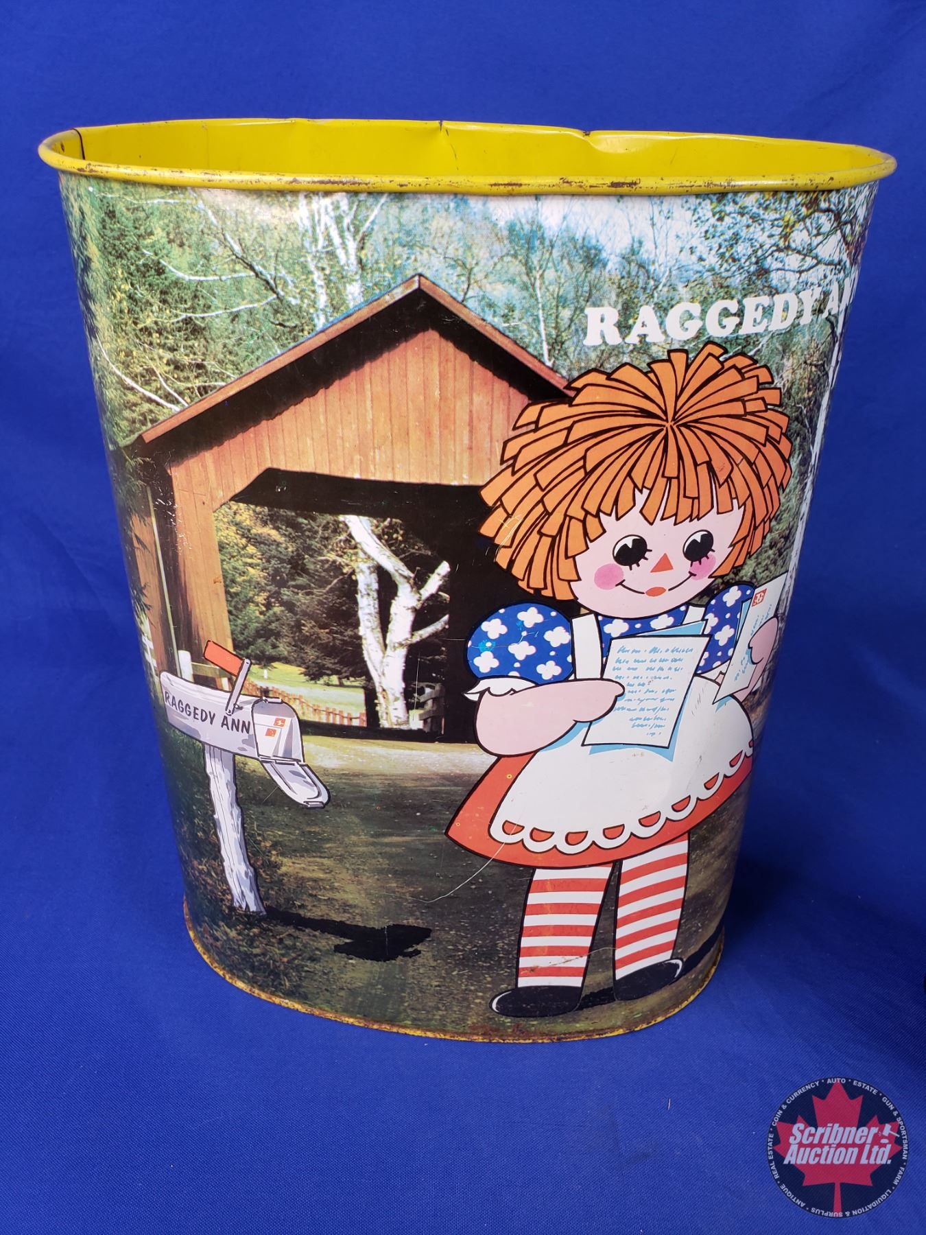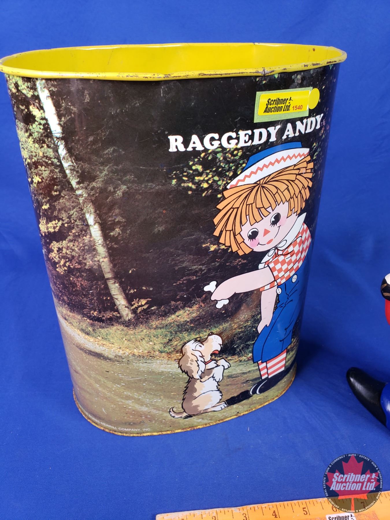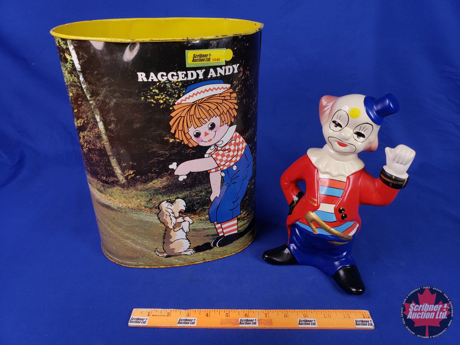 Raggedy Andy Waste Basket & Ceramic Clown Money Bank (Waste Basket 13"H x 10"W x 7"D) (SEE PICS!)