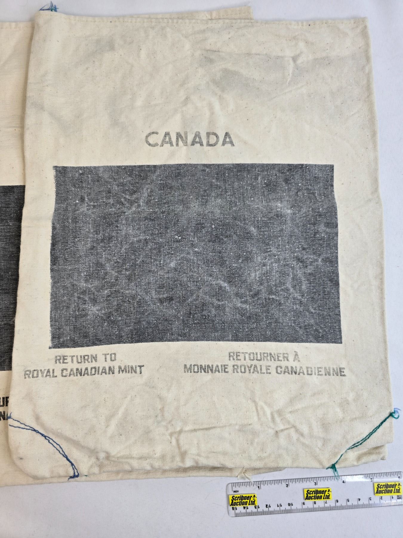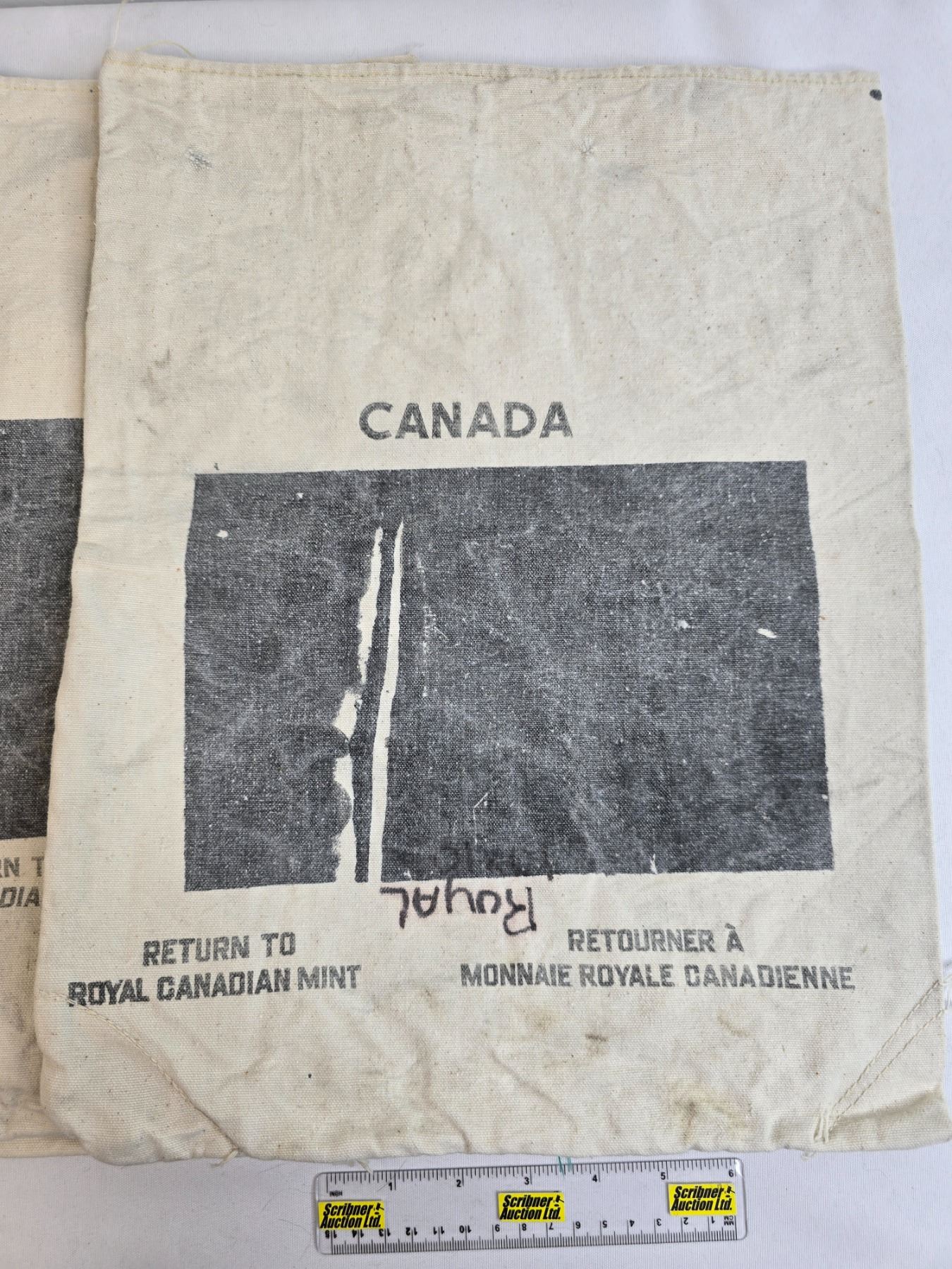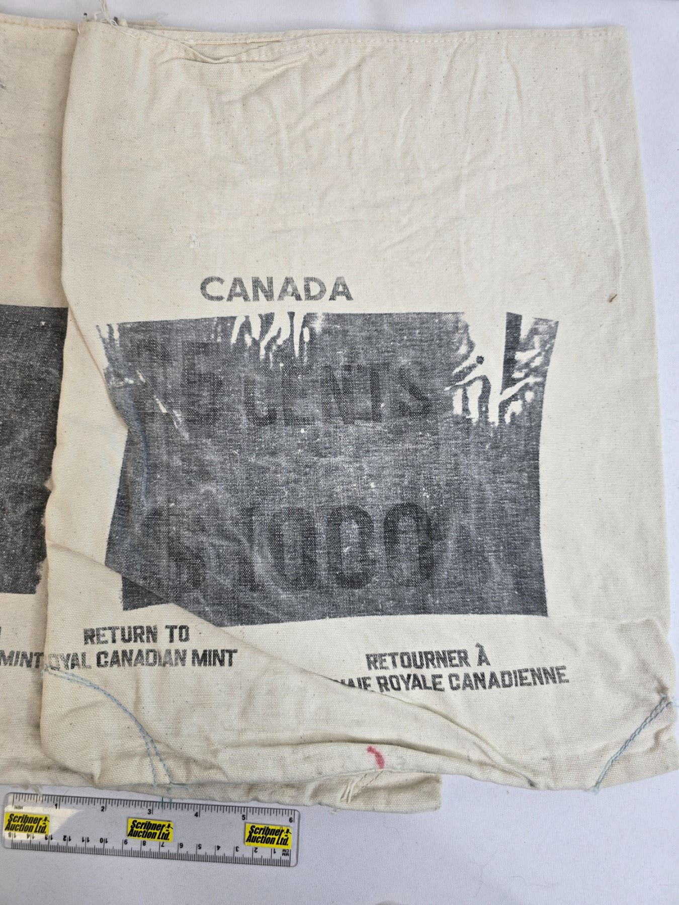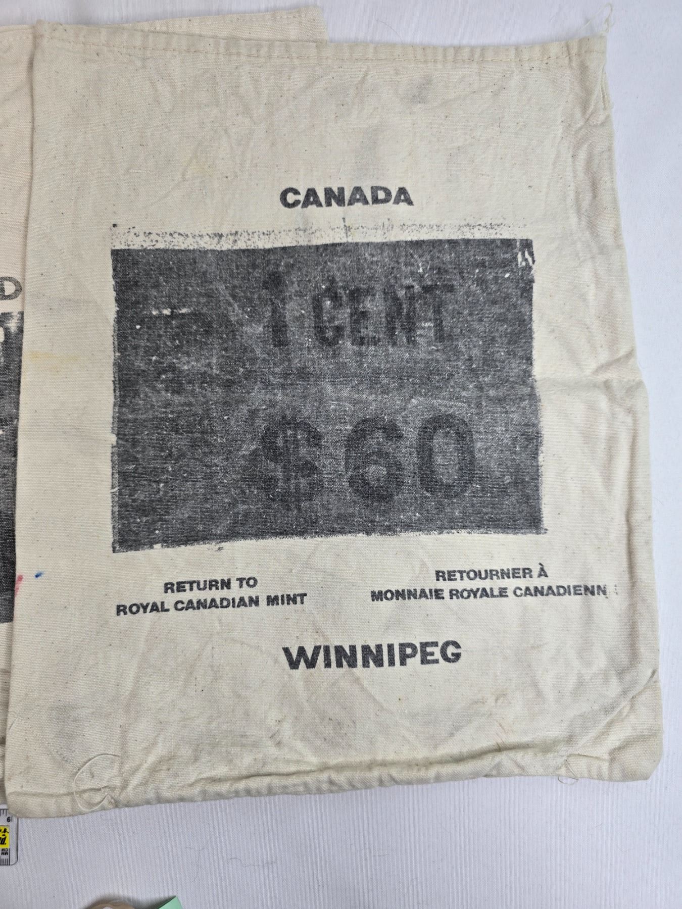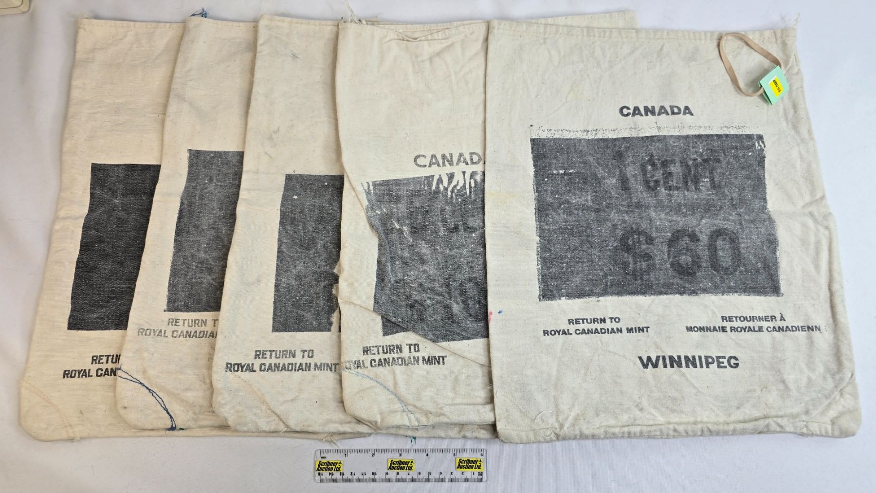 Royal Canadian Mint Money Sacks (5) : Variety - Blank ? (3) - 25¢ (1) - 1¢ (1) (Listing & Descriptions are a GUIDE ONLY and are subject to changes, errors, additions or deletions. Please use the provided pictures to satisfy yourself to the Condition and/or Grades. Please Read & Understand All Terms & Conditions for this Auction Sale.)