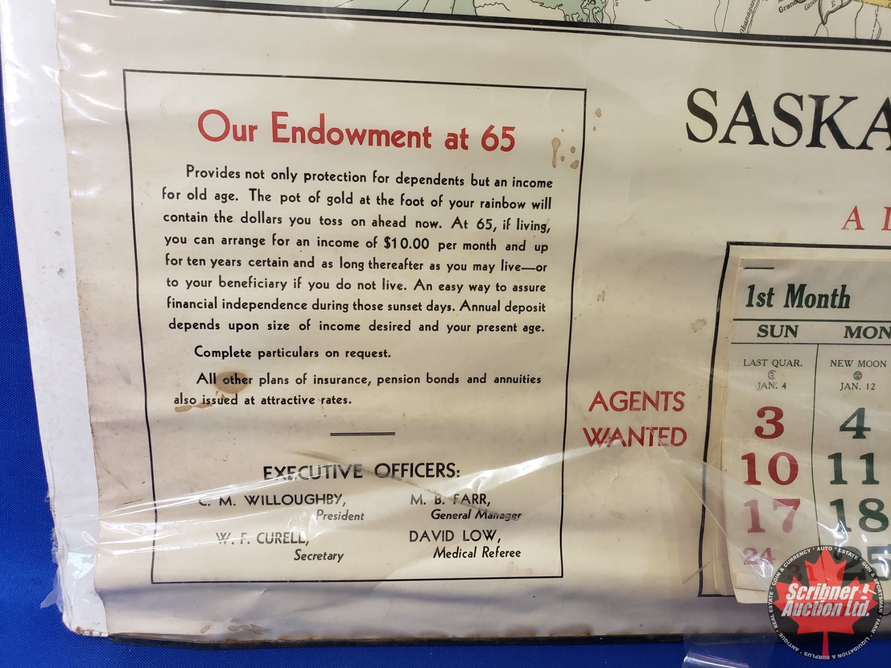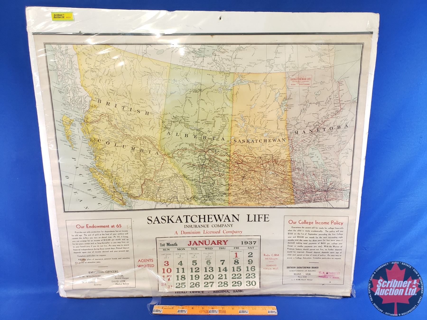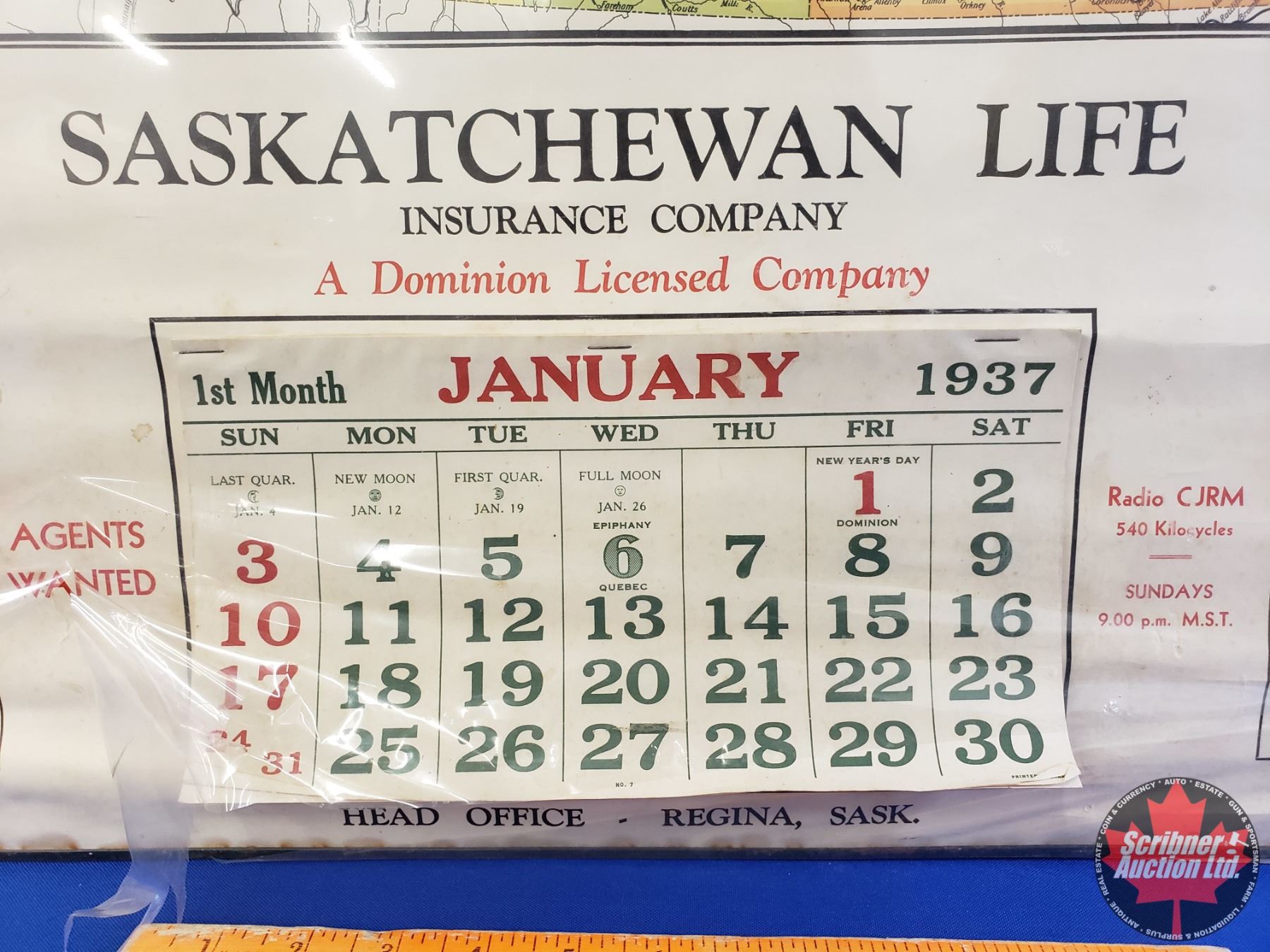 "SASKATCHEWAN LIFE INSURANCE COMPANY" 1937 Calendar & Map (28"H x 30-1/2"W) (SEE PICS!)