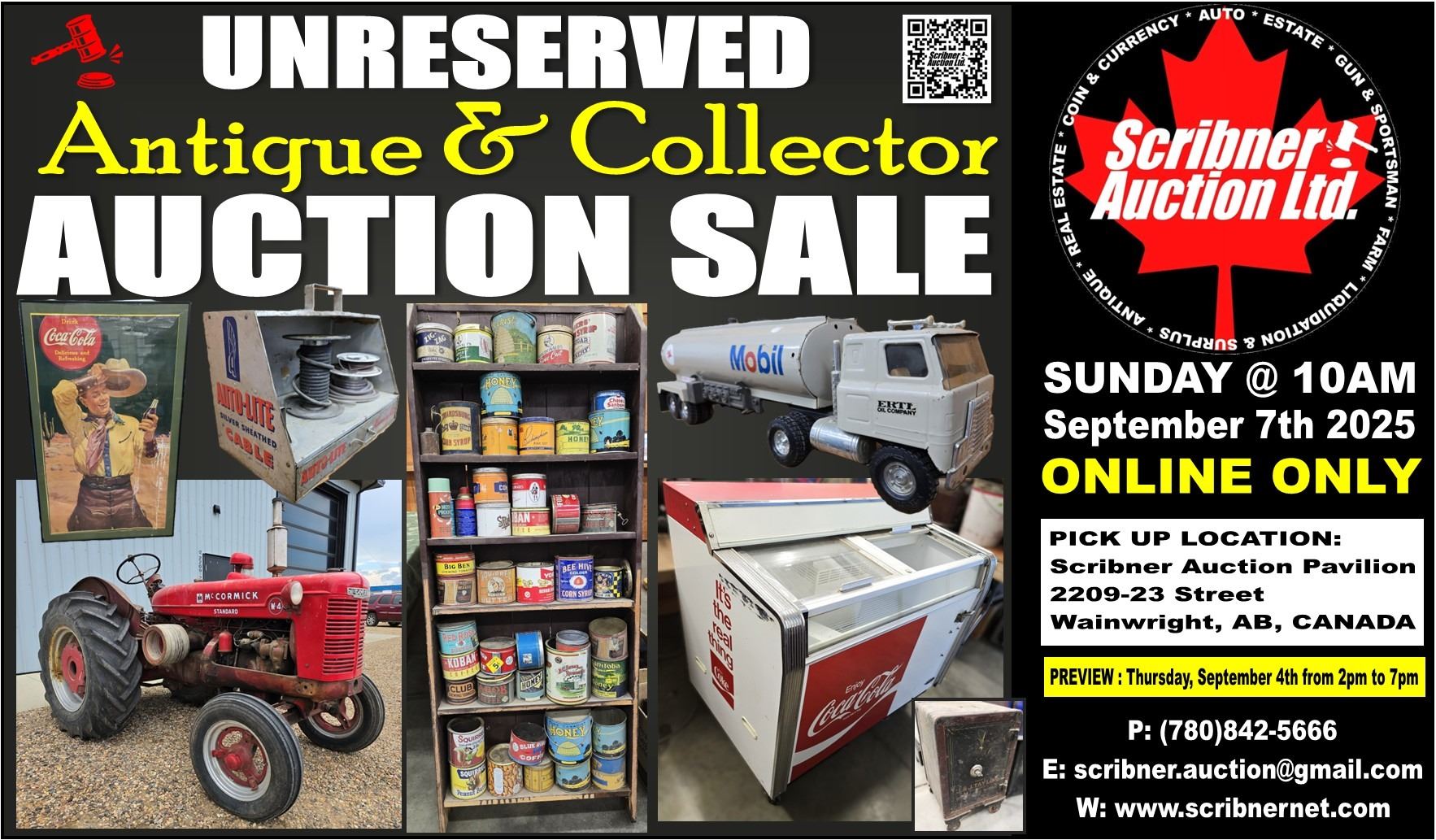 THURSDAY - FRIDAY - SATURDAY - SUNDAY : Purchases will be packaged up after the auction and shipped via Canada Post or PUROLATOR (please let us know which of those 2 Couriers you prefer) within 12-16 days of the auction sale. Please contact us via email (reception.scribnerauction@gmail.com) or call 780-842-5666 prior to the auction if you wish to arrange alternate shipping. Shipping & Handling Charges will be charged to your credit card at the time of shipping. Most packages shipped via Canada Post come with $100 insurance. Please review Canada Post Terms & Conditions & Purolator Terms & Conditions for their respective Insurance Policies. If you want EXTRA Insurance from the carrier, you must instruct our office to purchase additional insurance! Scribner Auction Ltd. will not be responsible for any damage or breakage to any item for any reason (shipping, handling or otherwise). If you wish to arrange for Pick Up at our Wainwright, AB location, please call our office to make an appointment 780-842-5666. You MUST schedule an appointment (NO DROP INS PLEASE!)