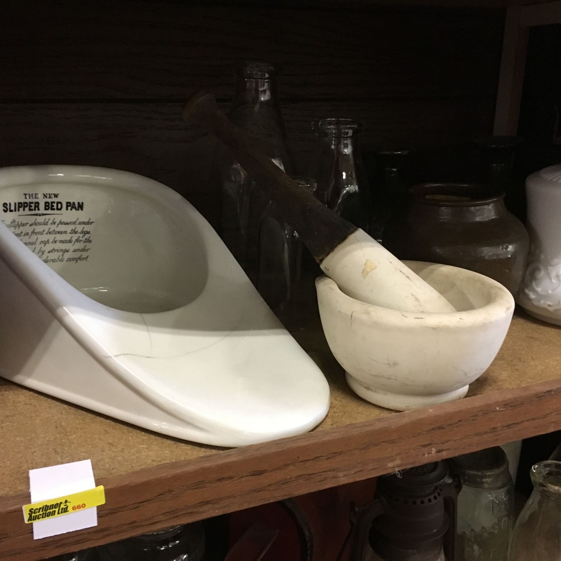 Shelf Lot: "The New Slipper Bed Pan", Milk Glass Lamp & Bottles