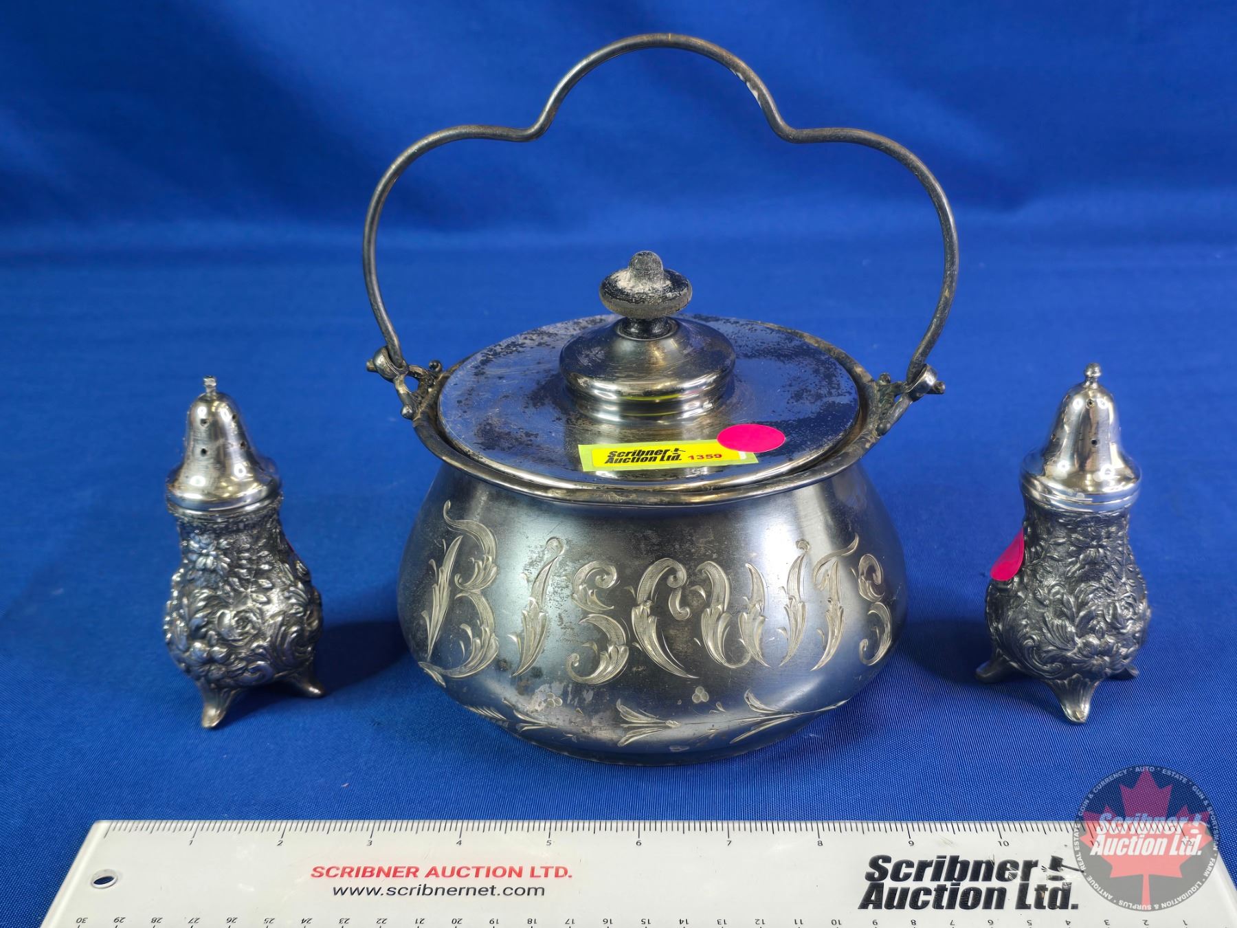 Silver / Silver Plated Service Items : Biscuit Service Bucket & Salt / Pepper Shakers