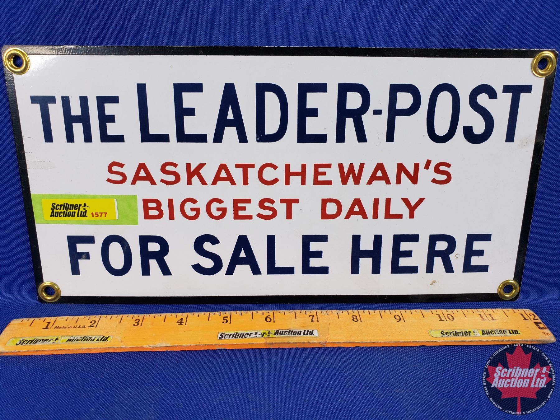 Single Side Enamel Sign "THE LEADER-POST Saskatchewan's Biggest Daily FOR SALE HERE" (6"H x 12"W) (SEE PICS!)