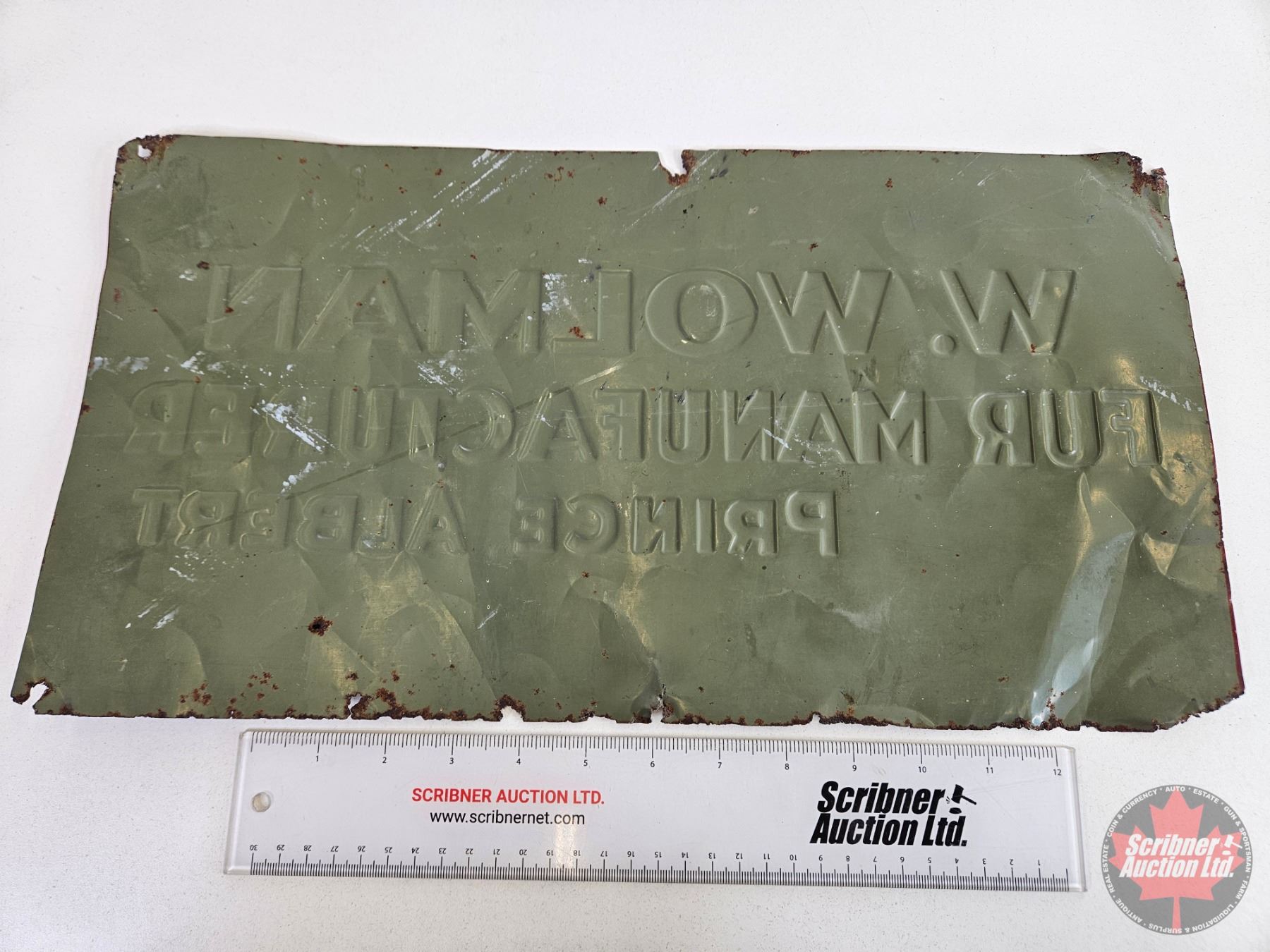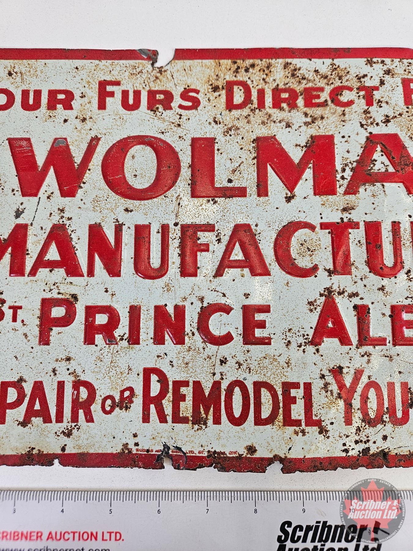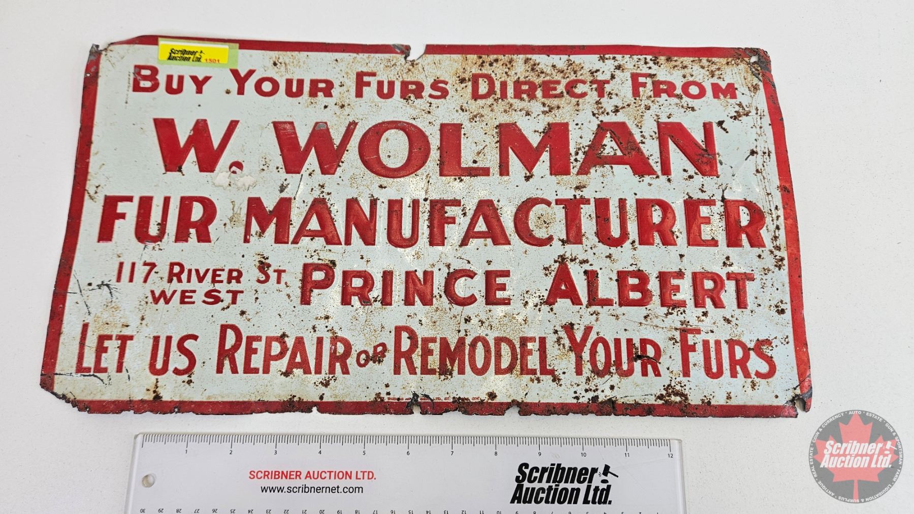 Single Sided Tin Sign "Buy Your Furs Direct from W. Wolman Fur Manufacturer" "Prince Albert"