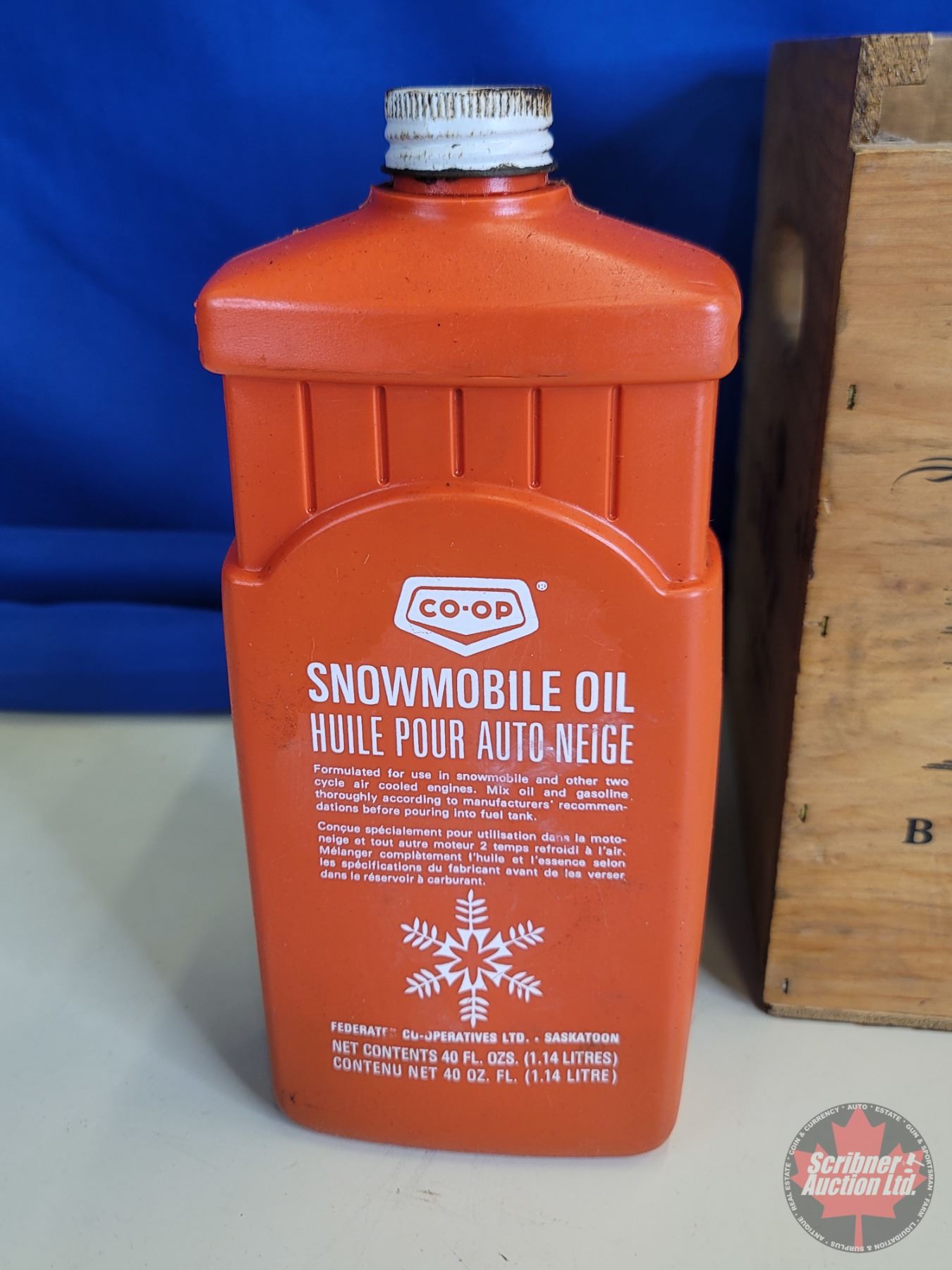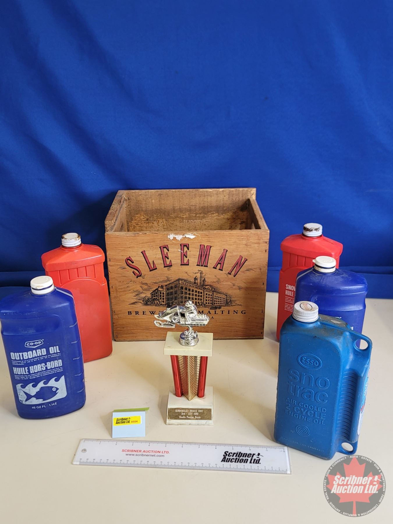 Sleeman Wood Crate w/ Two Stroke Oil Jugs (5) (1 Full) & Snowmobile Trophy