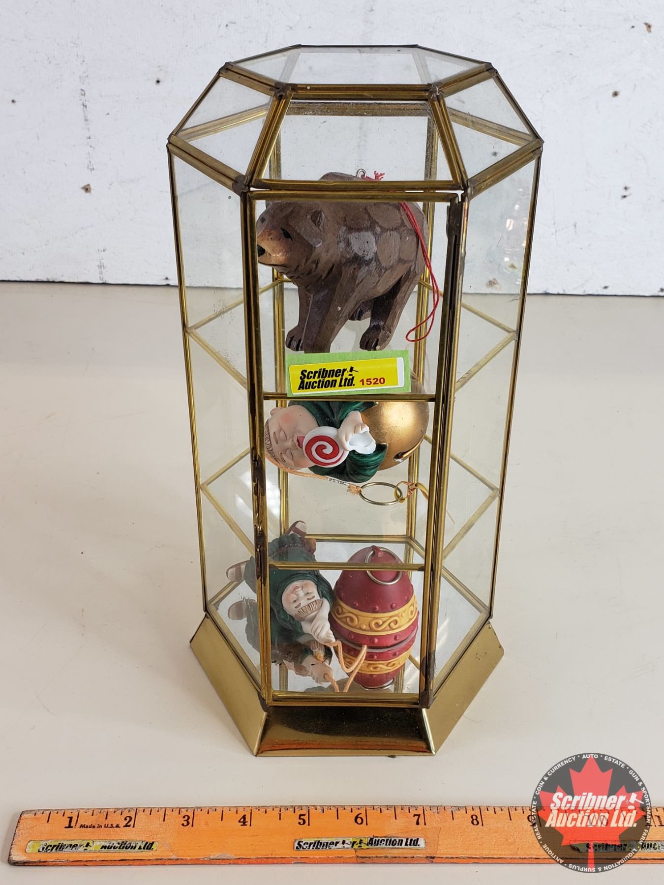 Small Table Top Brass & Glass Curio Cabinet w/Ornaments (12"H x 6"W x 6"D) (SEE PICS!)