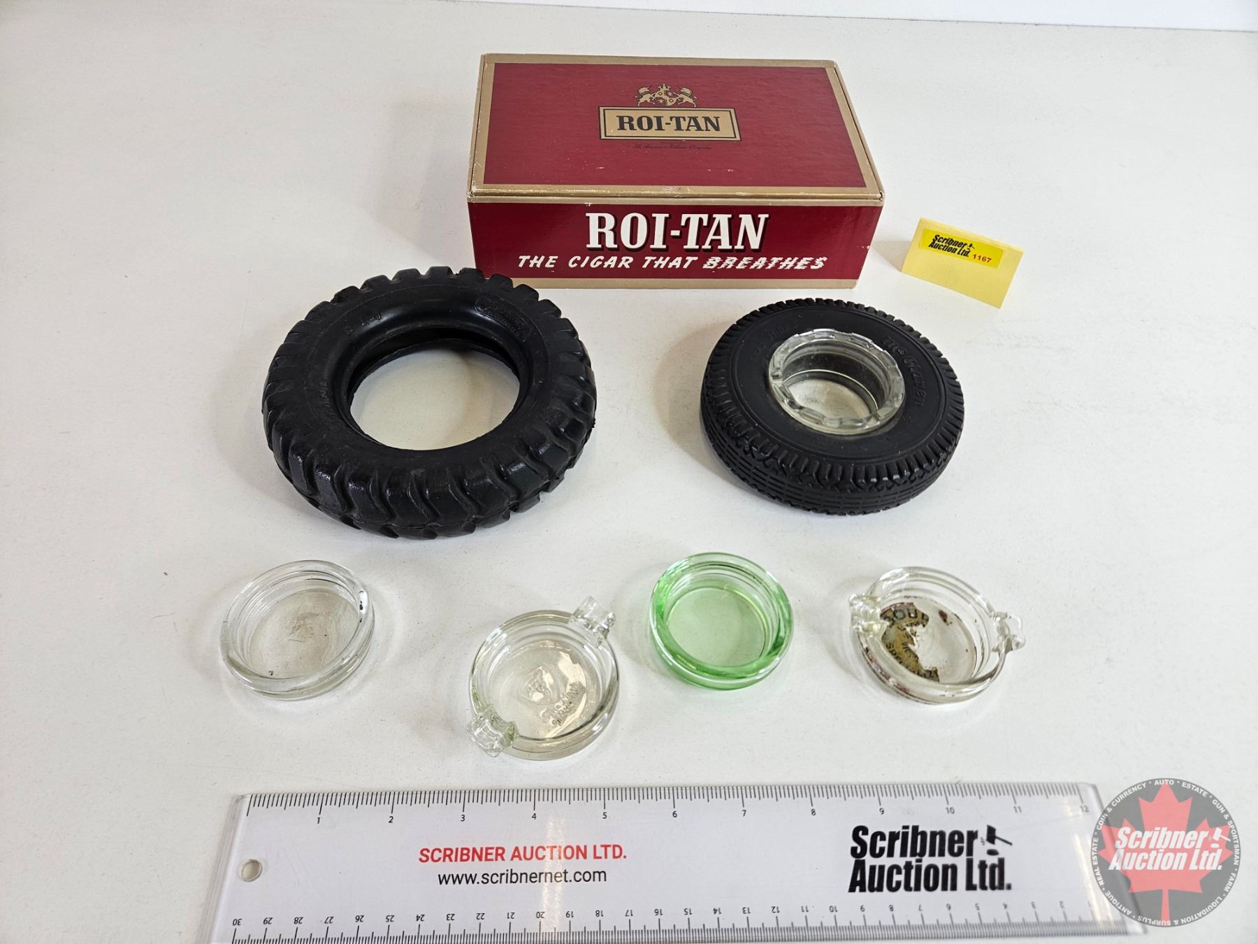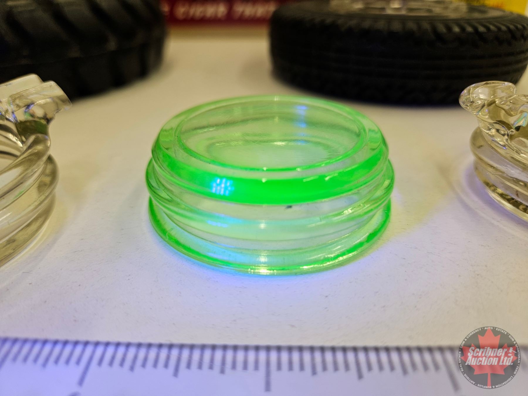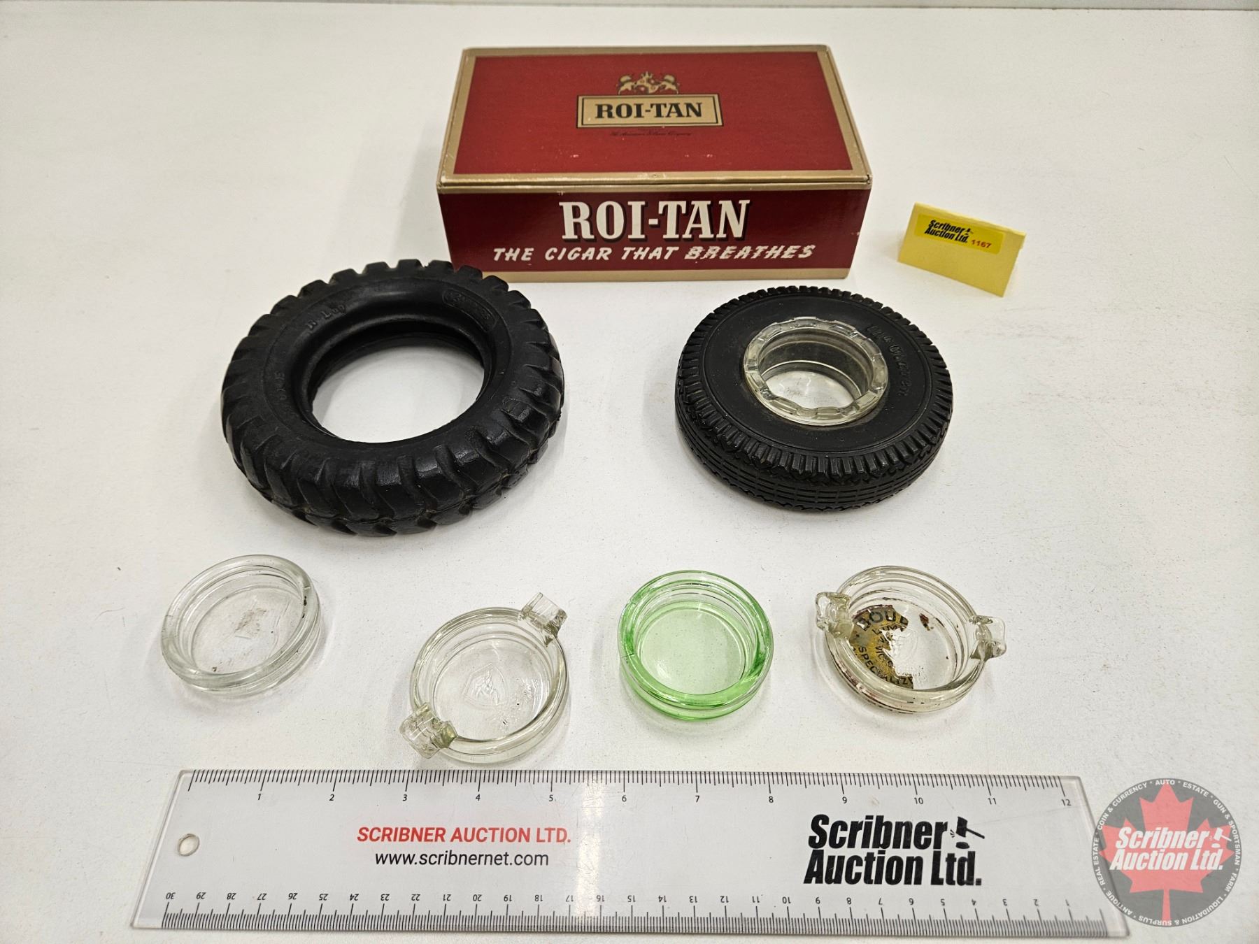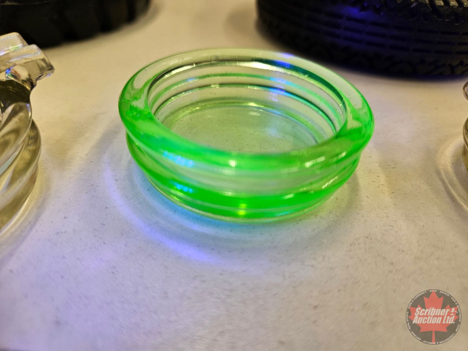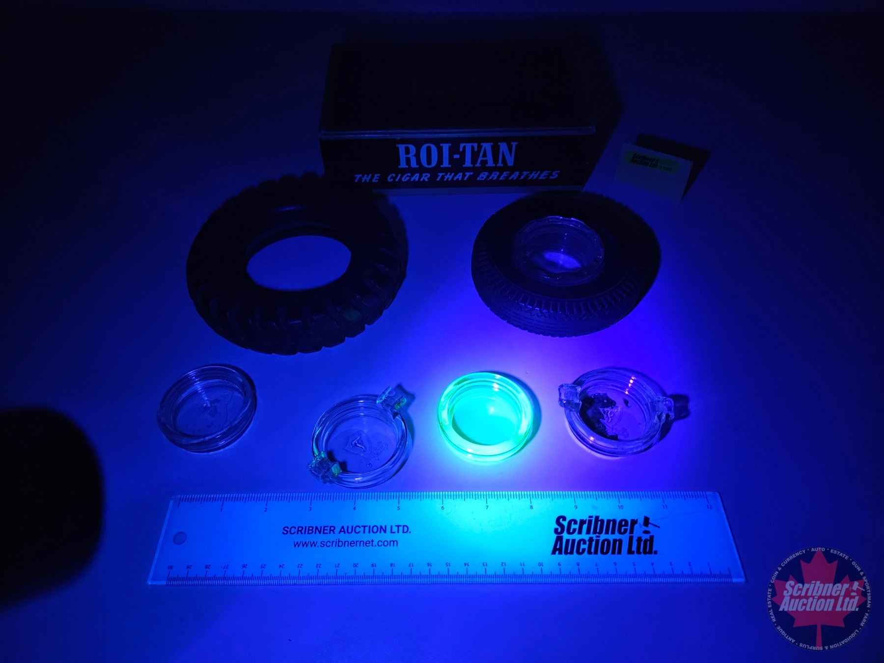 Smokers Collector Combo : Uranium Glass Ashtray Inserts ; Tire Ashtrays; Cigar Box; Ashtray Inserts
