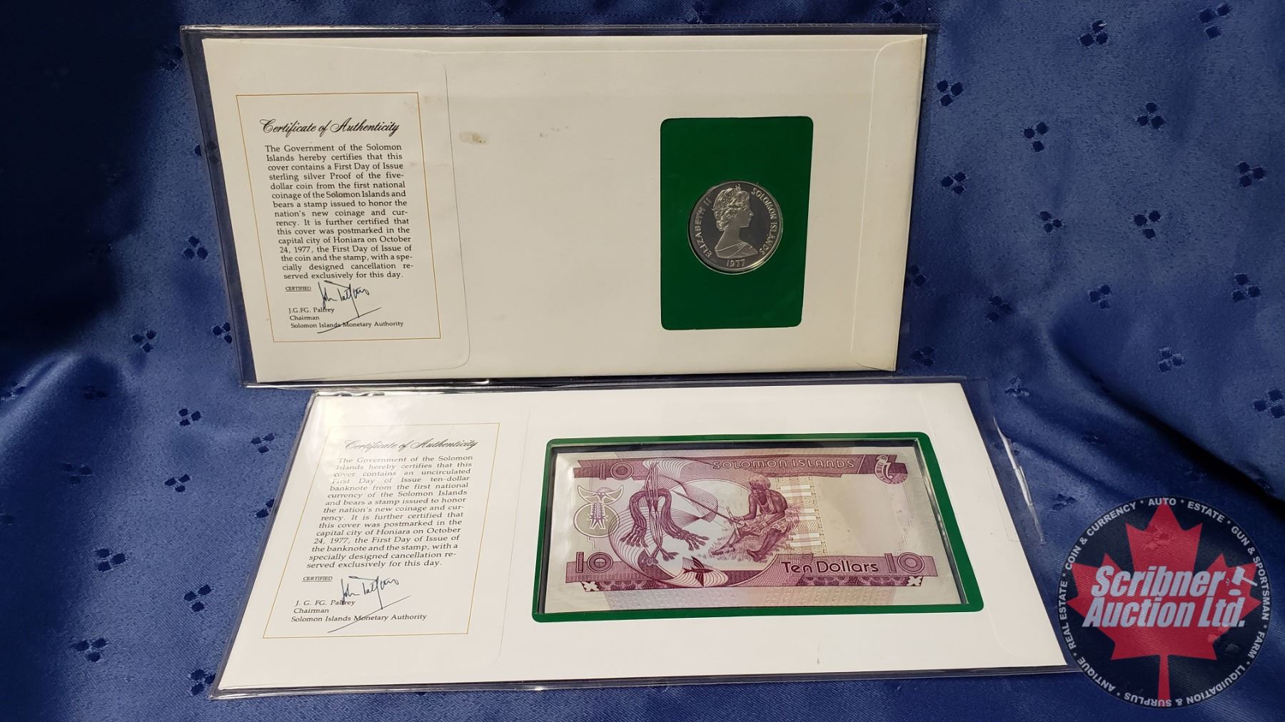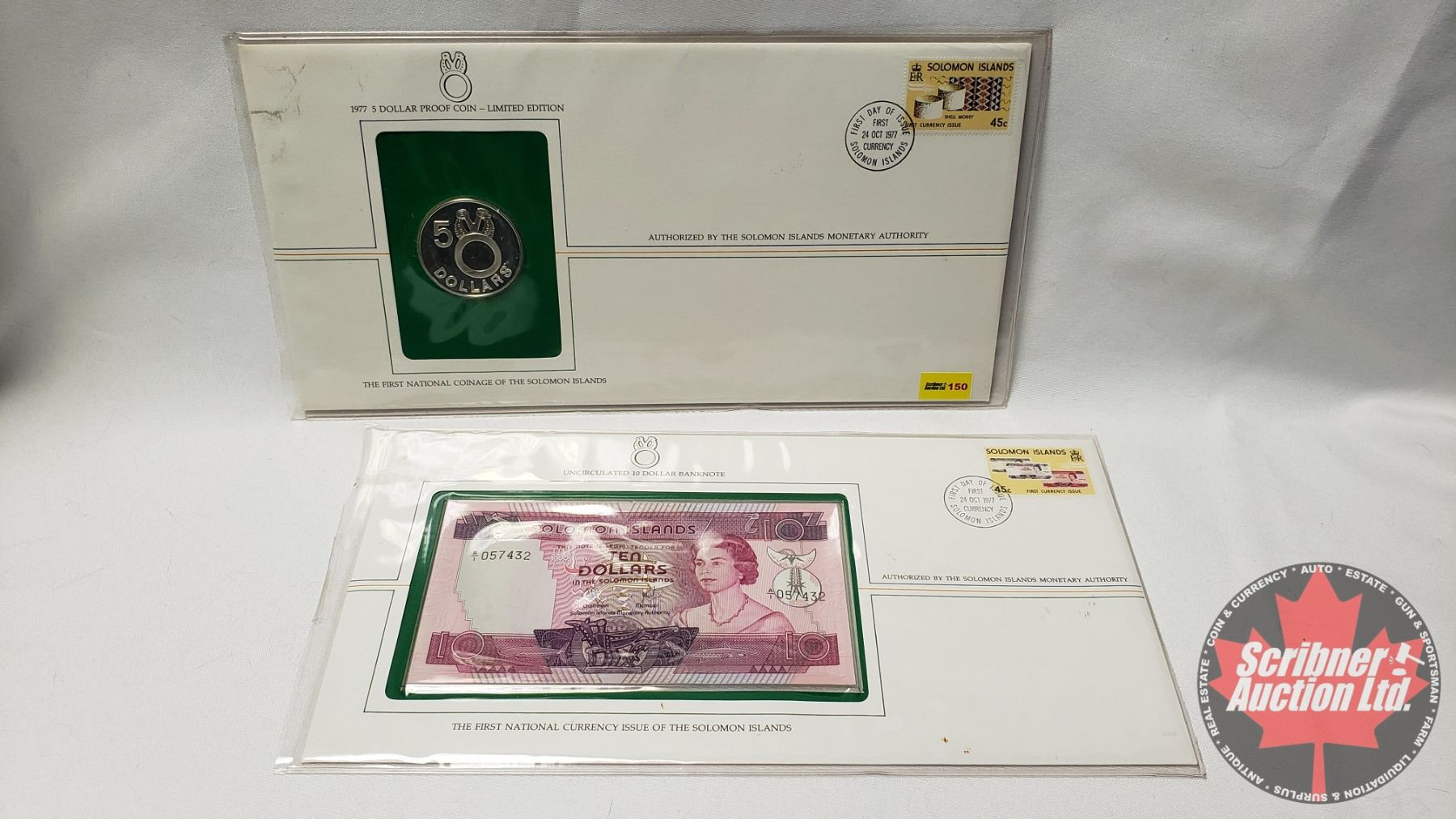 Solomon Islands Collector Items (2): Uncirculated 10 Dollar Banknote & 1977 Five Dollar Proof Coin - Limited Edition