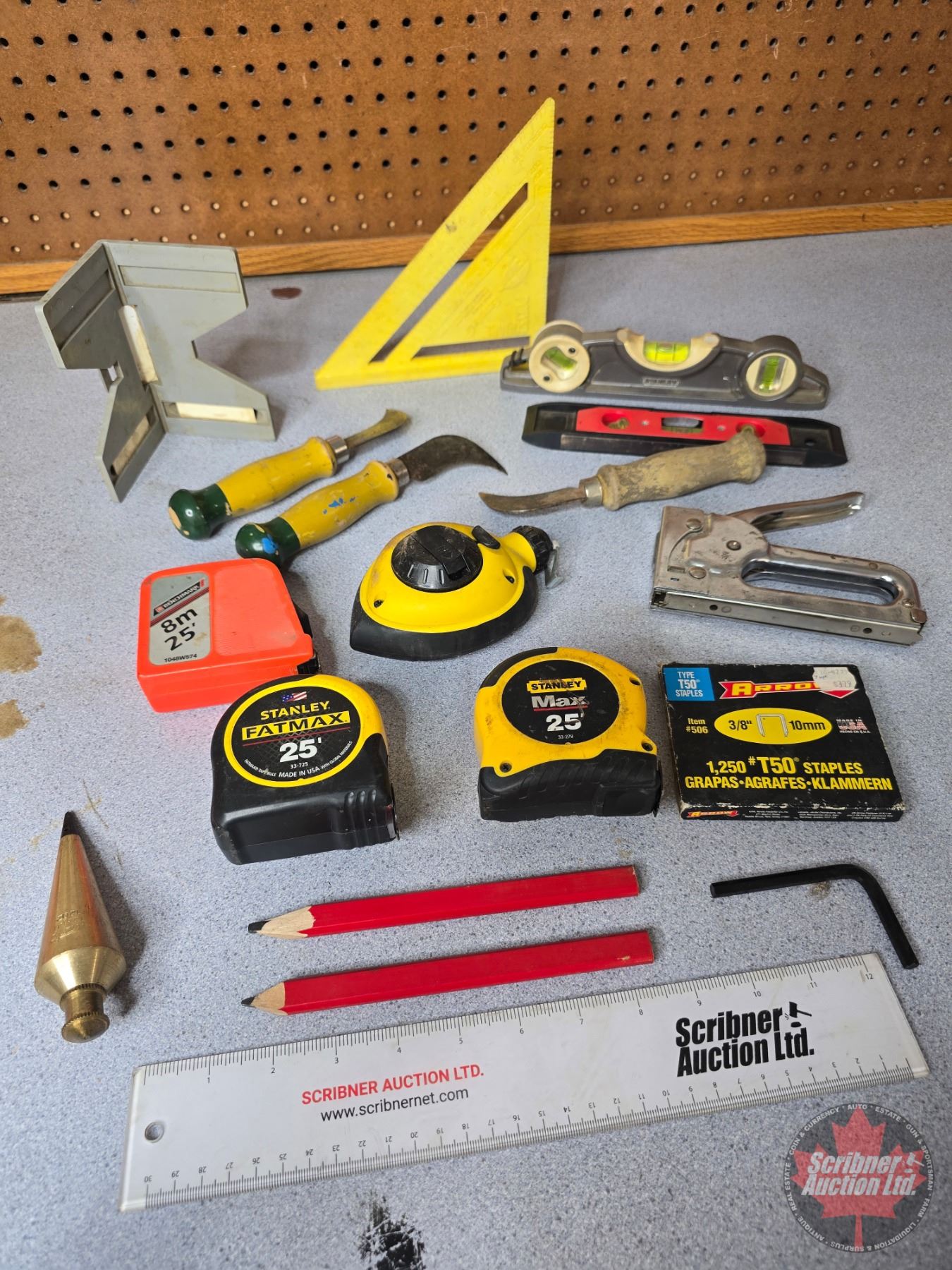 Speed Square, Post Leveler, Calk Line, Tape Measures, etc