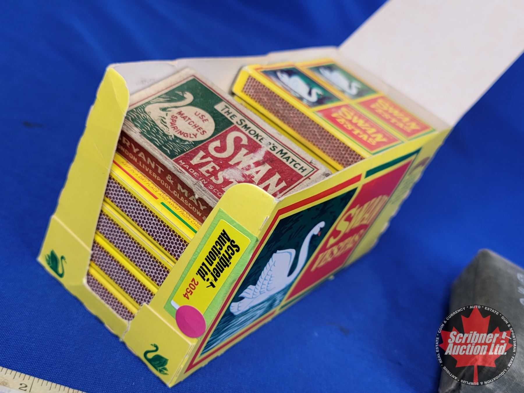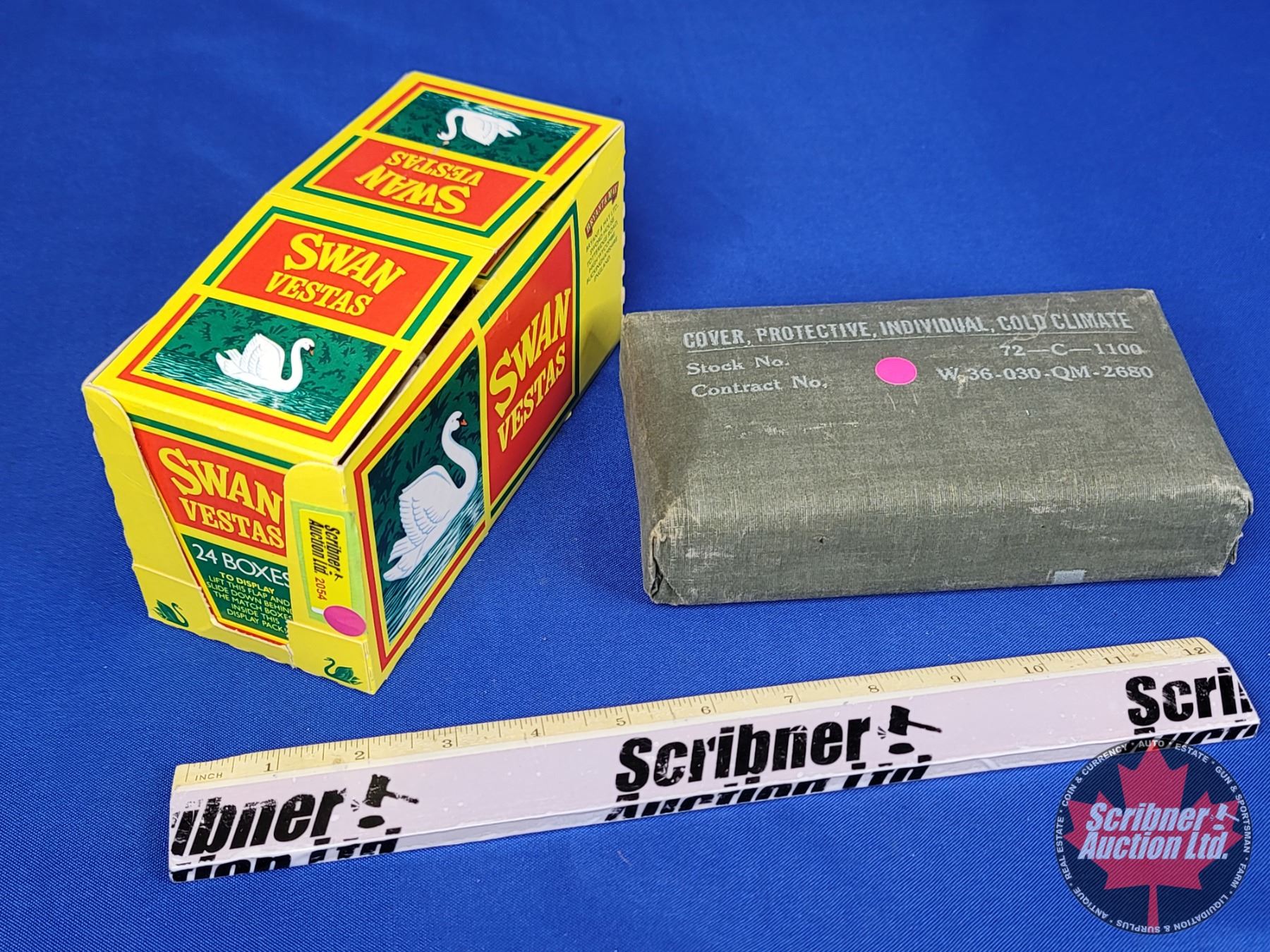 Swan Vestas Store Sales Box w/16 Full Boxes & 1 Antique Box (Partially Full) c/w Military Individual Cold Climate Protective Cover (Cover : 2"H x 7-1/4"W x 4"D) (Swan Box : 3-3/4"H x 3-1/4"W x 7-1/2"D) (SEE PICS!)