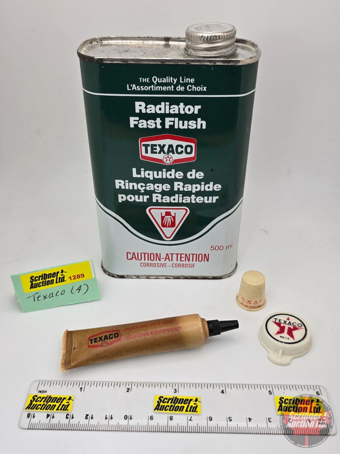TEXACO Collector Combo: (4) Radiator Flush Tin; Thimble; Oil Pen & Cap