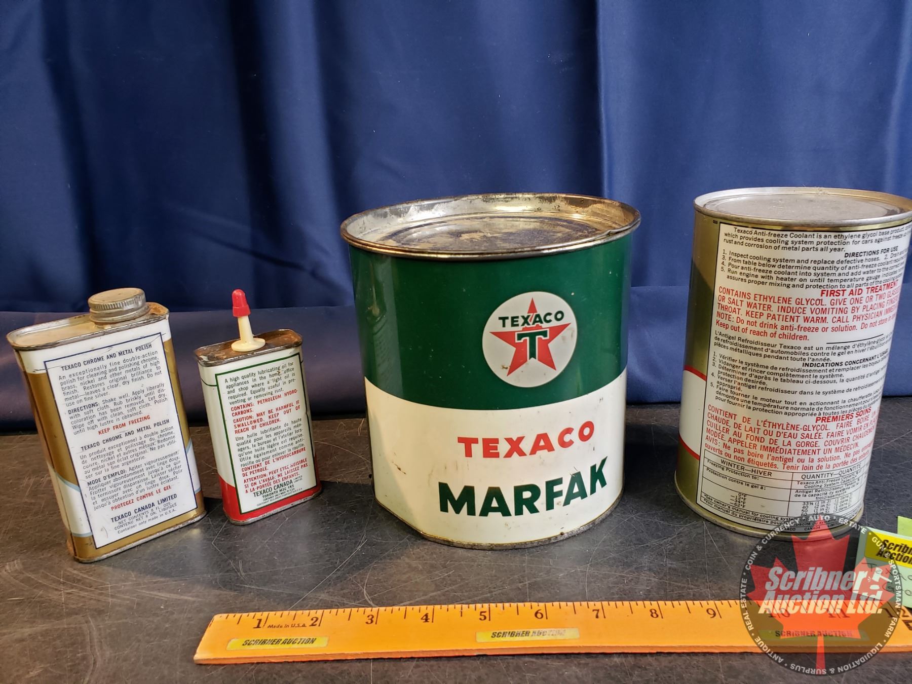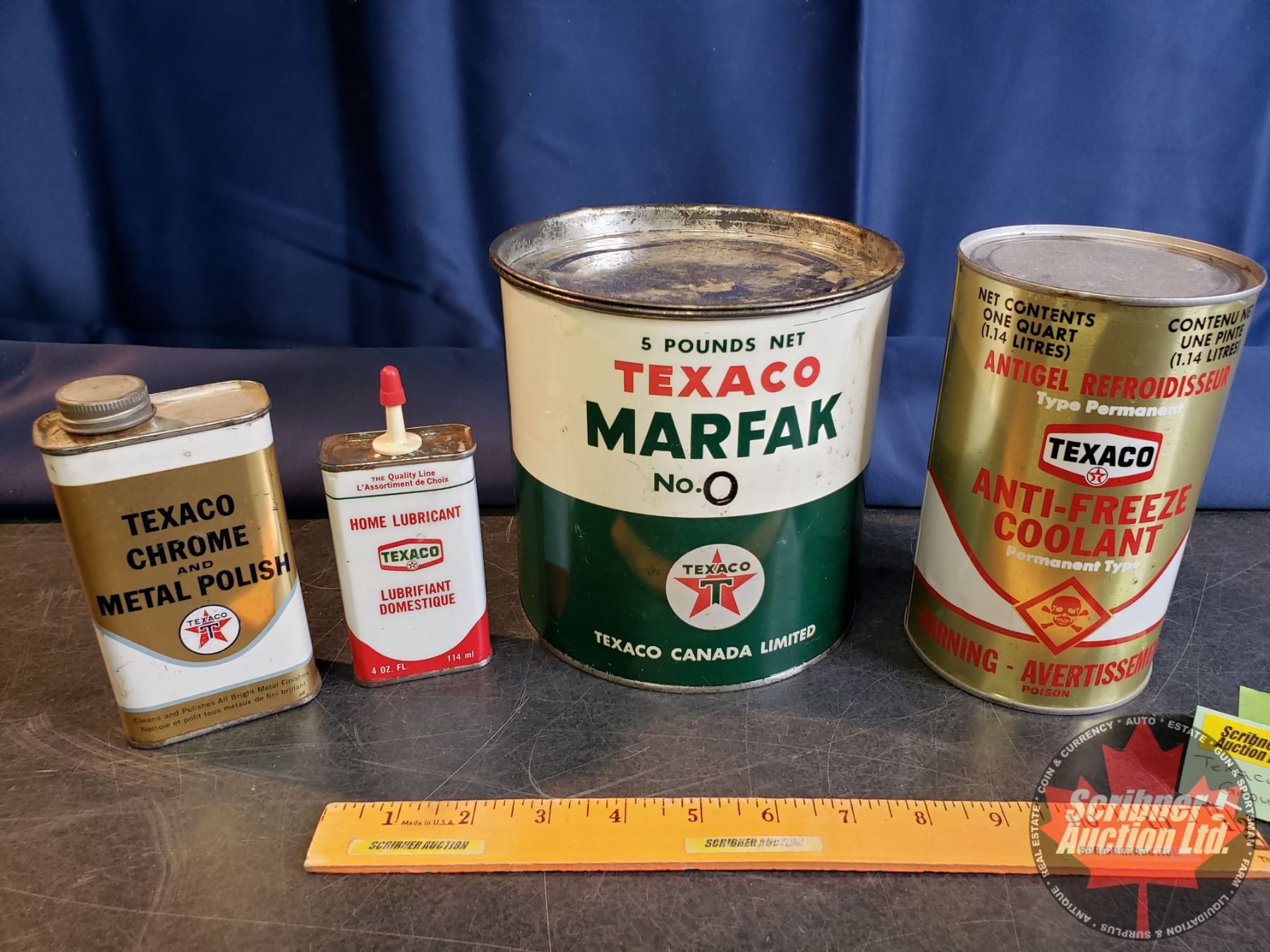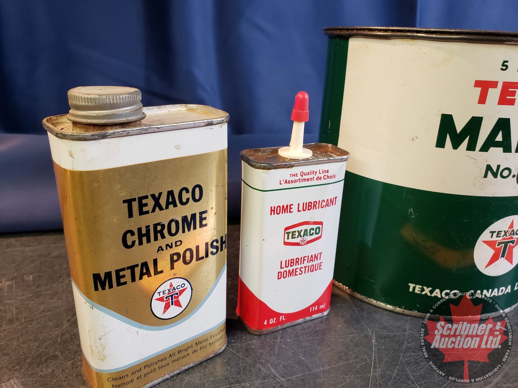 TEXACO Combo : 5 Pound Grease Tin, Home Lubricant Tin, Anti-Freeze Coolant, Chrome Polish (All Parti