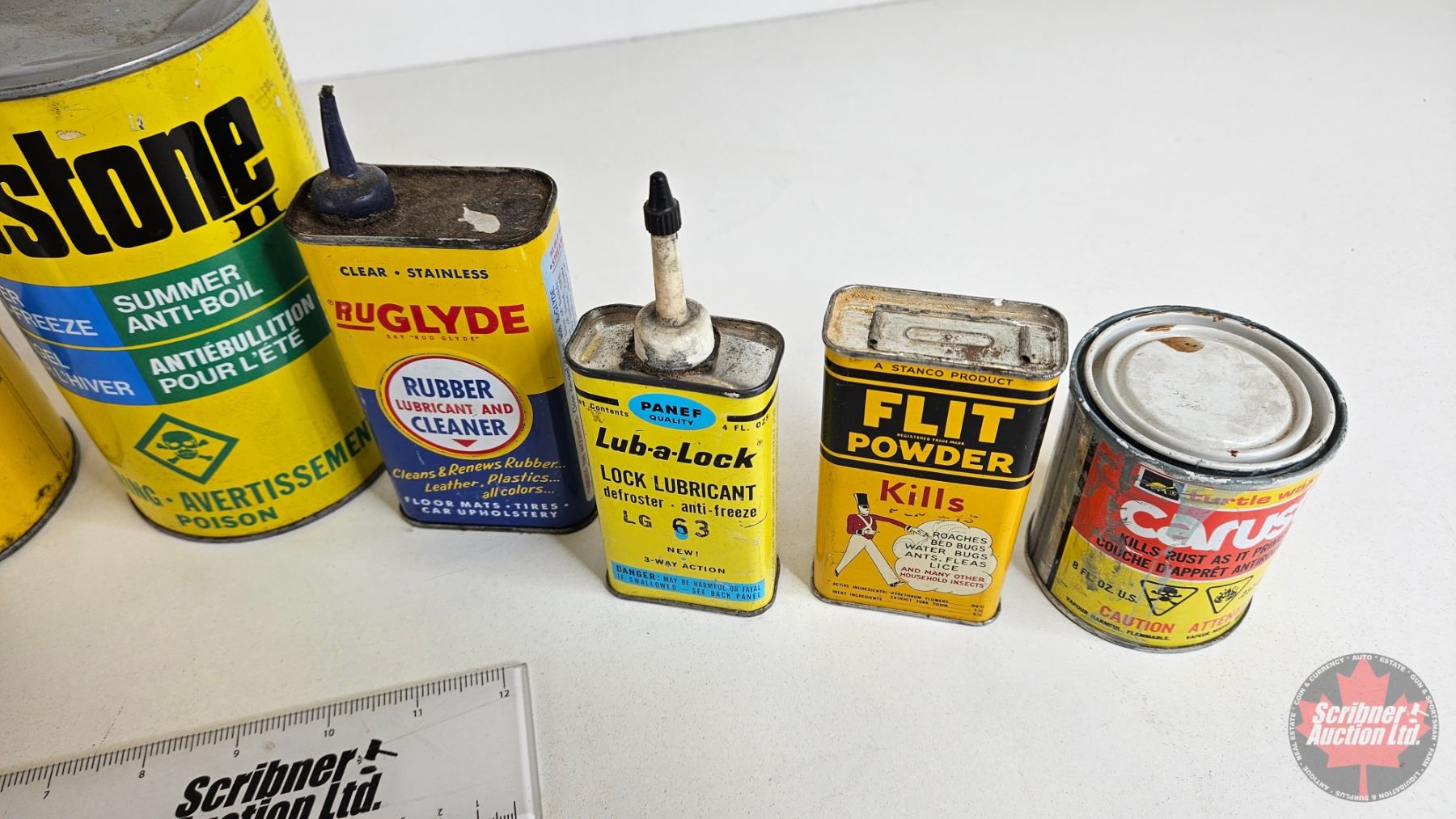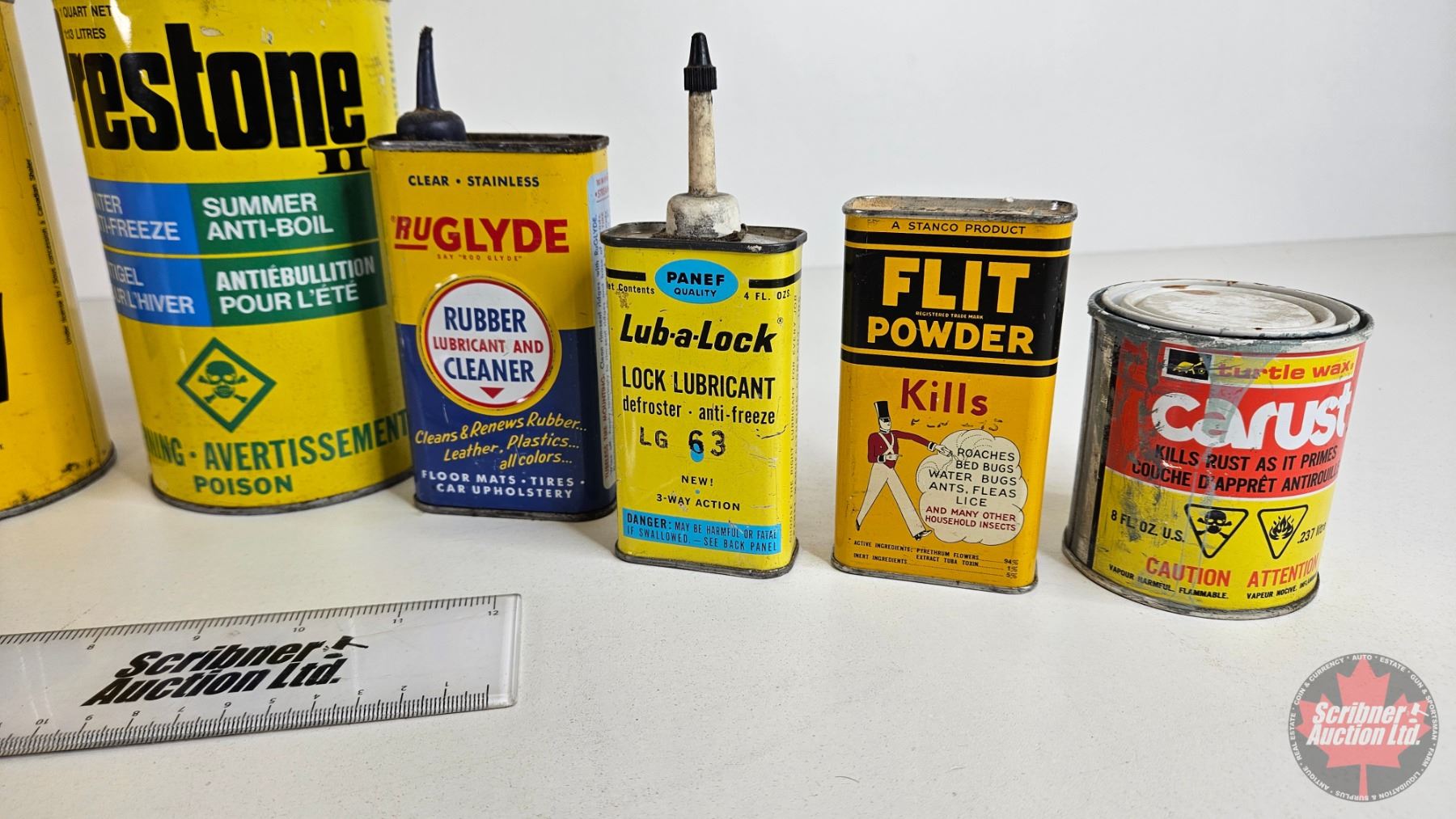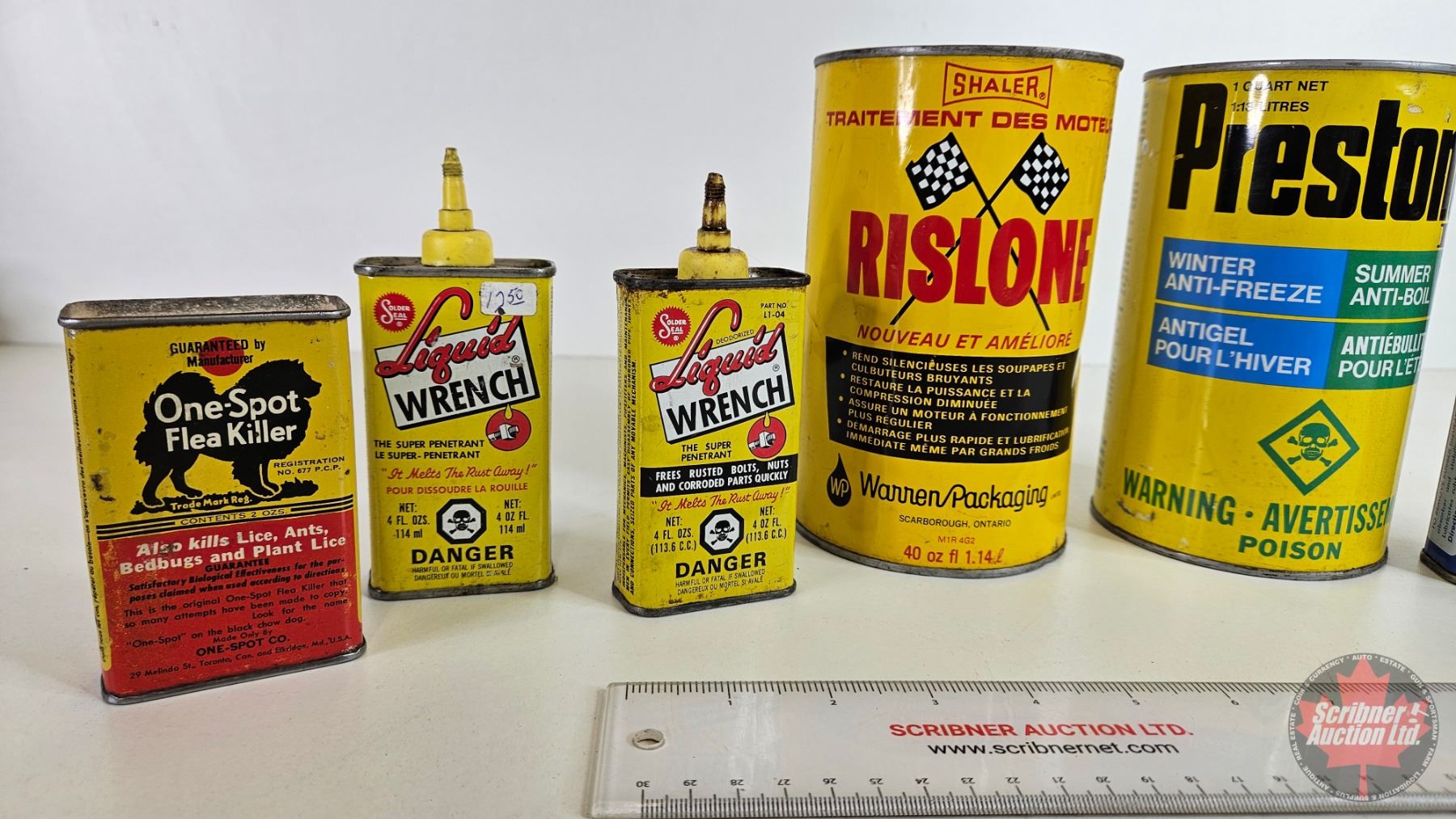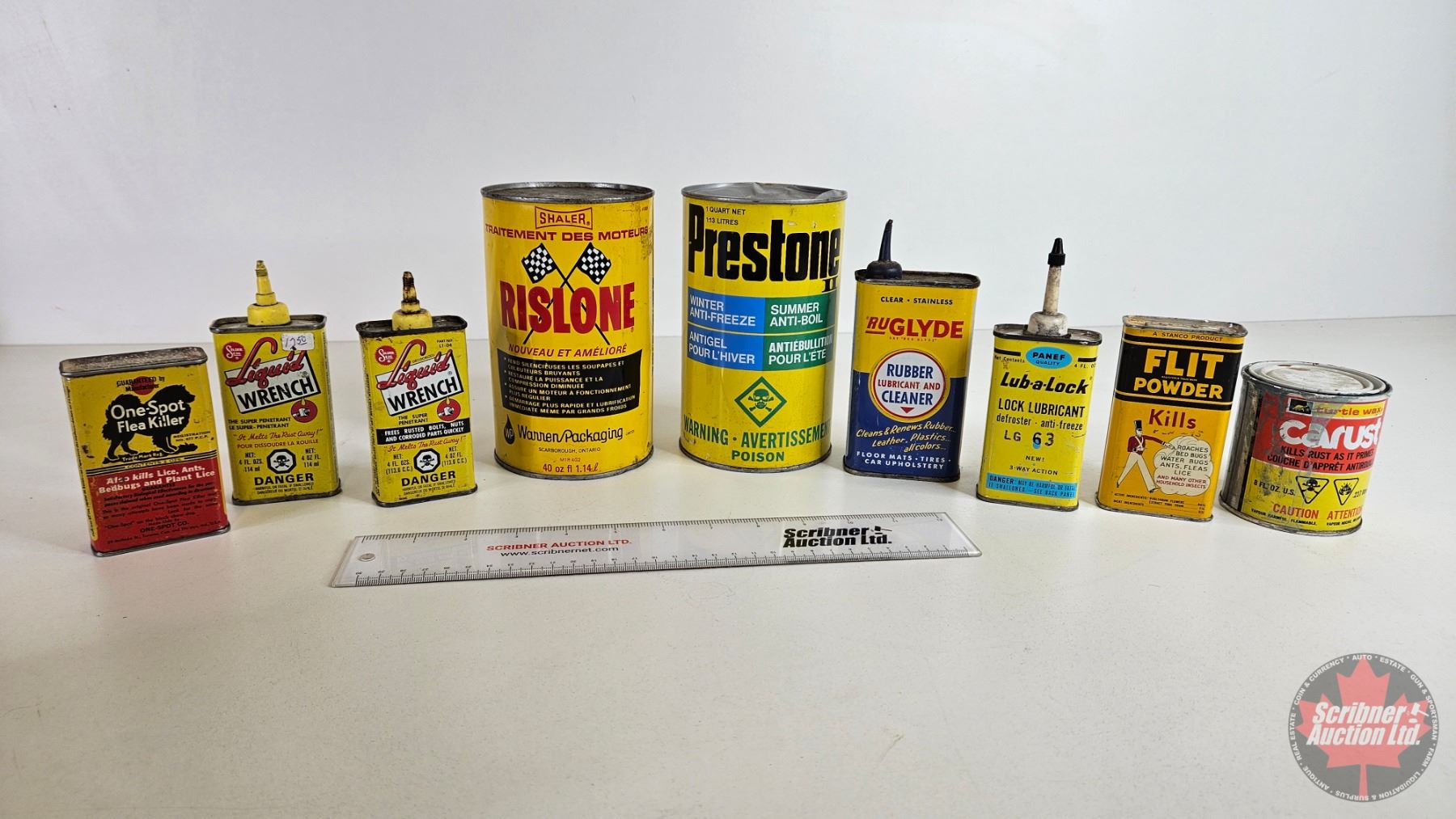 Tin Collection : Prestone Anti-Freeze (Full) ; Rislone; Flit Powder; Liquid Wrench; etc!