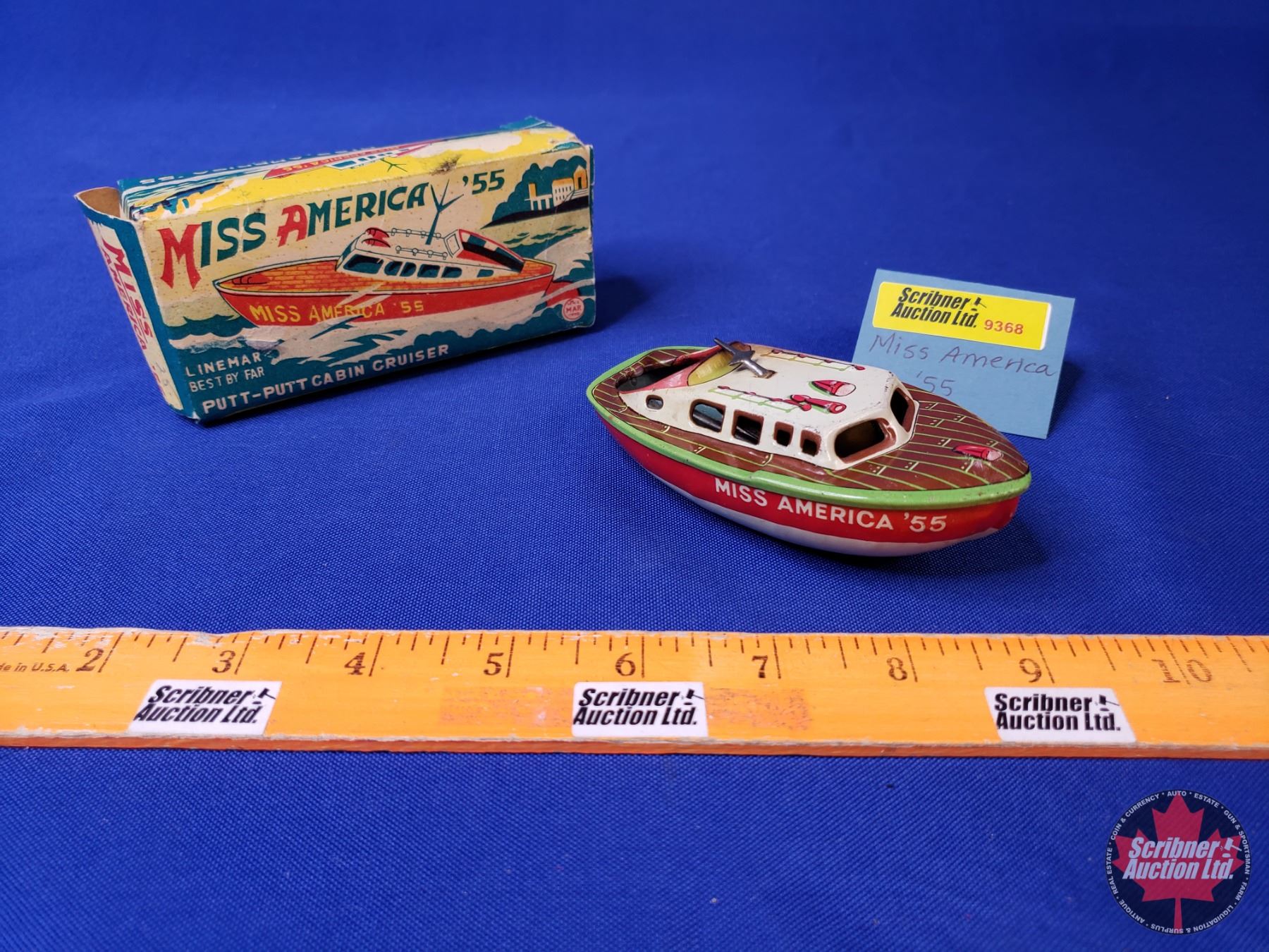 Tin Toy MISS AMERICA '55 PUTT-PUTT CABIN CRUISER (LINEMAR Best by Far) w/Orig Box (Box Measures: 2"H x 4-1/2"W x 1-1/2"D) (SEE PICS!)