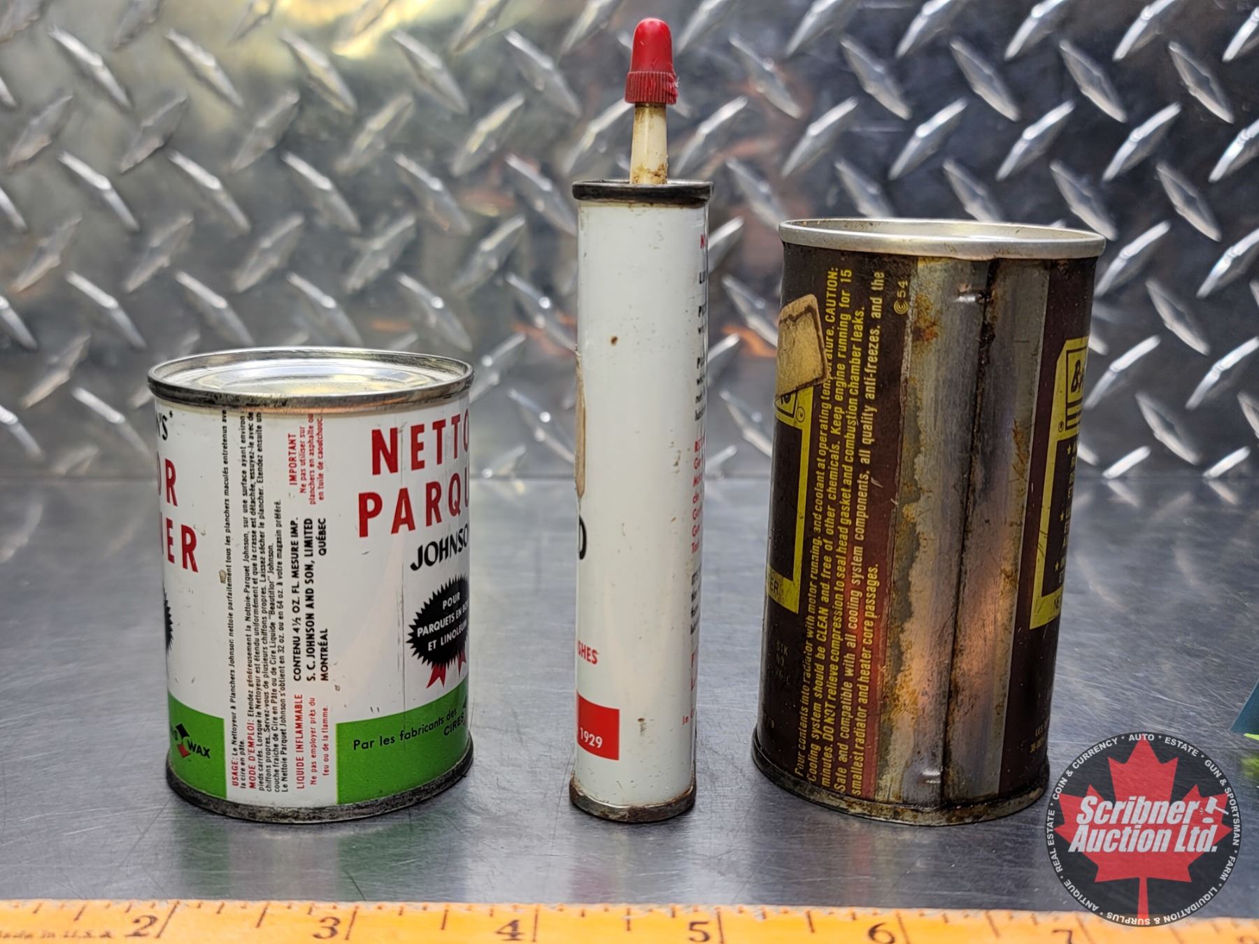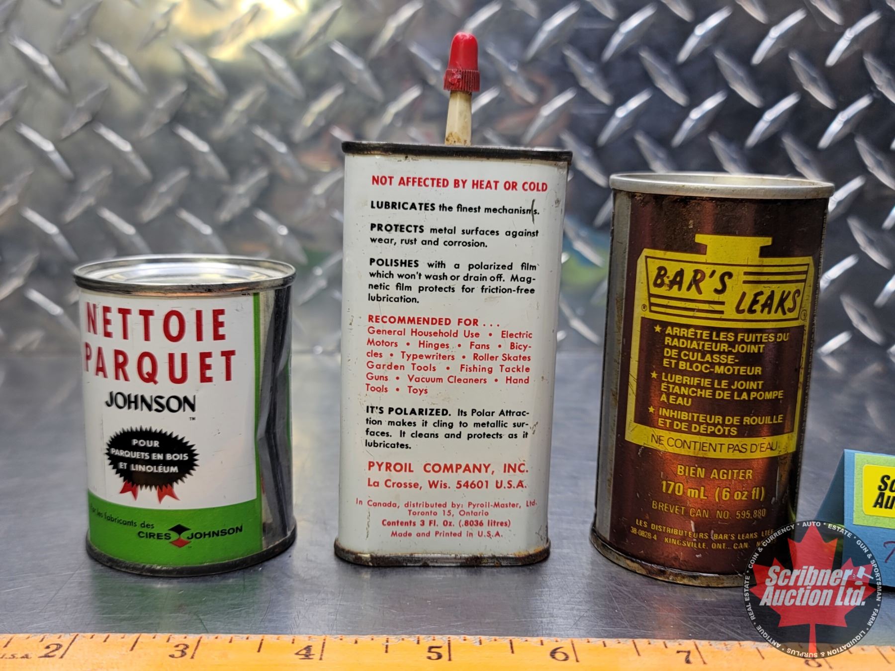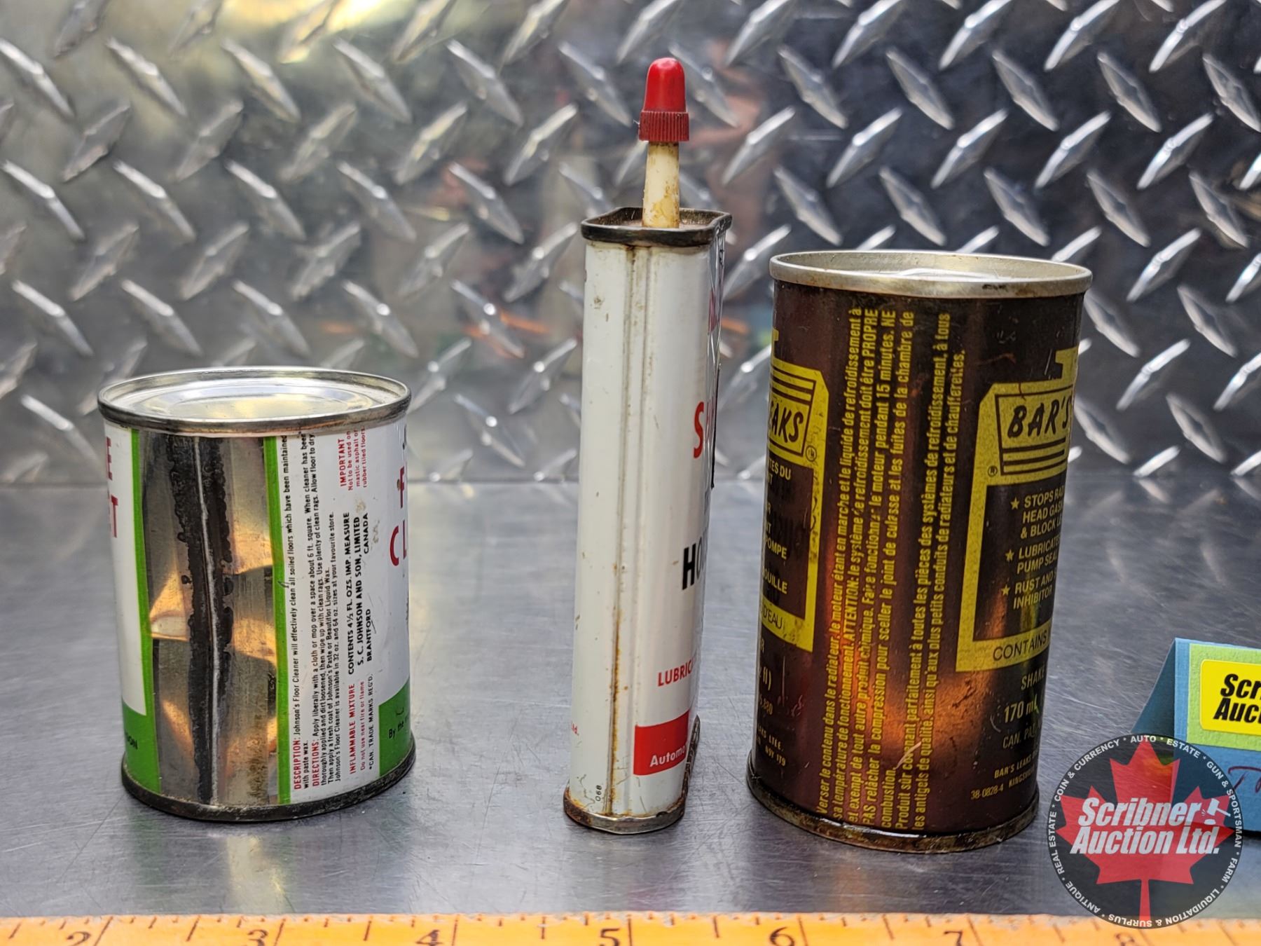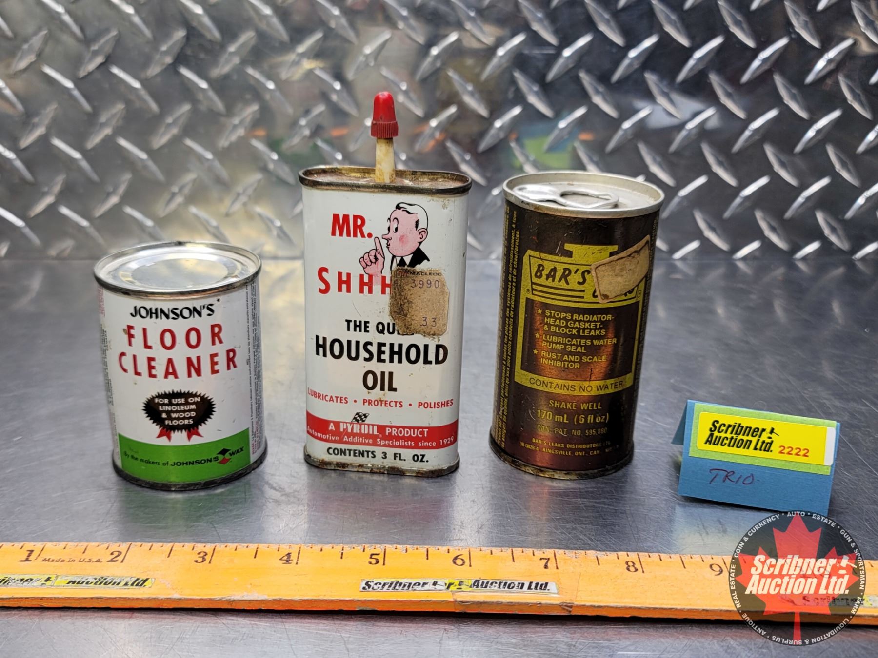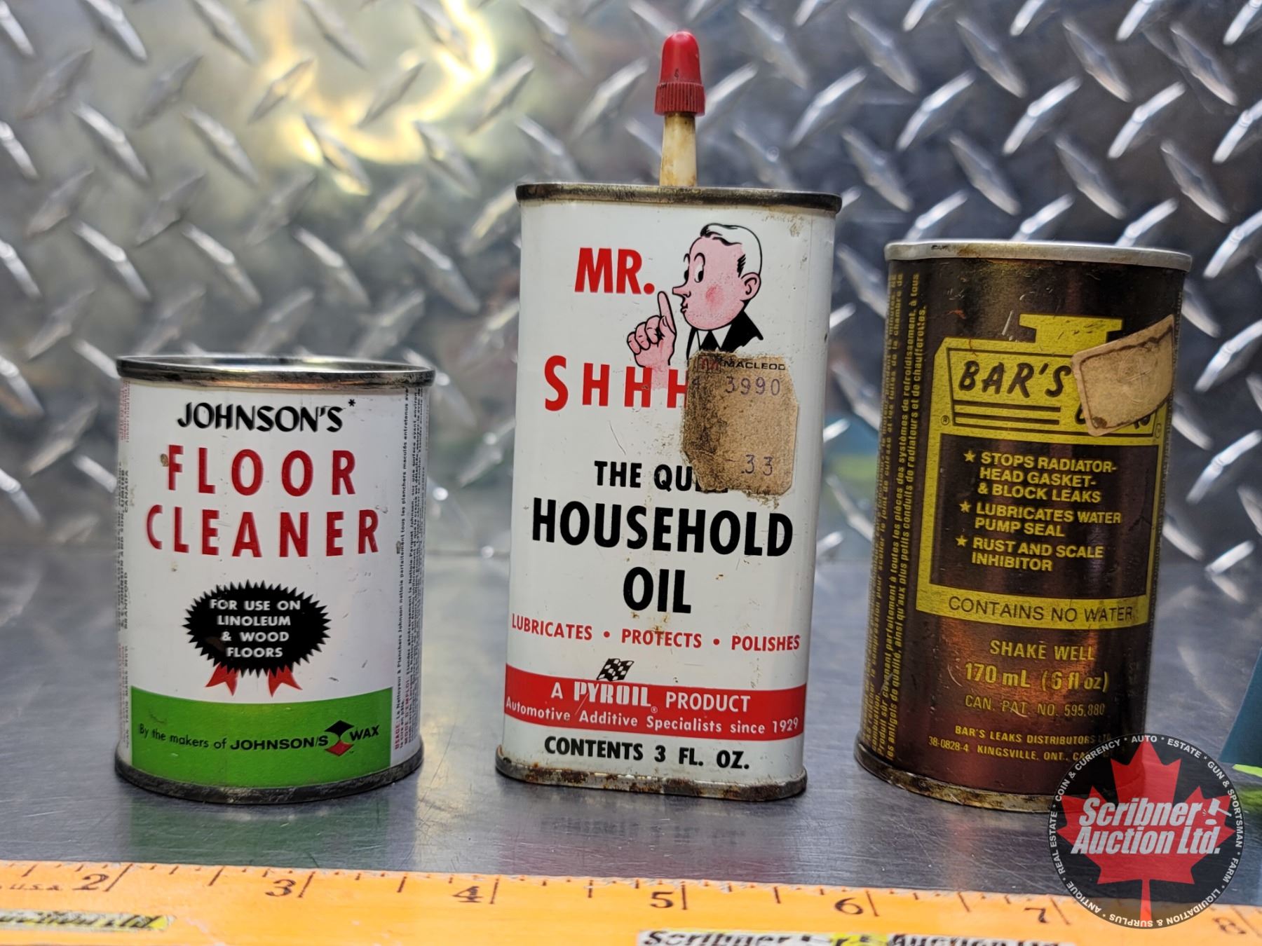 Tin Trio : Johnson's Floor Cleaner (Full), Mr. Shhh Household Oil (1/2 Full) & Bar's Leak (Died Up)(Largest Measures : 5-1/4"H) (SEE PICS!)