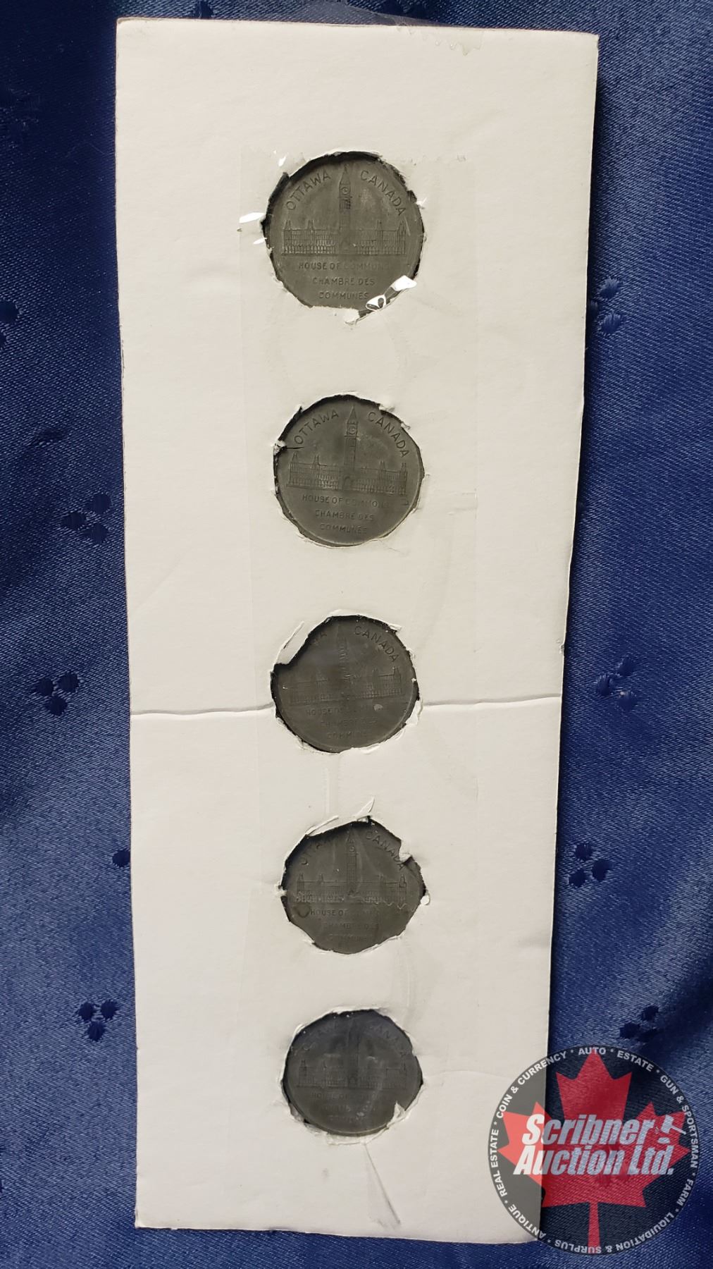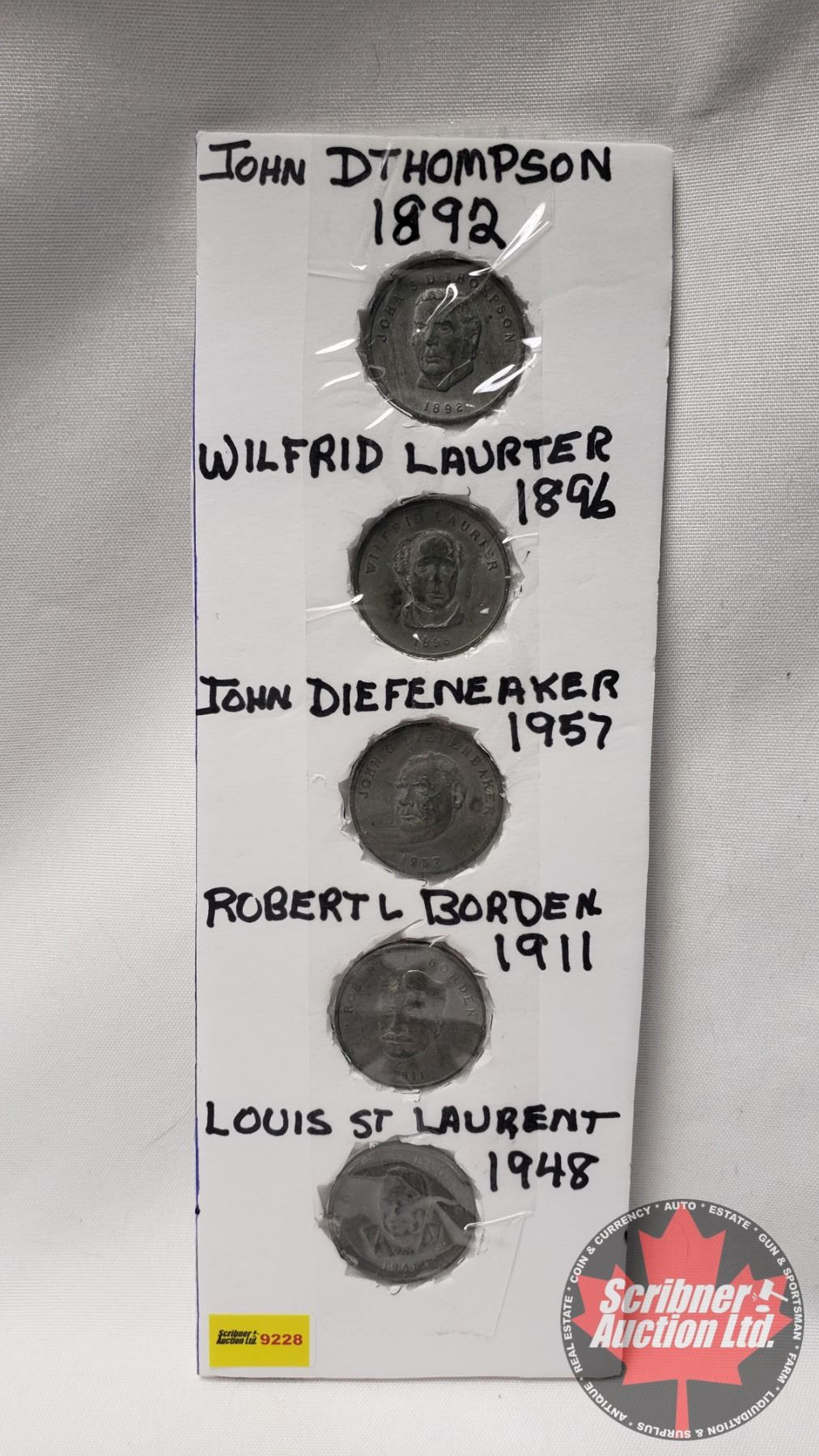Tokens: Ottawa Canada House of Commons (John S D Thompson 1892, Wilfrid Laurier 1896, John Diefenbaker 1957, Robert L Borden 1911, Louis St-Laurent 1948)