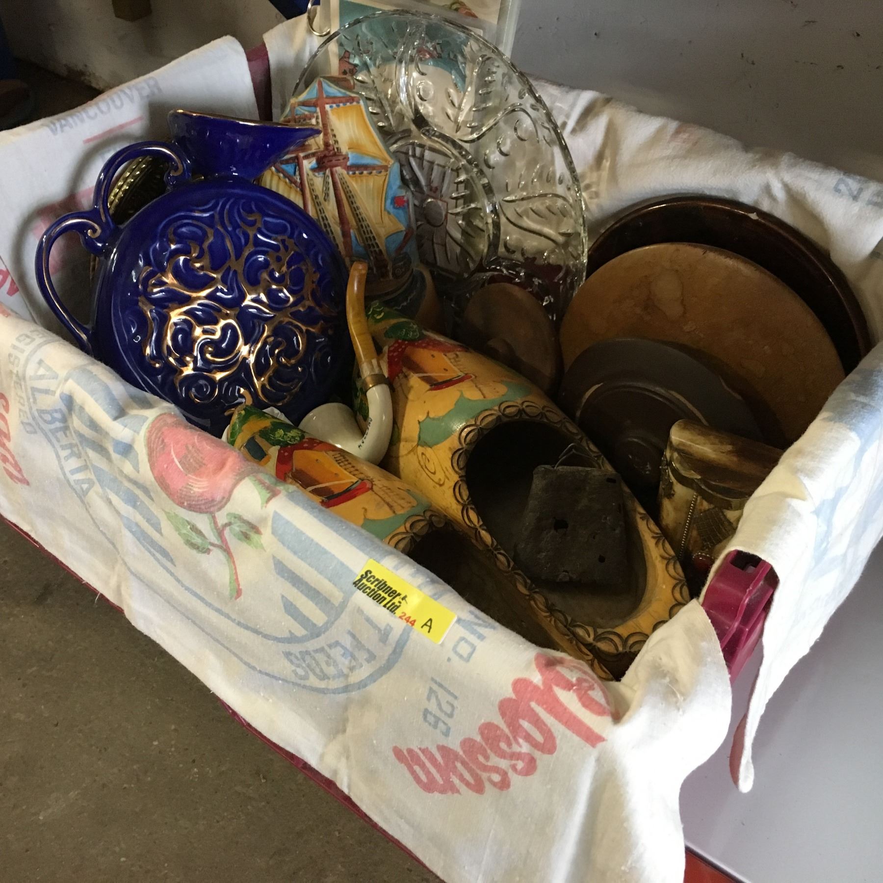 Tote Lot: Wooden Dutch Shoes, Pipe, Bell, Crock Lids, Decanters, Flour Sacks, etc !