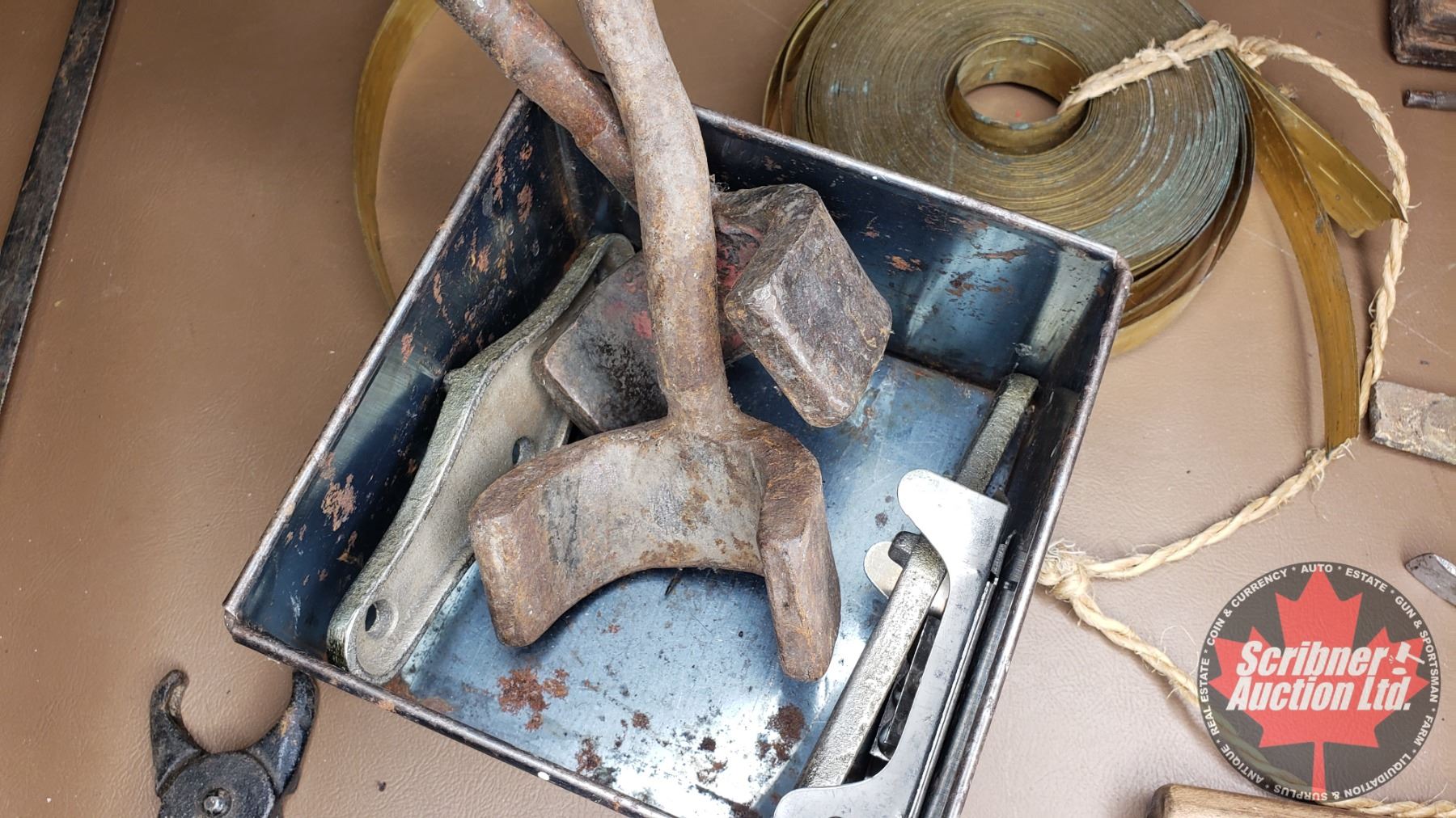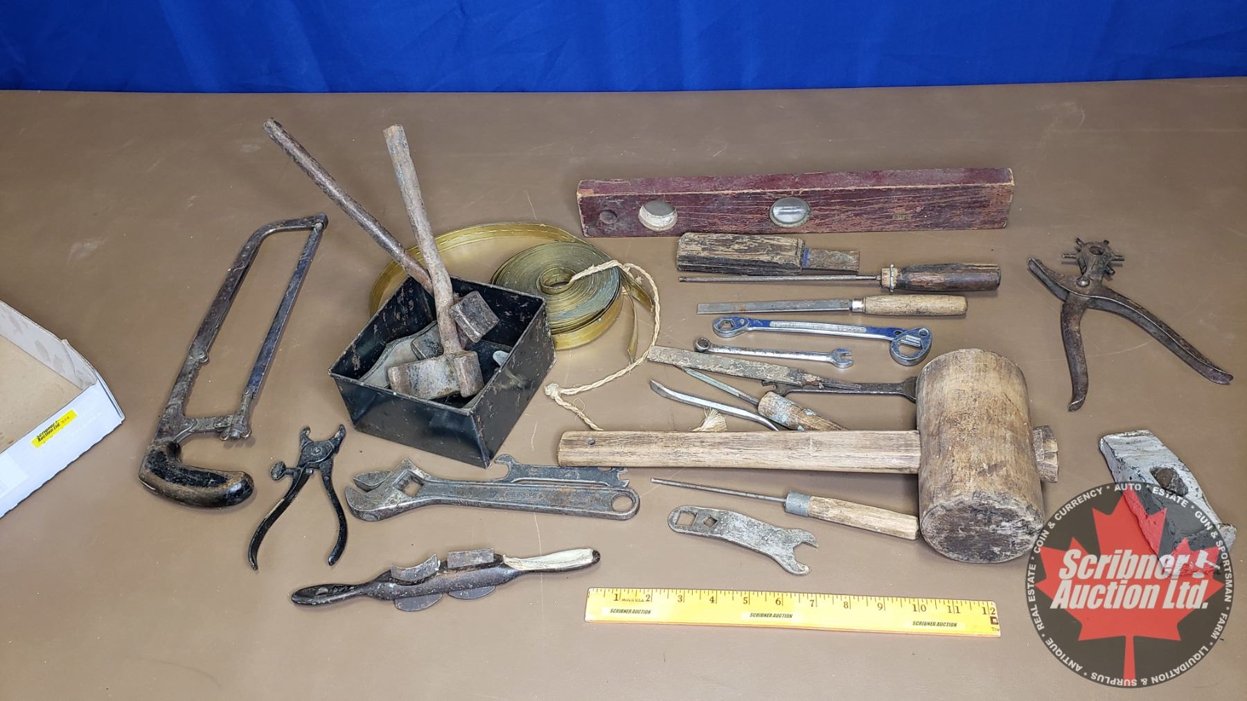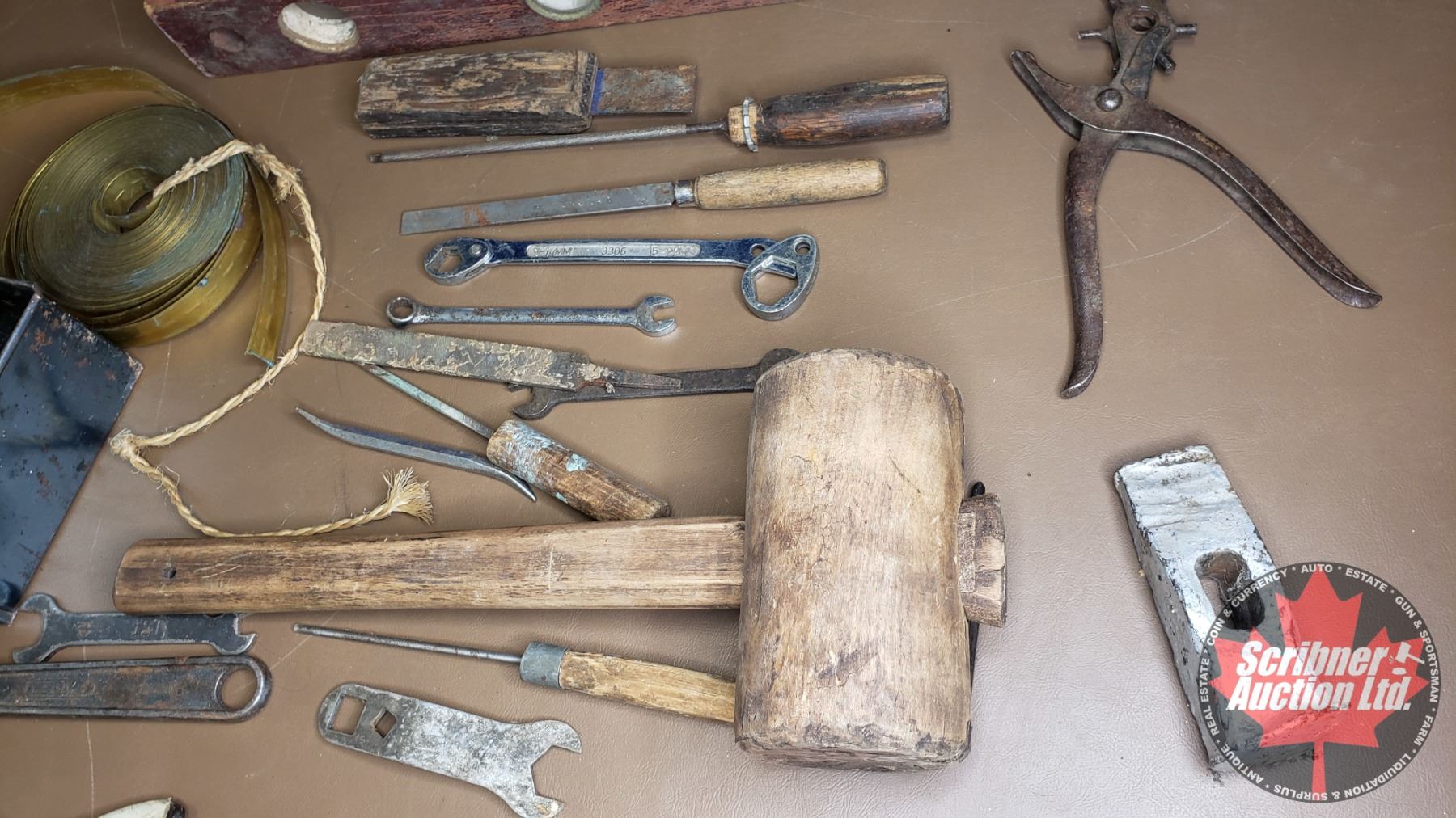 Tray Lot: Antique Tools (Wooden Mallet, Spoke Shaver, Wagon Hug Wrenches, etc)
