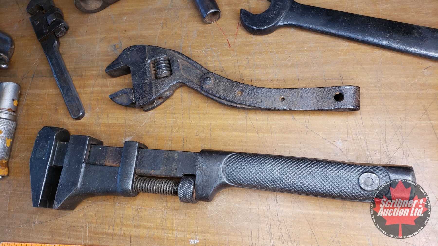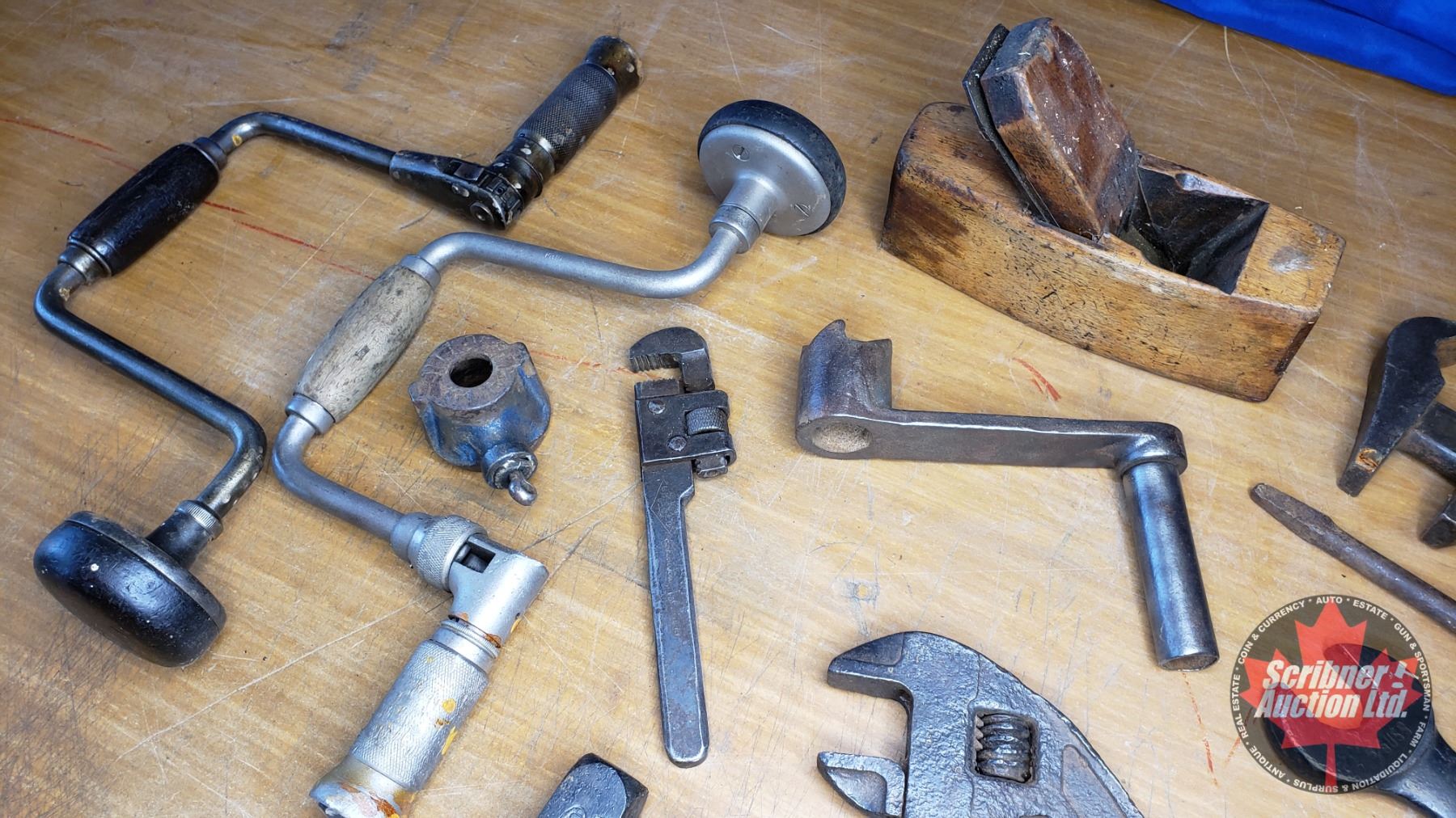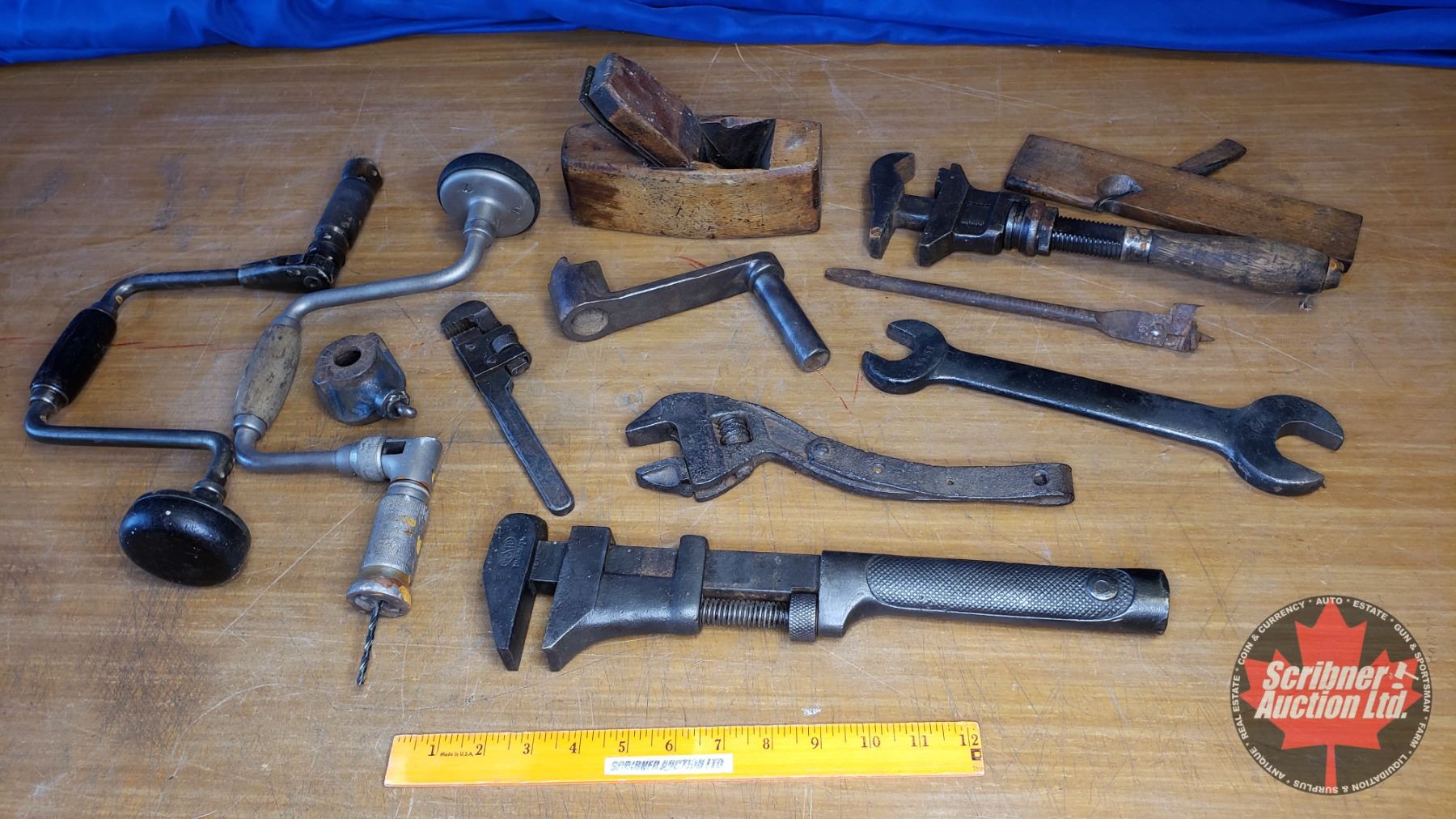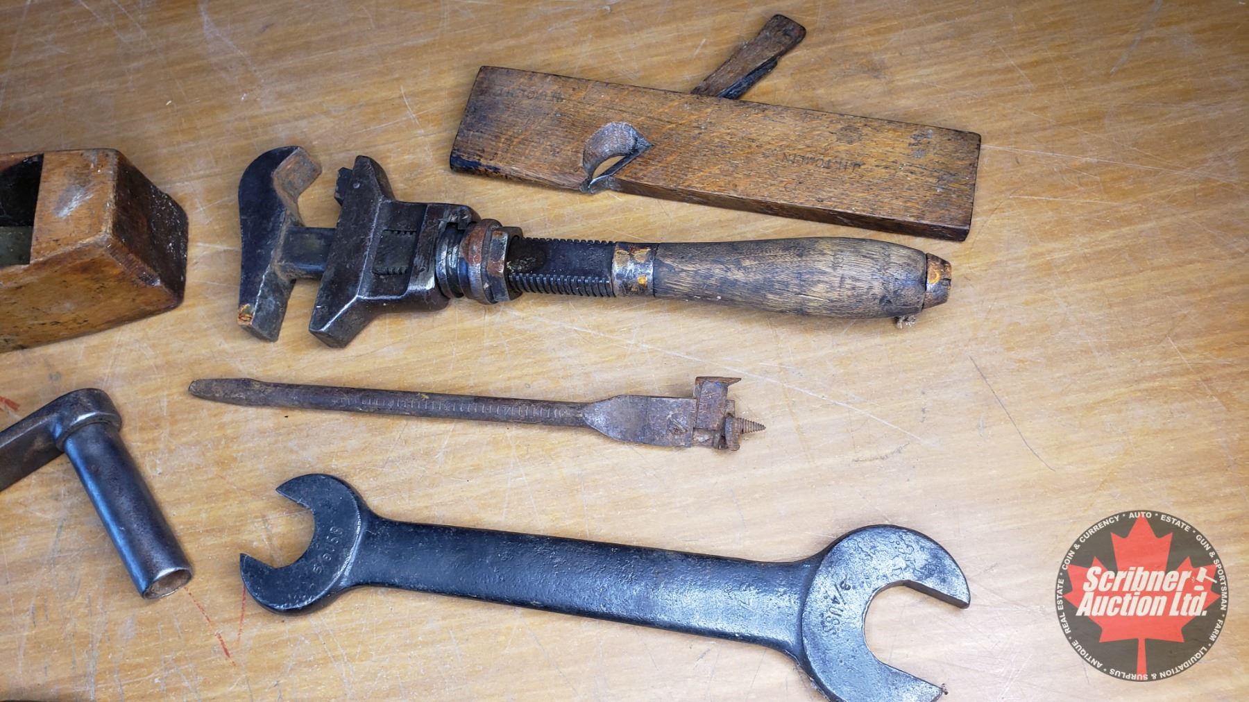 Tray Lot: Antique Tools (Wrenches, Adjustable Wrench, Wood Planes, Brace, etc) (See Pics)