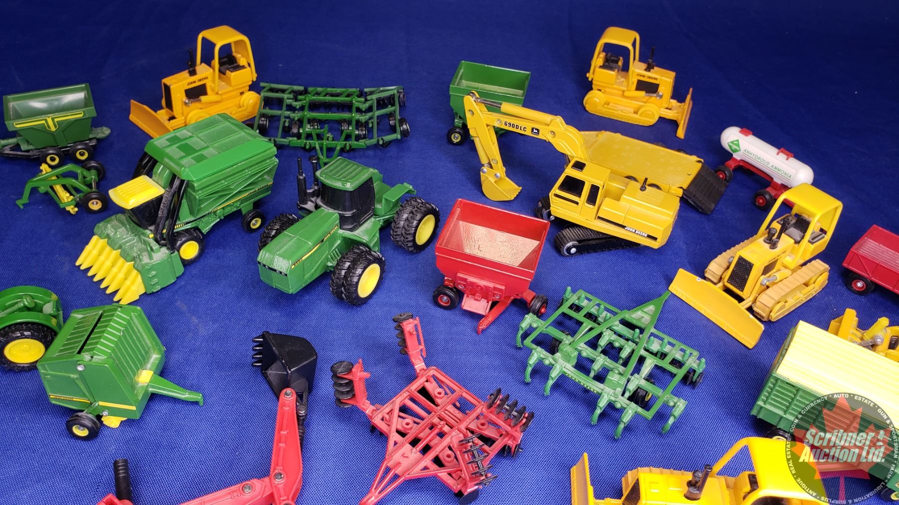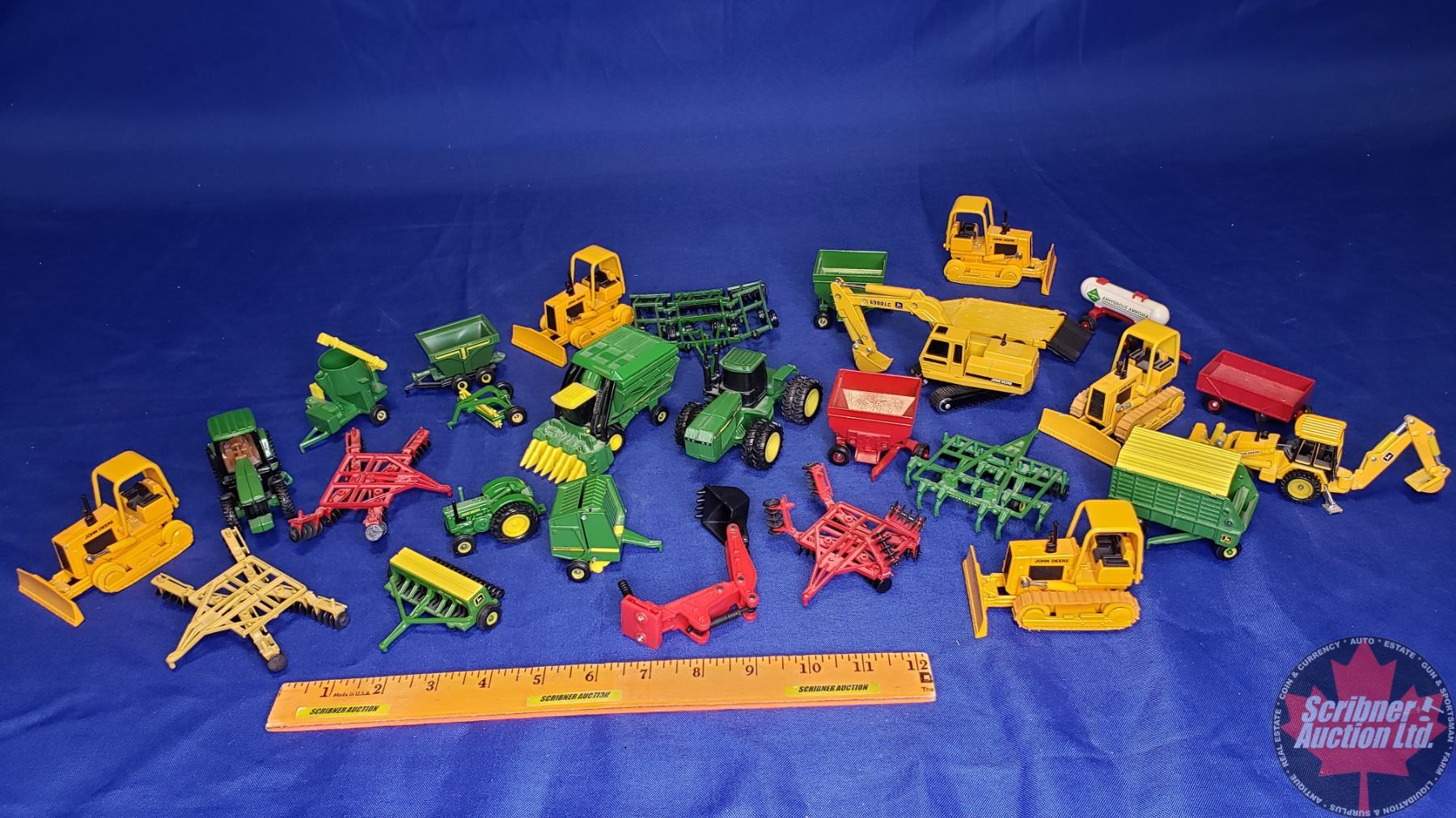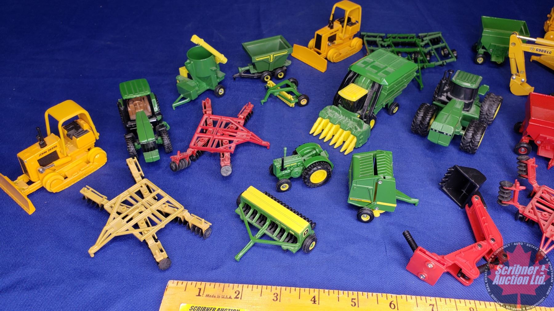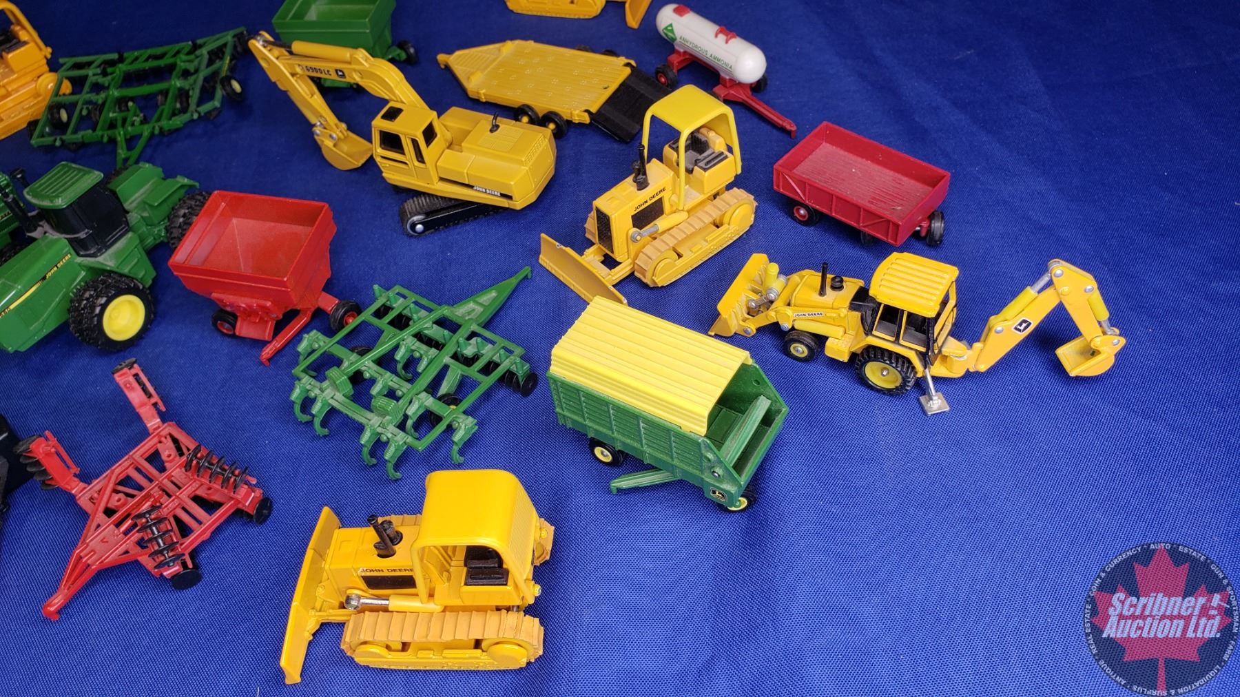 Tray Lot: Assorted John Deere Industrial & Farm Tractors & Attachments (Scale: 1/64)