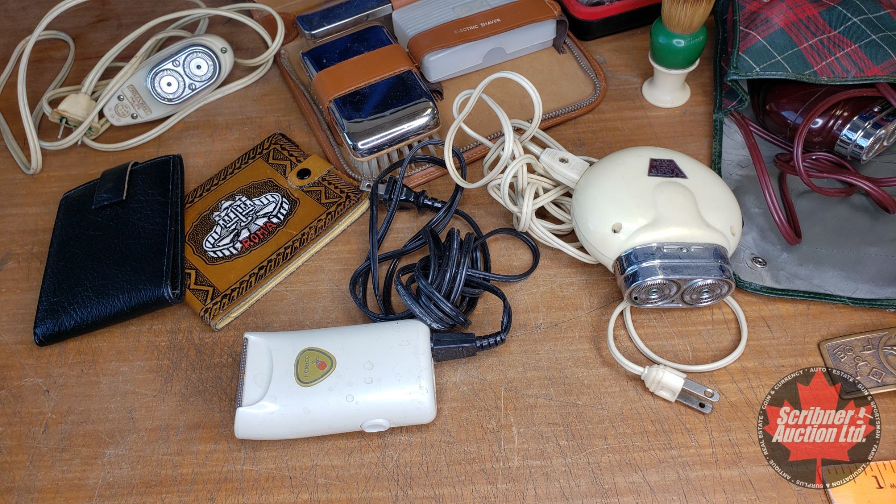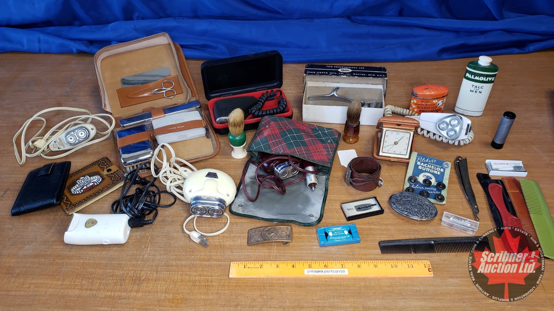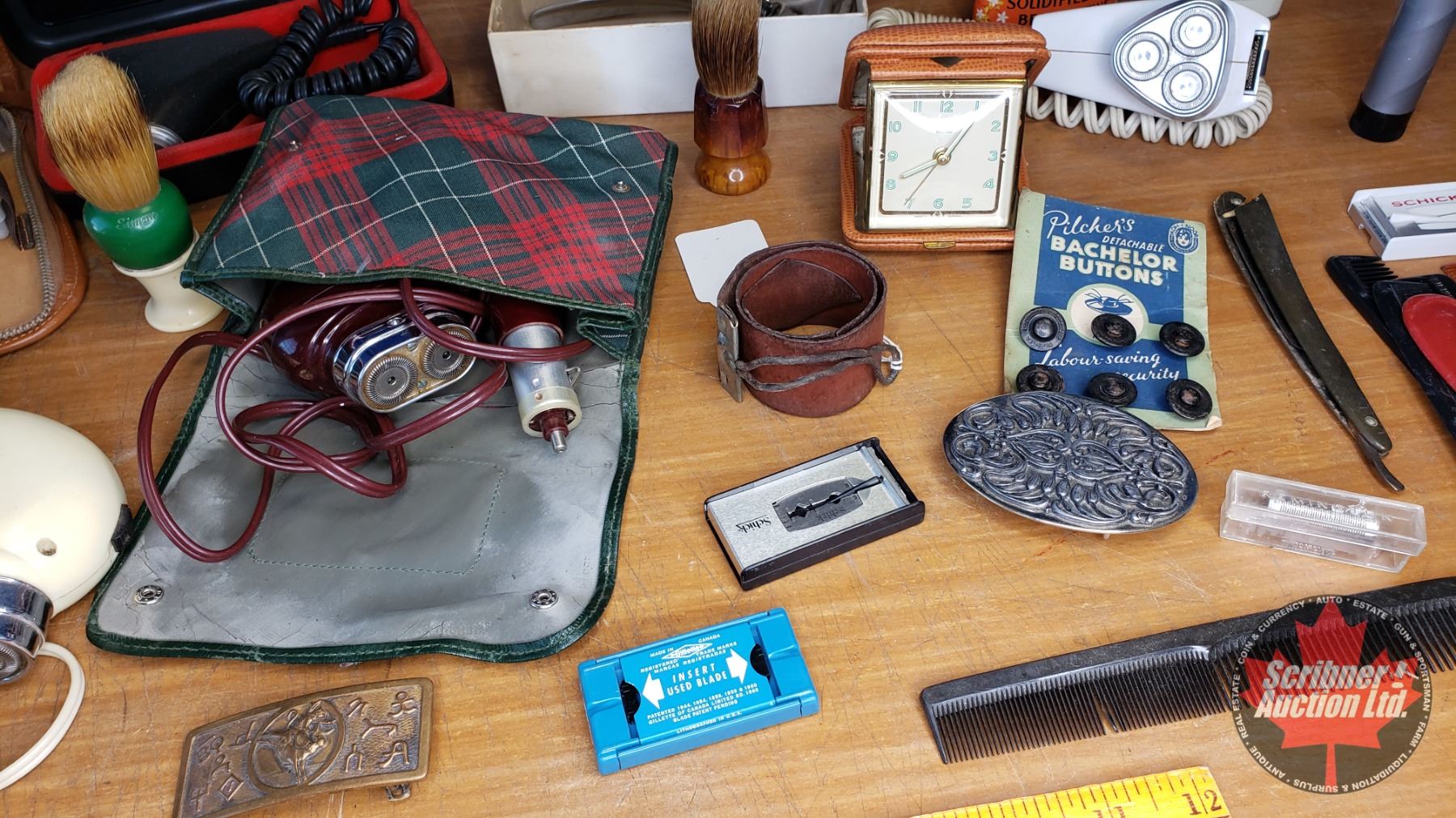 Tray Lot - Barber Items (Electric Shavers, Clippers, Brush, Combs, Razor Strop, Wallets, Belt Buckle, etc) See Pics