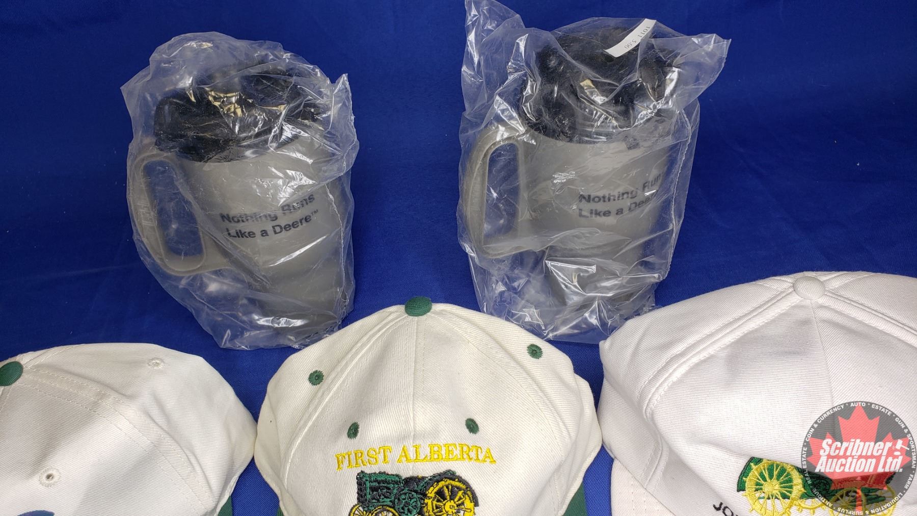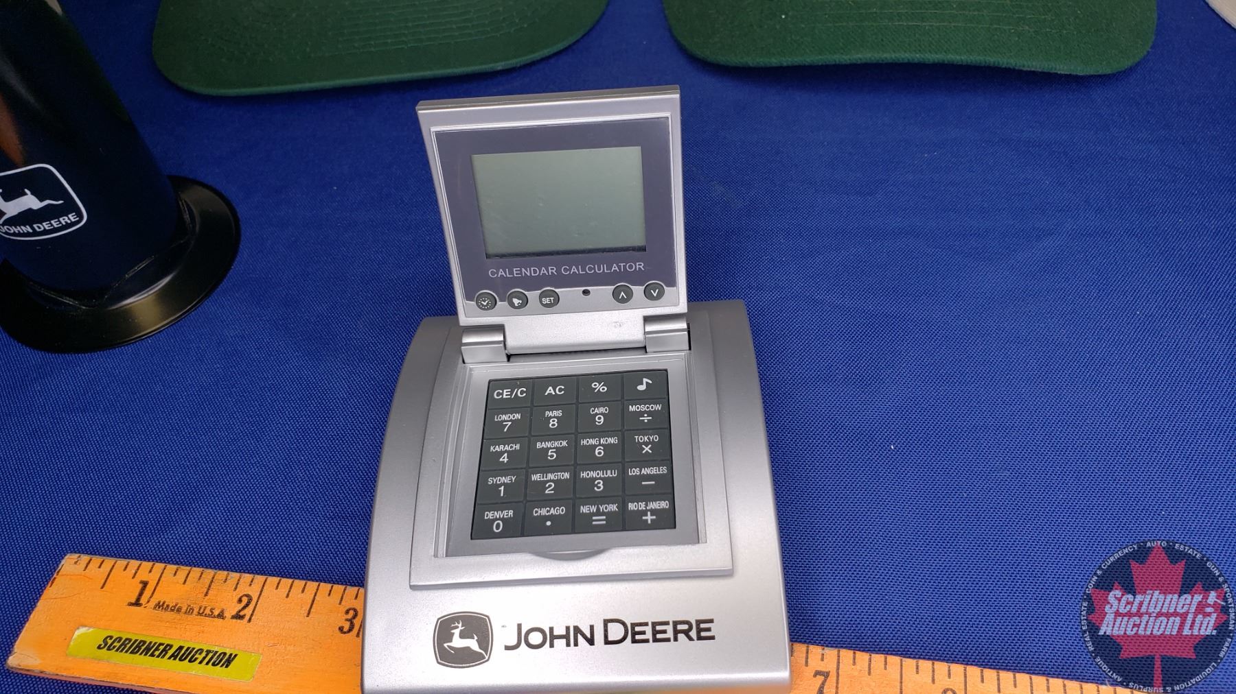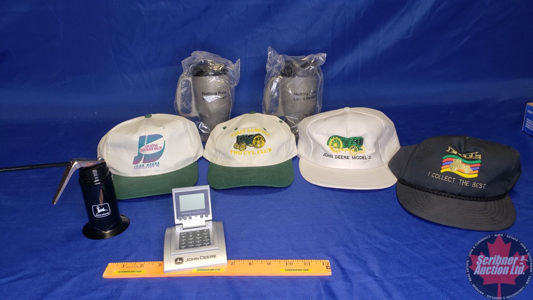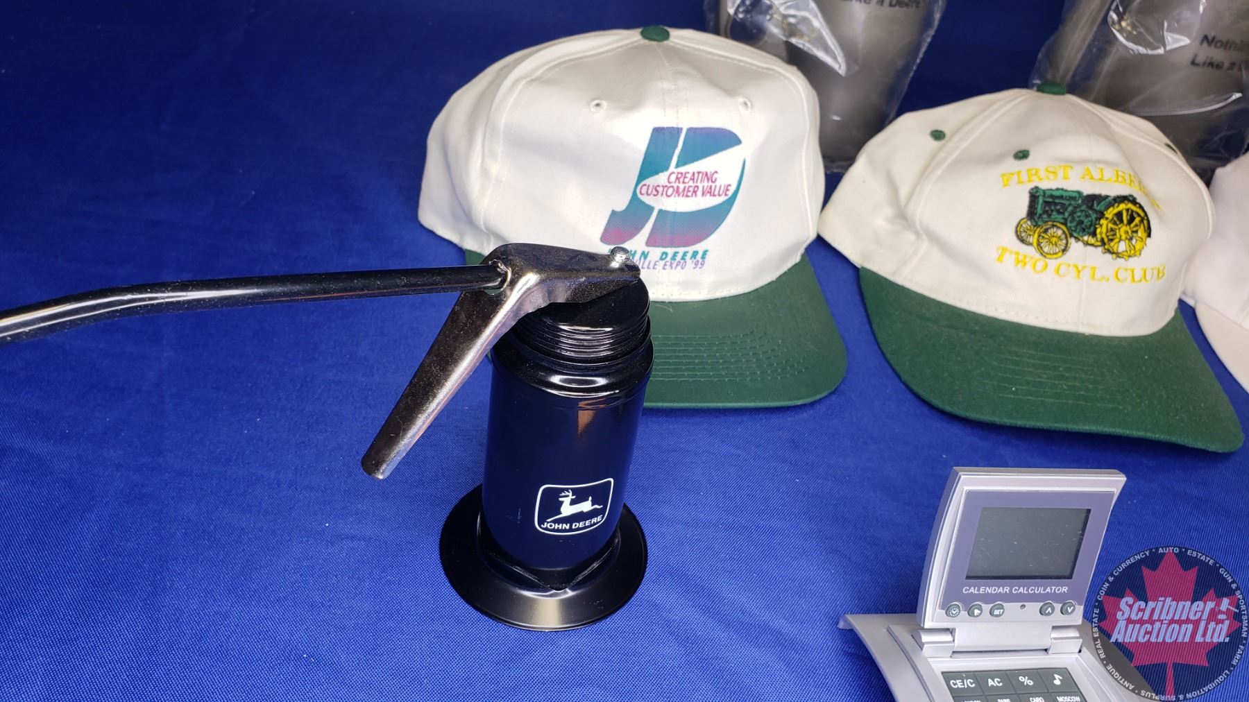 Tray Lot - Collector Combo : John Deere Theme (2 Travel Mugs, 4 Caps, 1 Oiler & 1 Digital Desk Calendar/Calculator)
