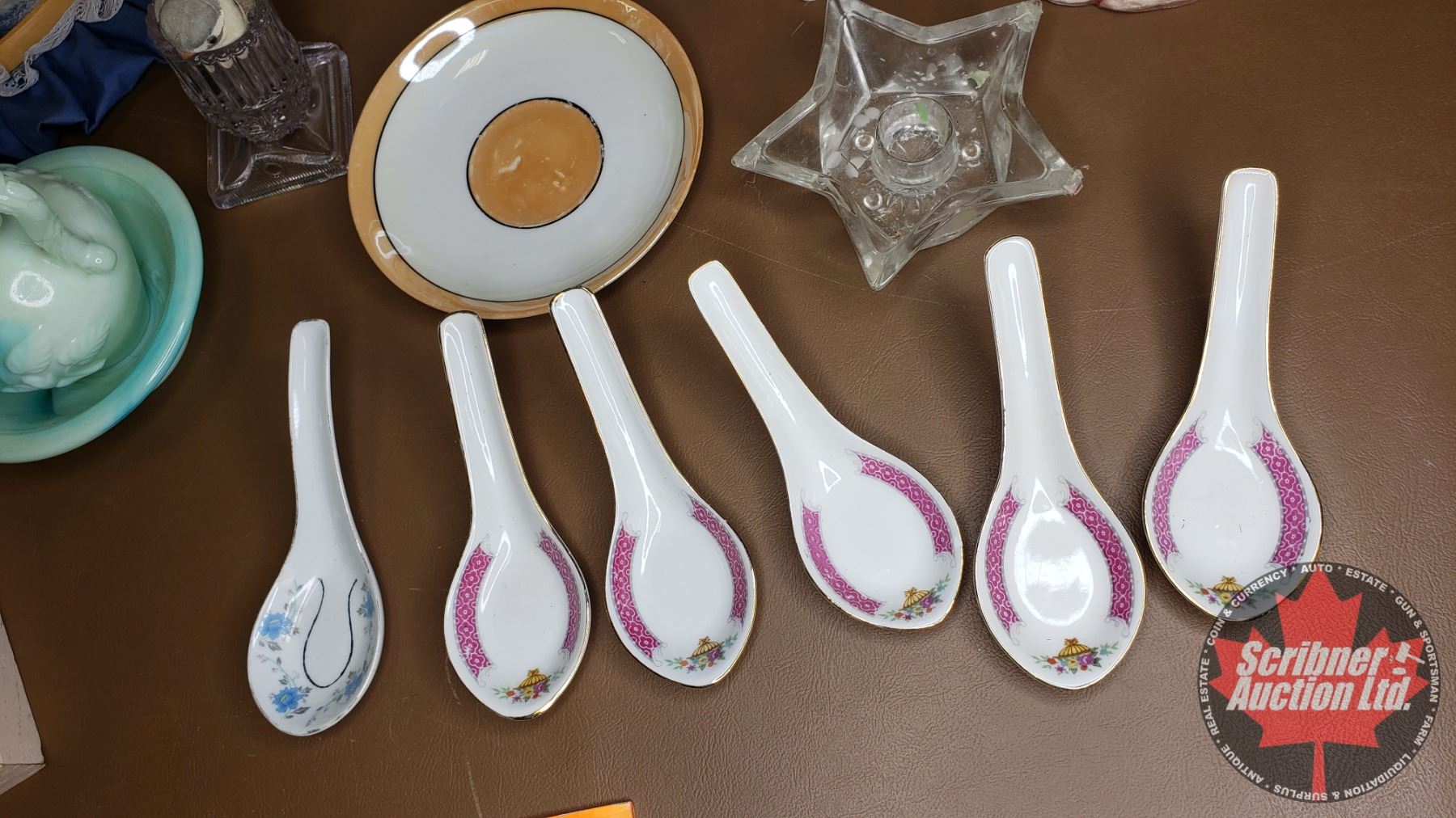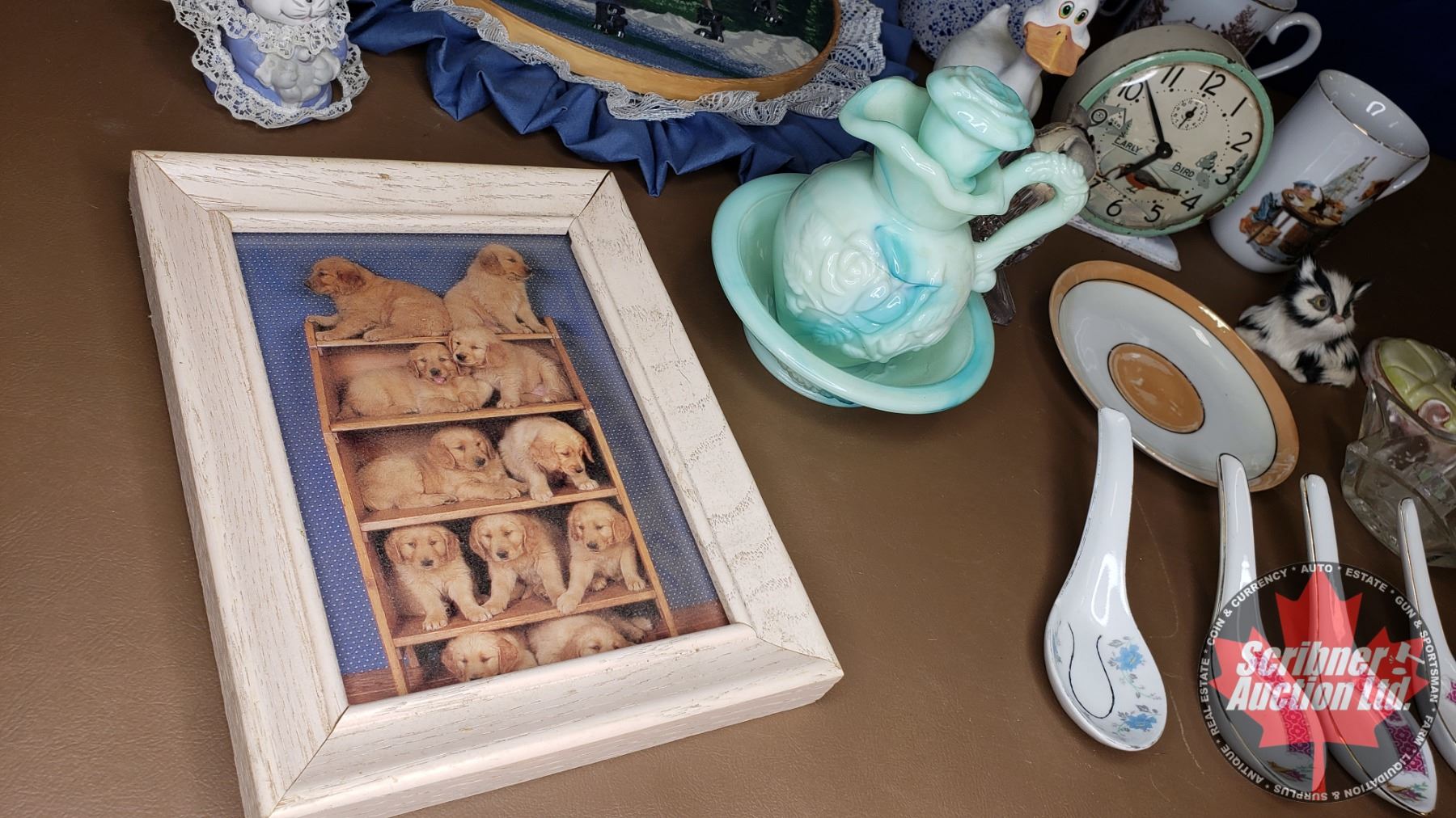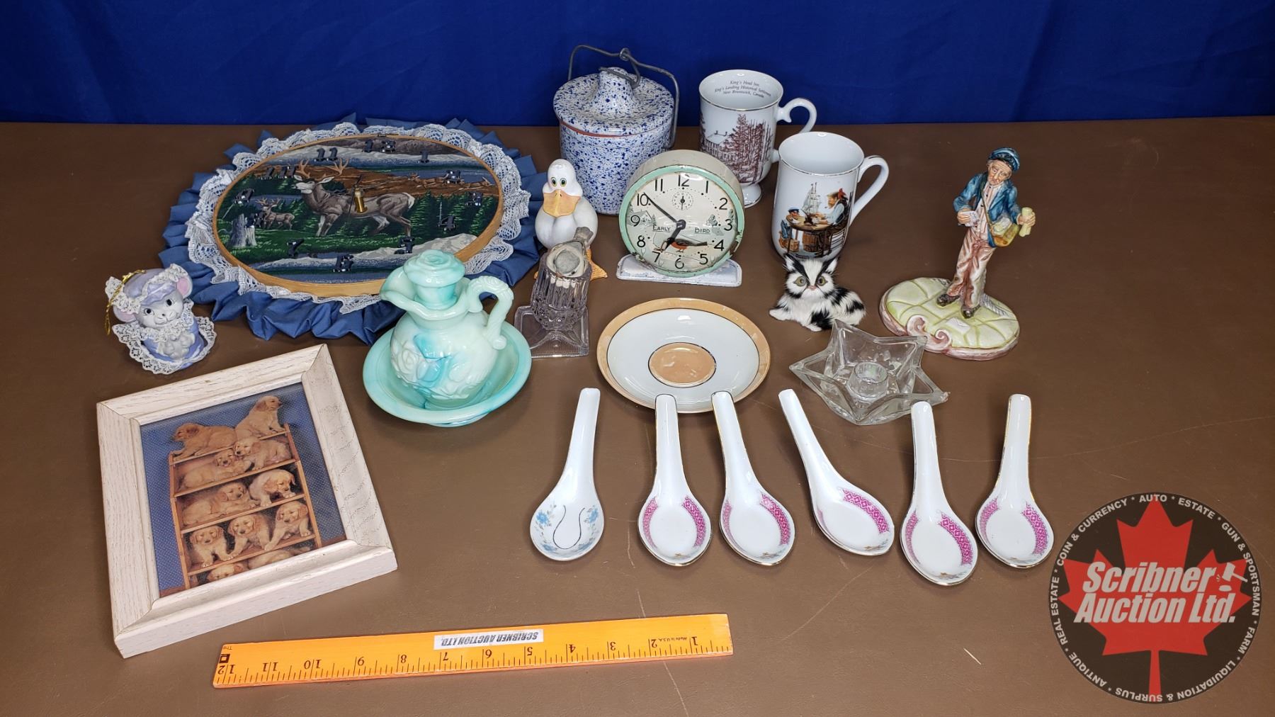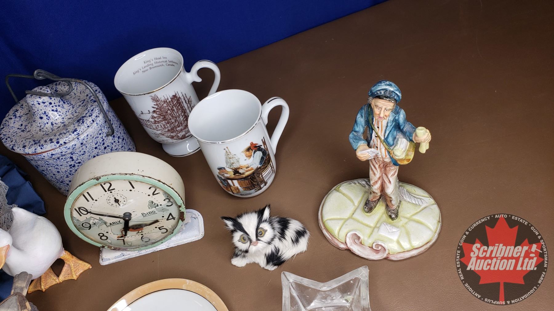 Tray Lot: Early Bird Alarm Clock, Avon Dish, Candle Holders, Deer Wall Clock, Puppy Picture, etc