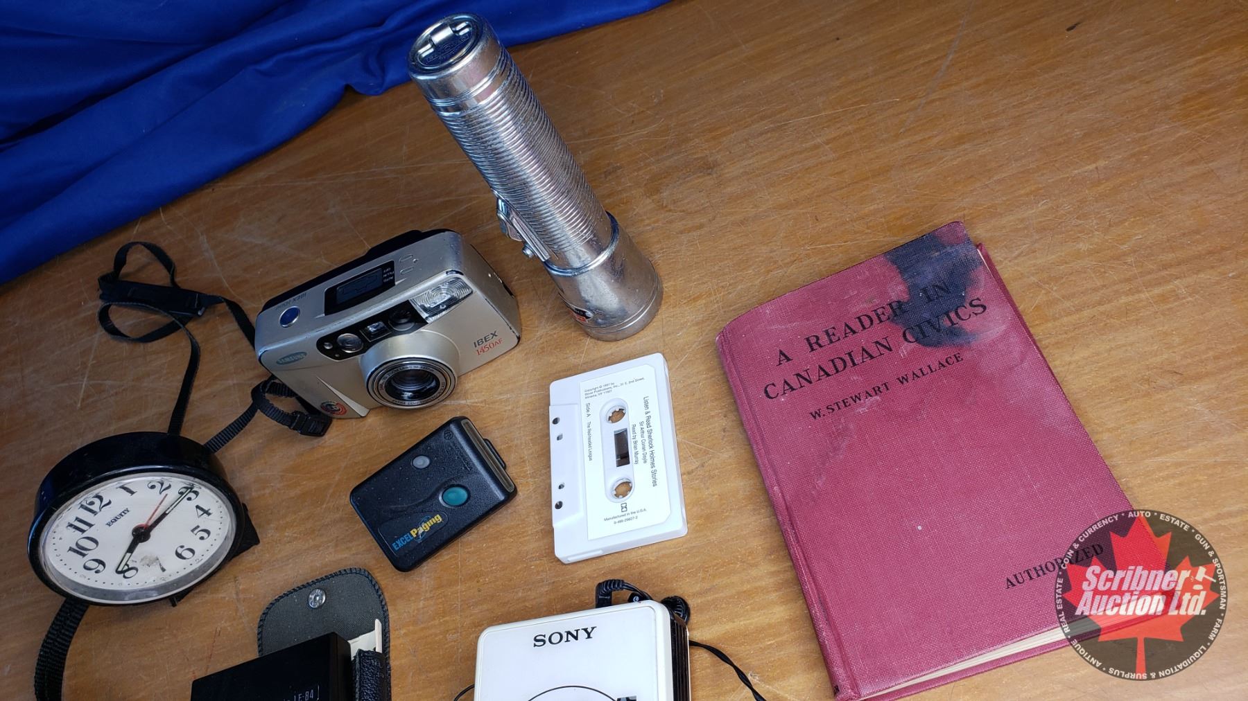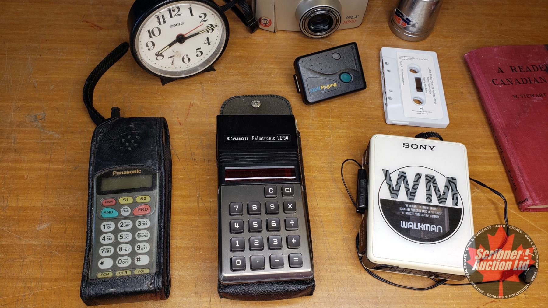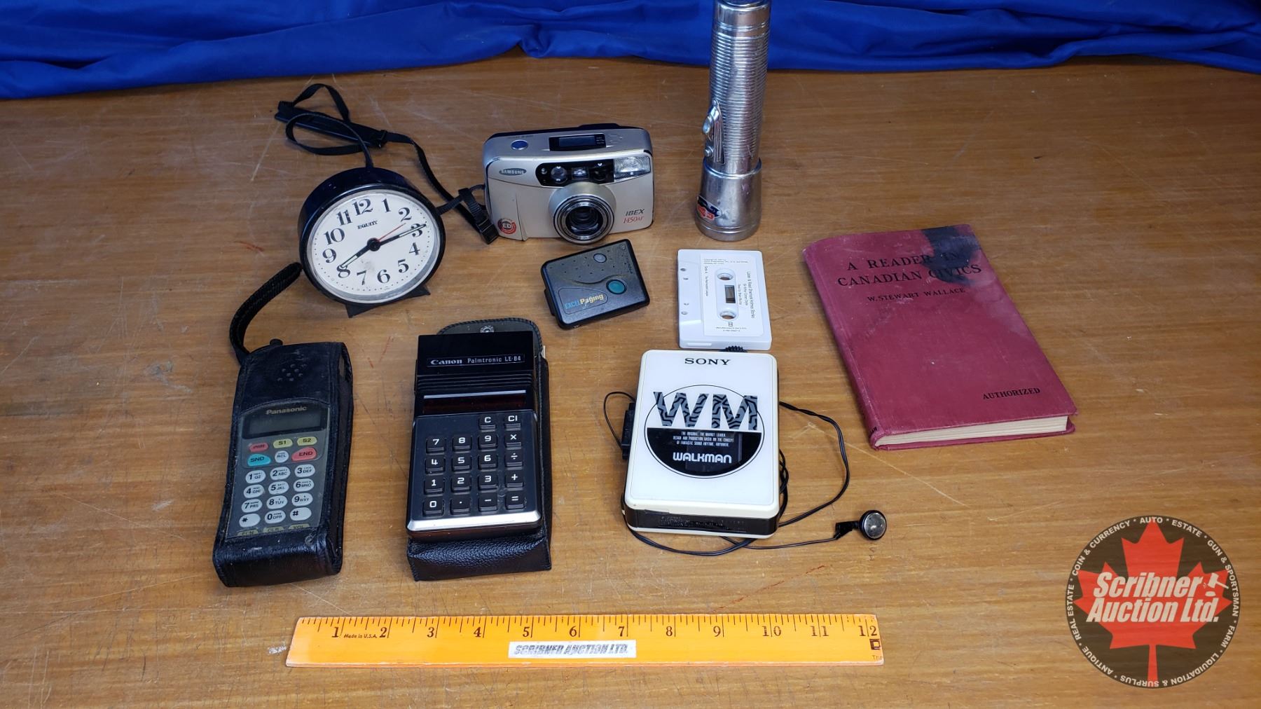 Tray Lot - Eighties Technology Theme : Cell Phone in Box, Sony Walkman, Flashlight, Samsung Camera, Pager, Calculator, Cell Phone, Book "Reader in Canadian Civics" (See Pics)