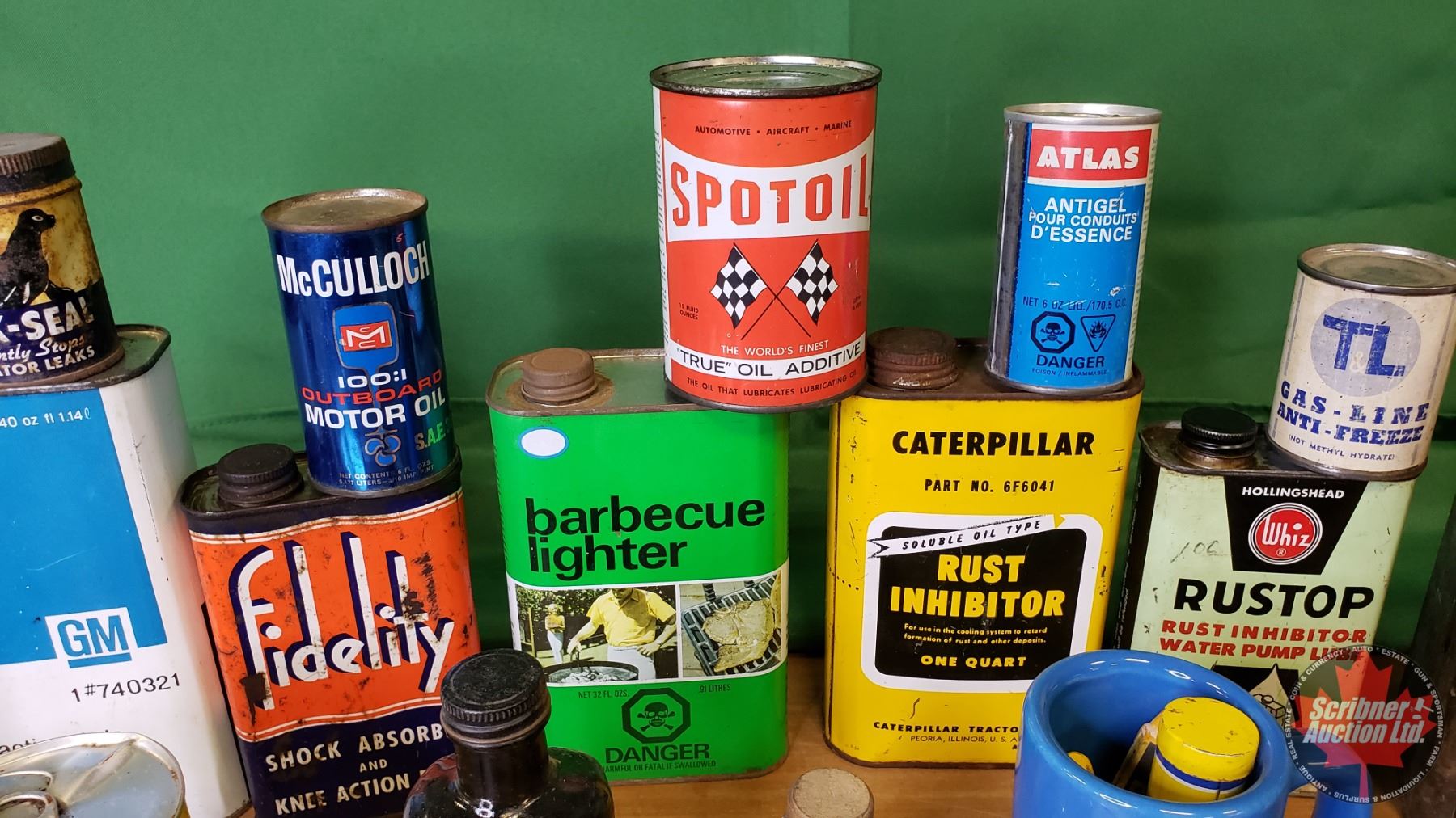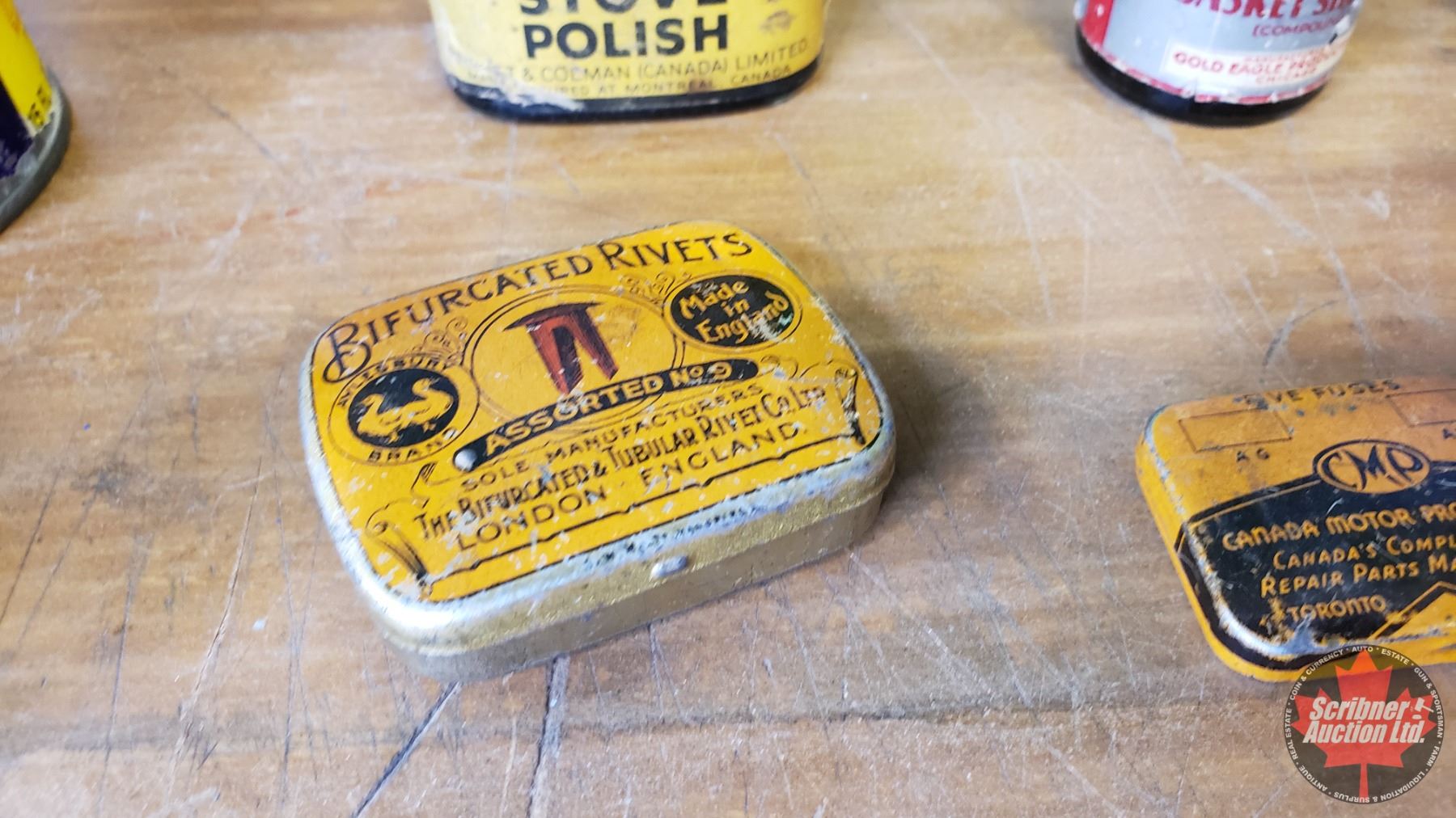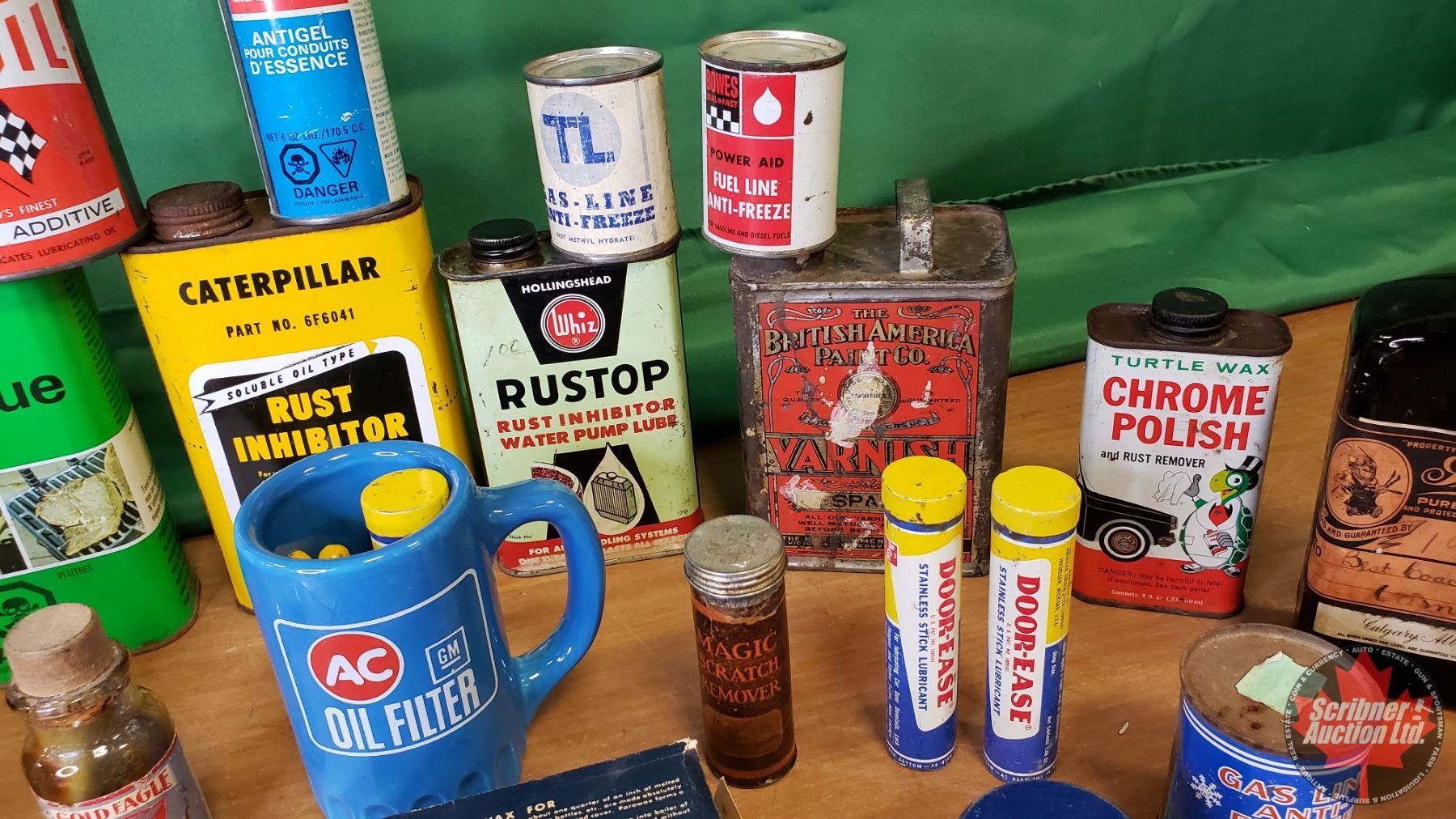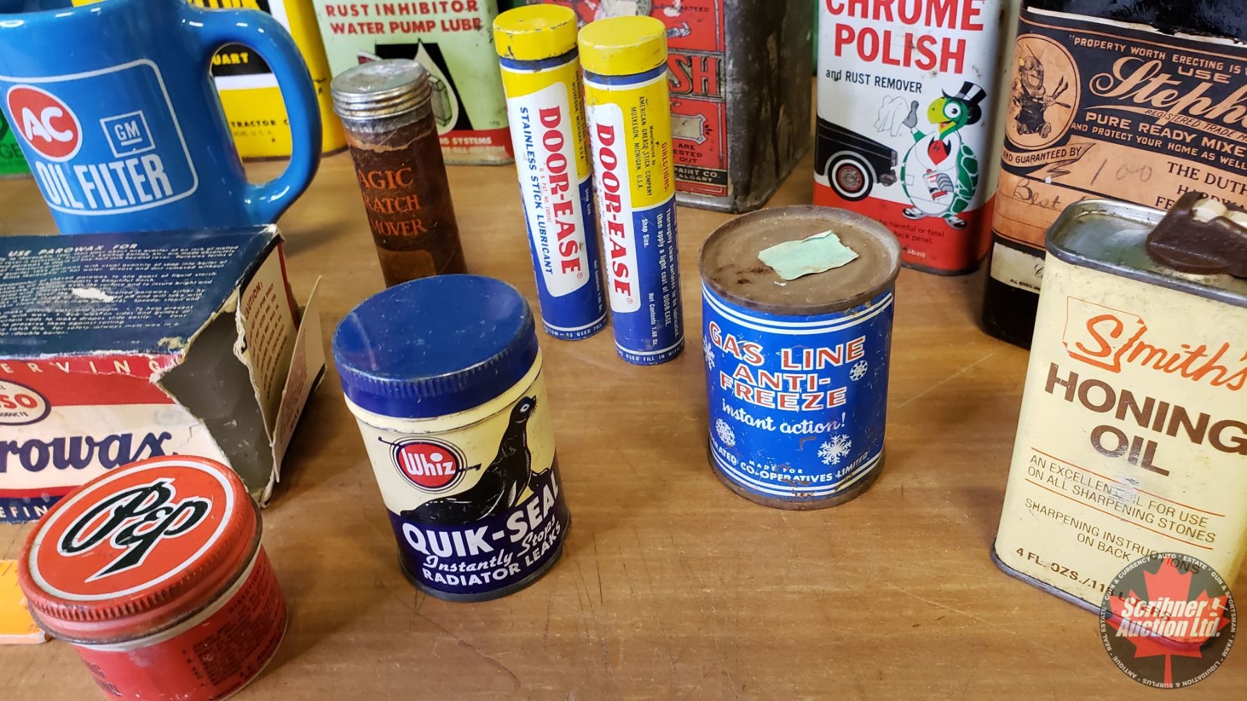 Tray Lot - Garage Theme (Leak Stop Tin, British American Paint Co. Varnish Tin, Spot Oil Additive (Full), McCulloch Outboard Motor Oil (Full), GM Positrack Axle Lubricant, Rivets, etc!) (See Pics!)