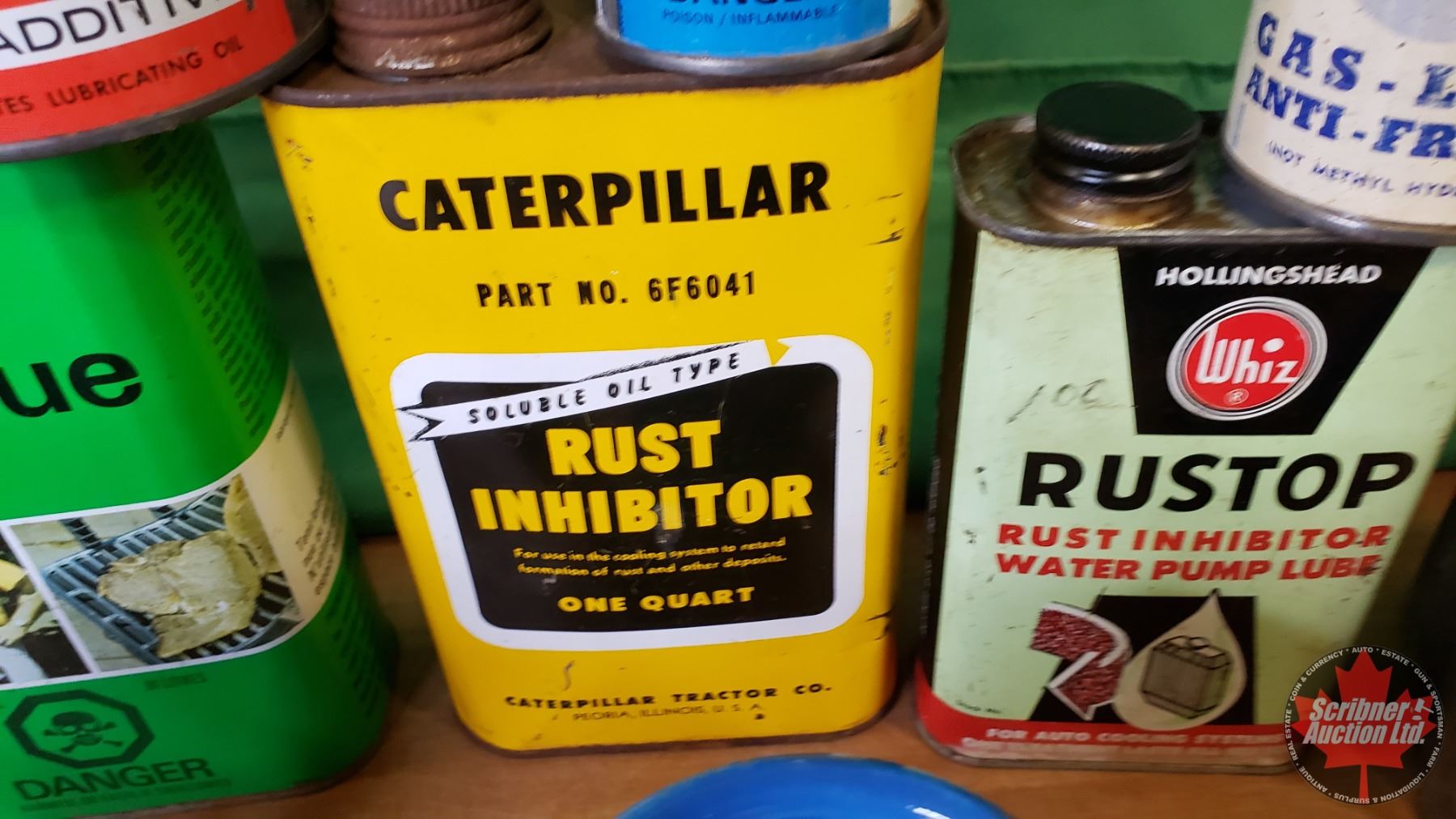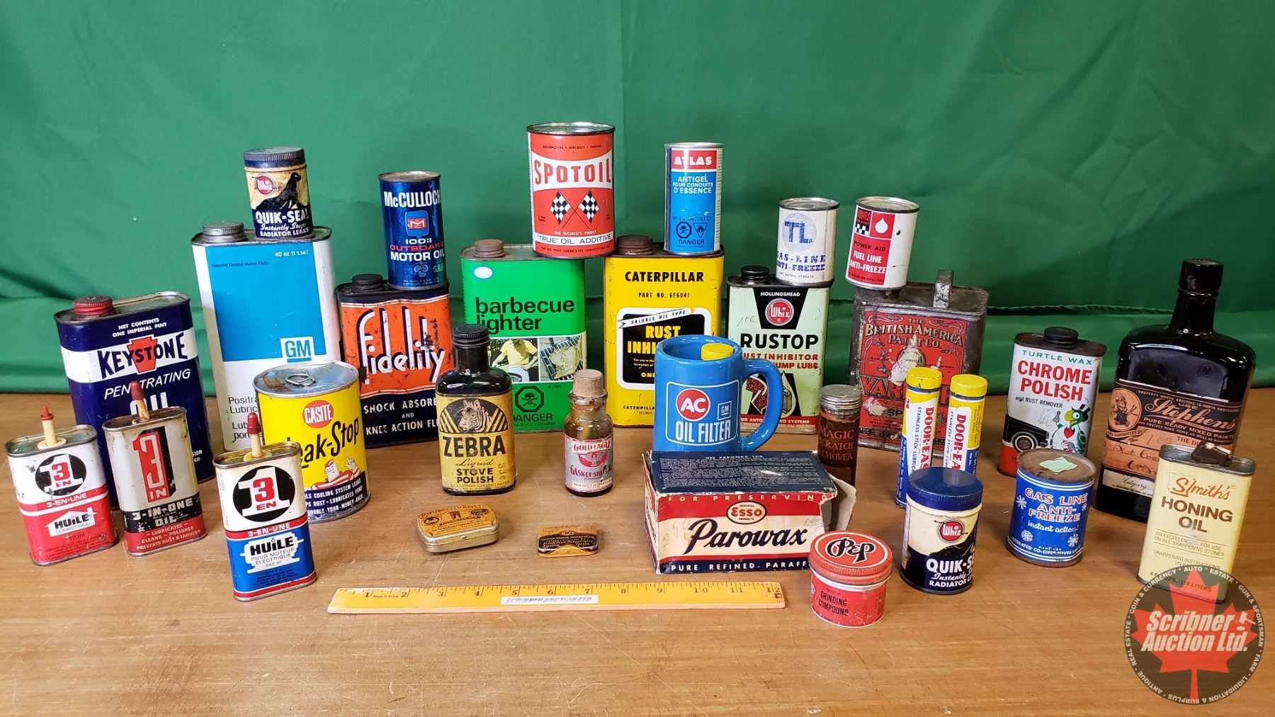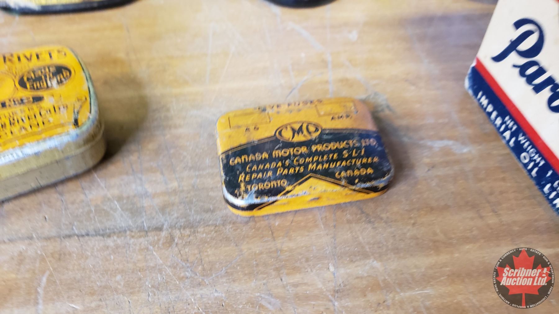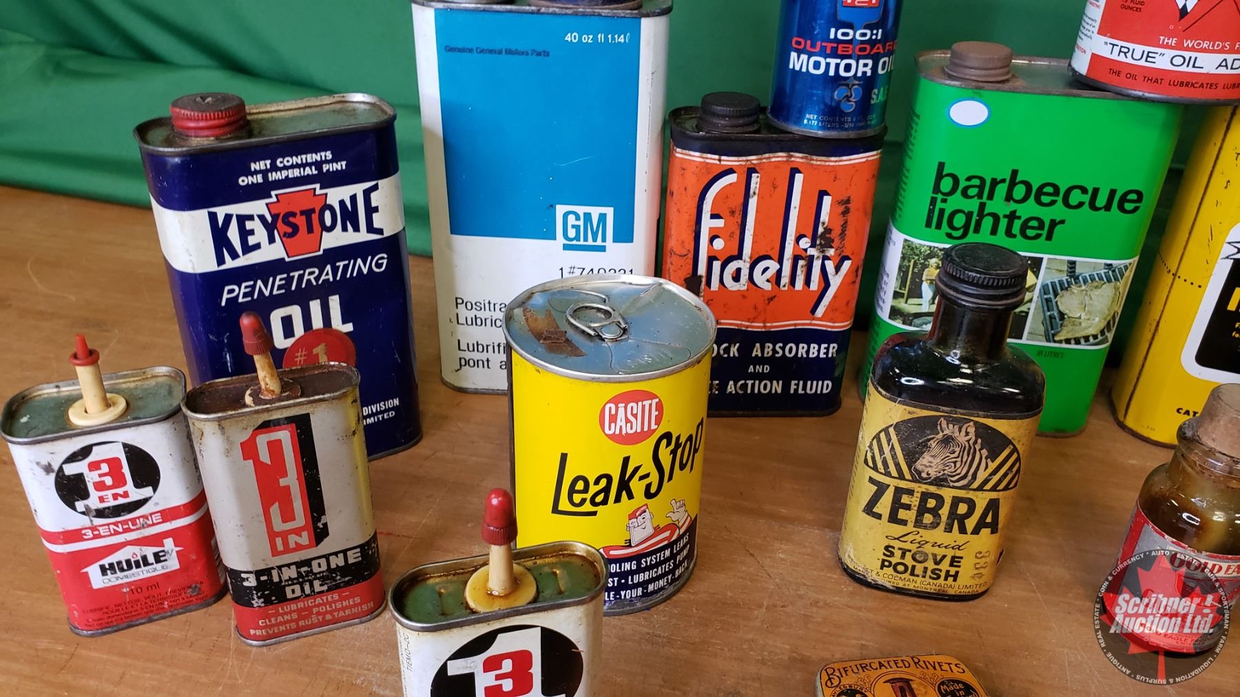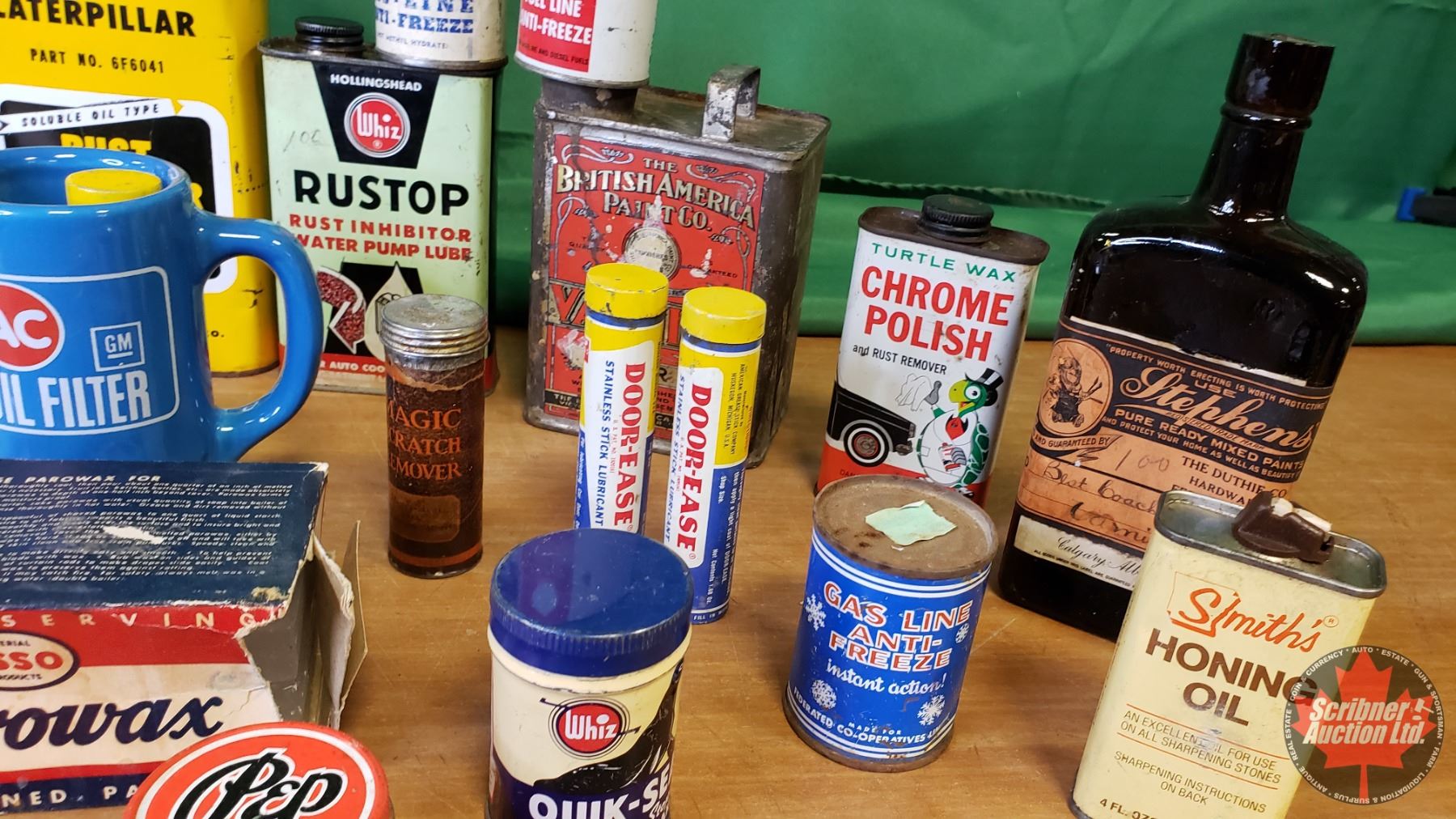 Tray Lot - Garage Theme (Leak Stop Tin, British American Paint Co. Varnish Tin, Spot Oil Additive (Full), McCulloch Outboard Motor Oil (Full), GM Positrack Axle Lubricant, Rivets, etc!) (See Pics!)