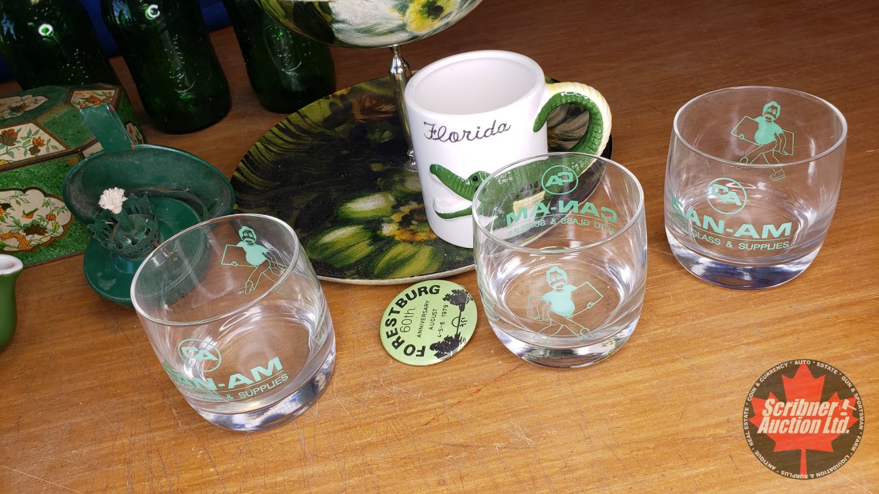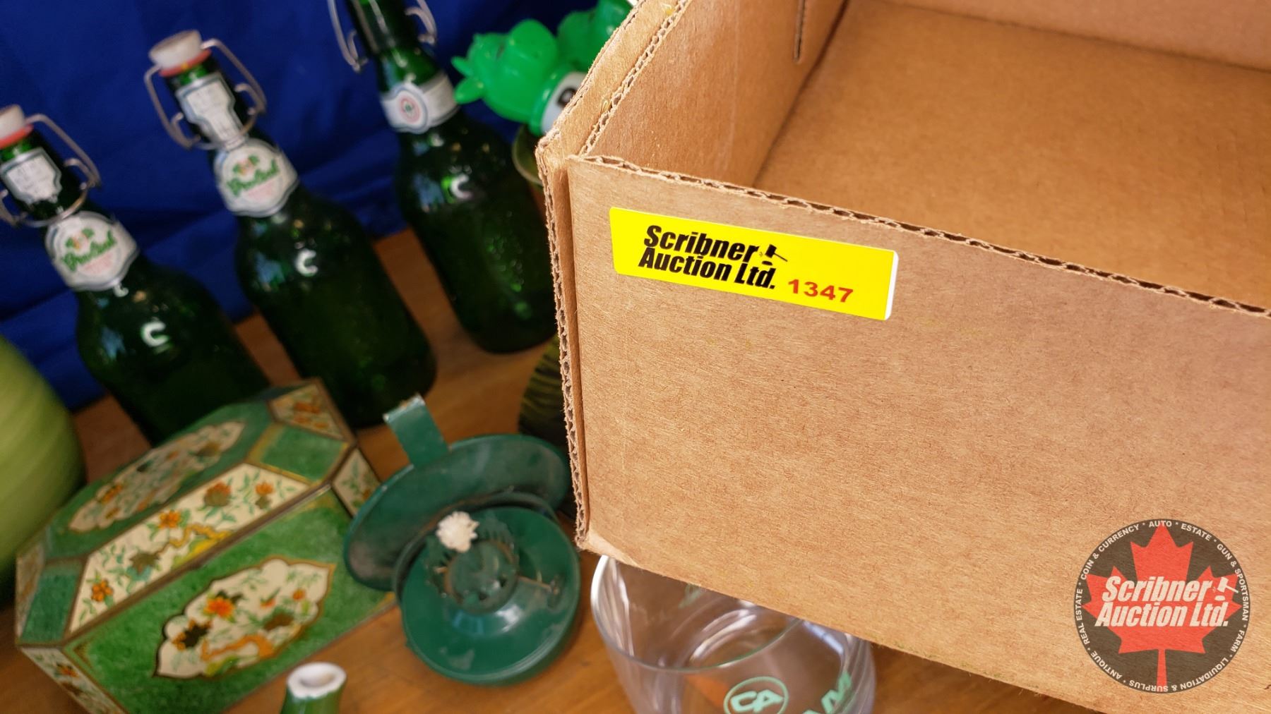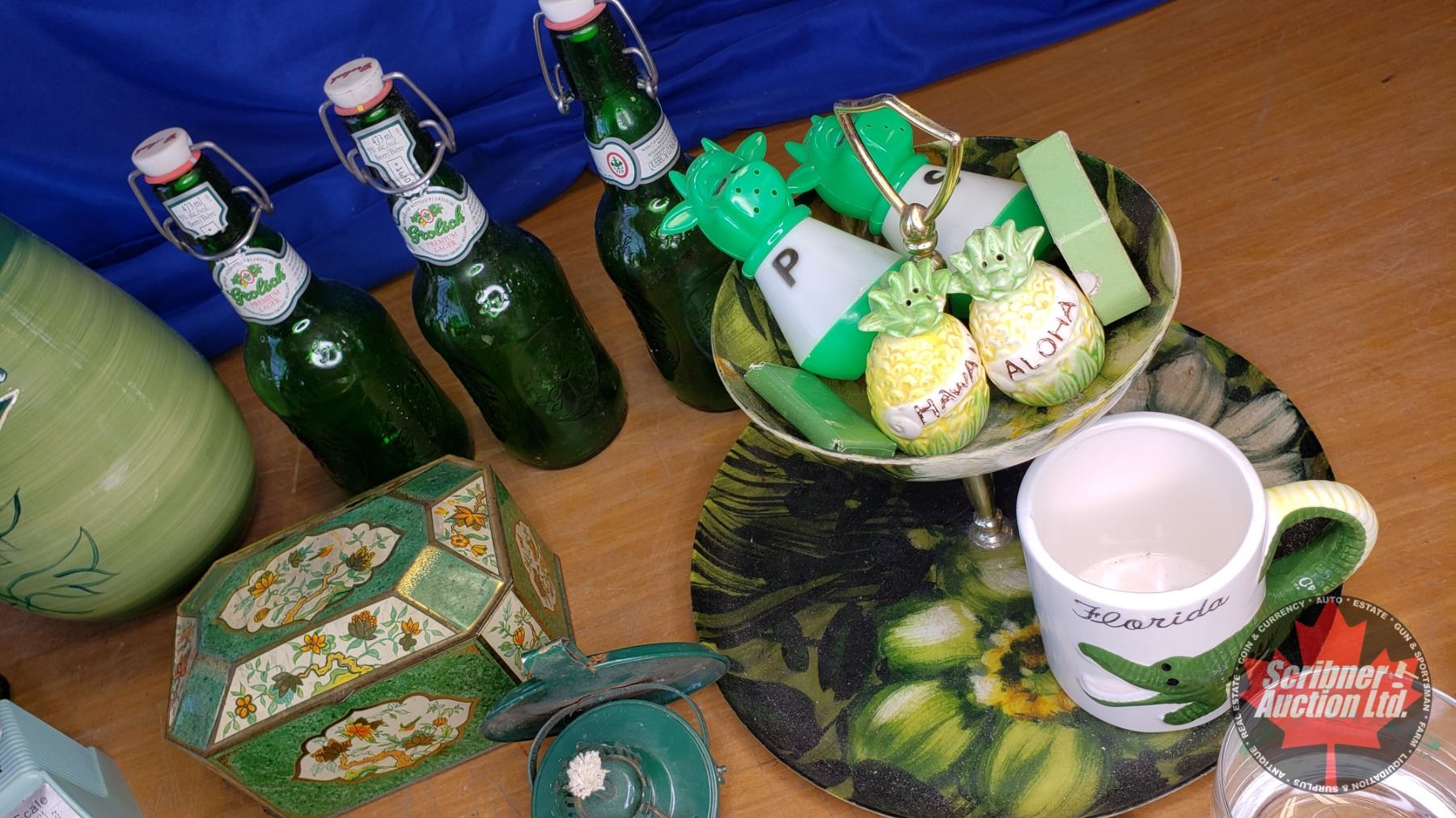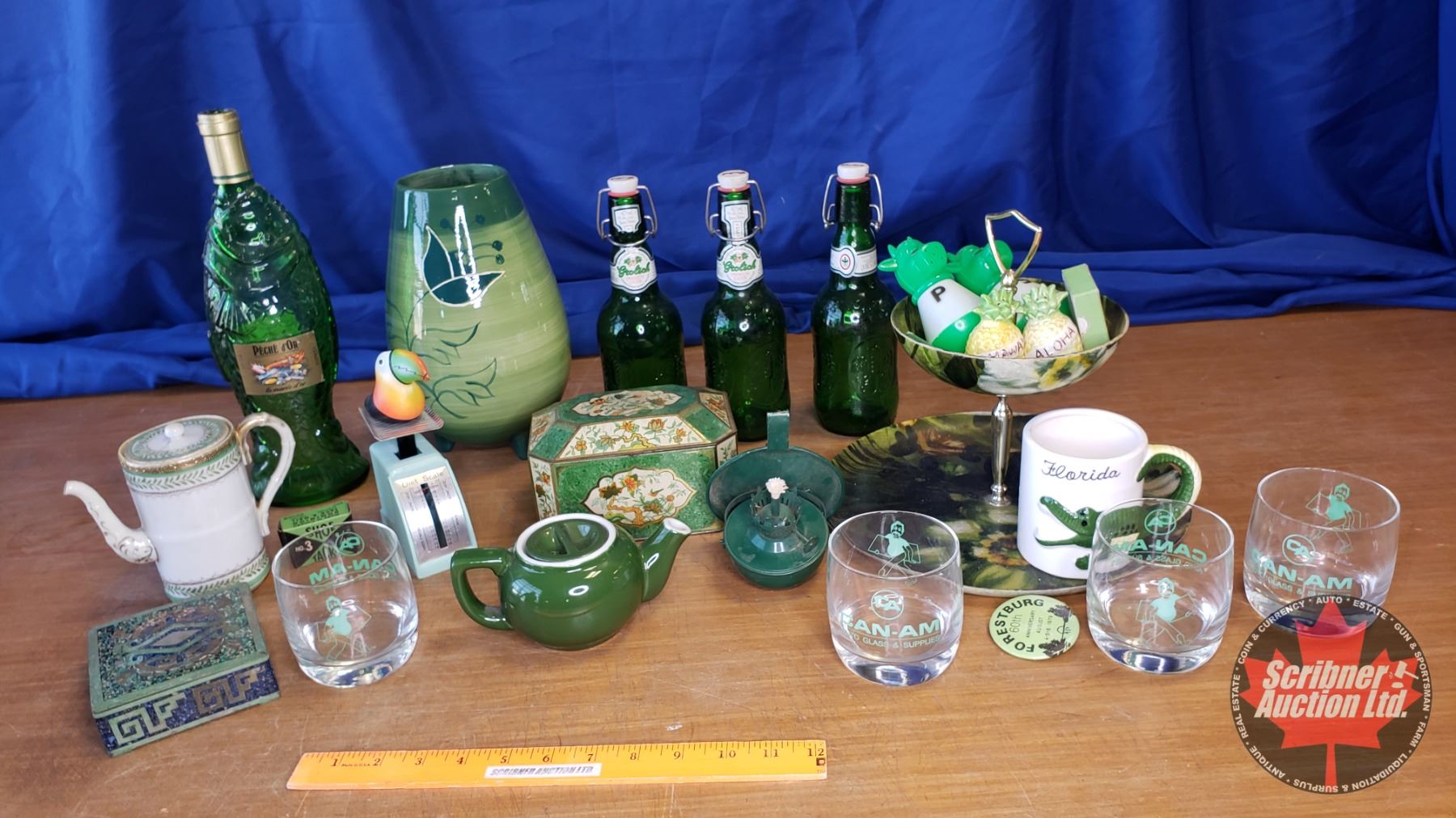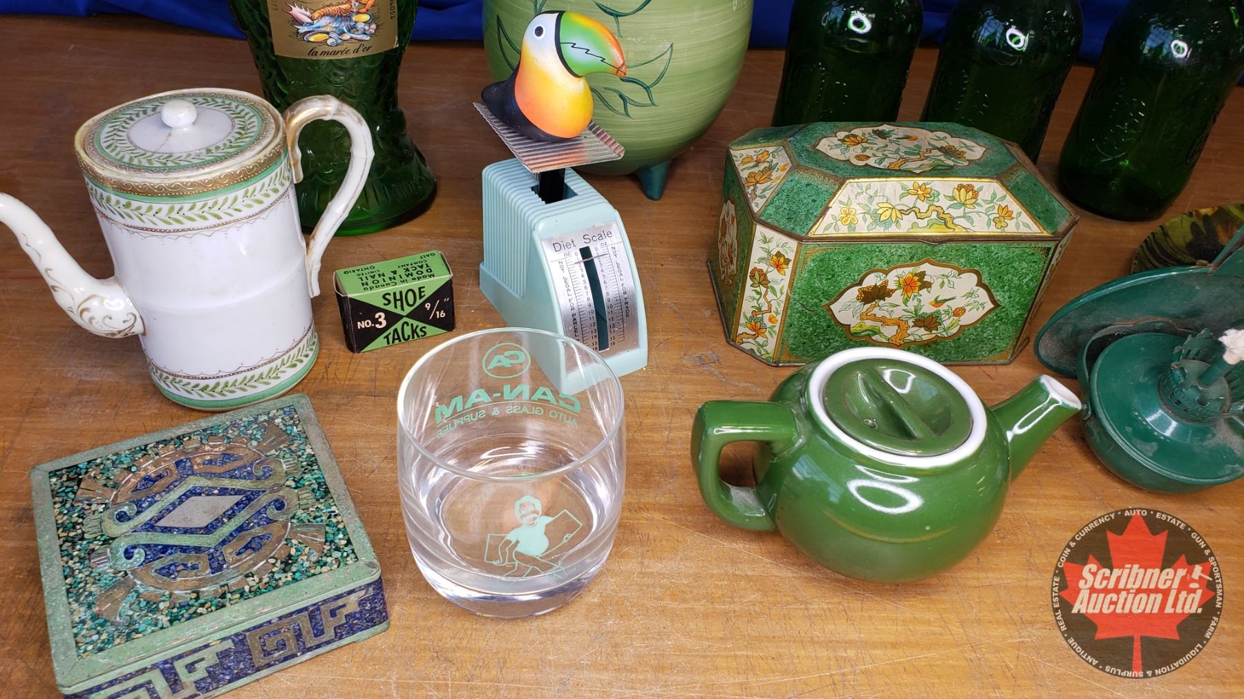 Tray Lot - Green Theme: Old Vase, Teapot, Scale, Salt & Pepper Shakers, Coffee Mug, Tie Tin, etc (Se
