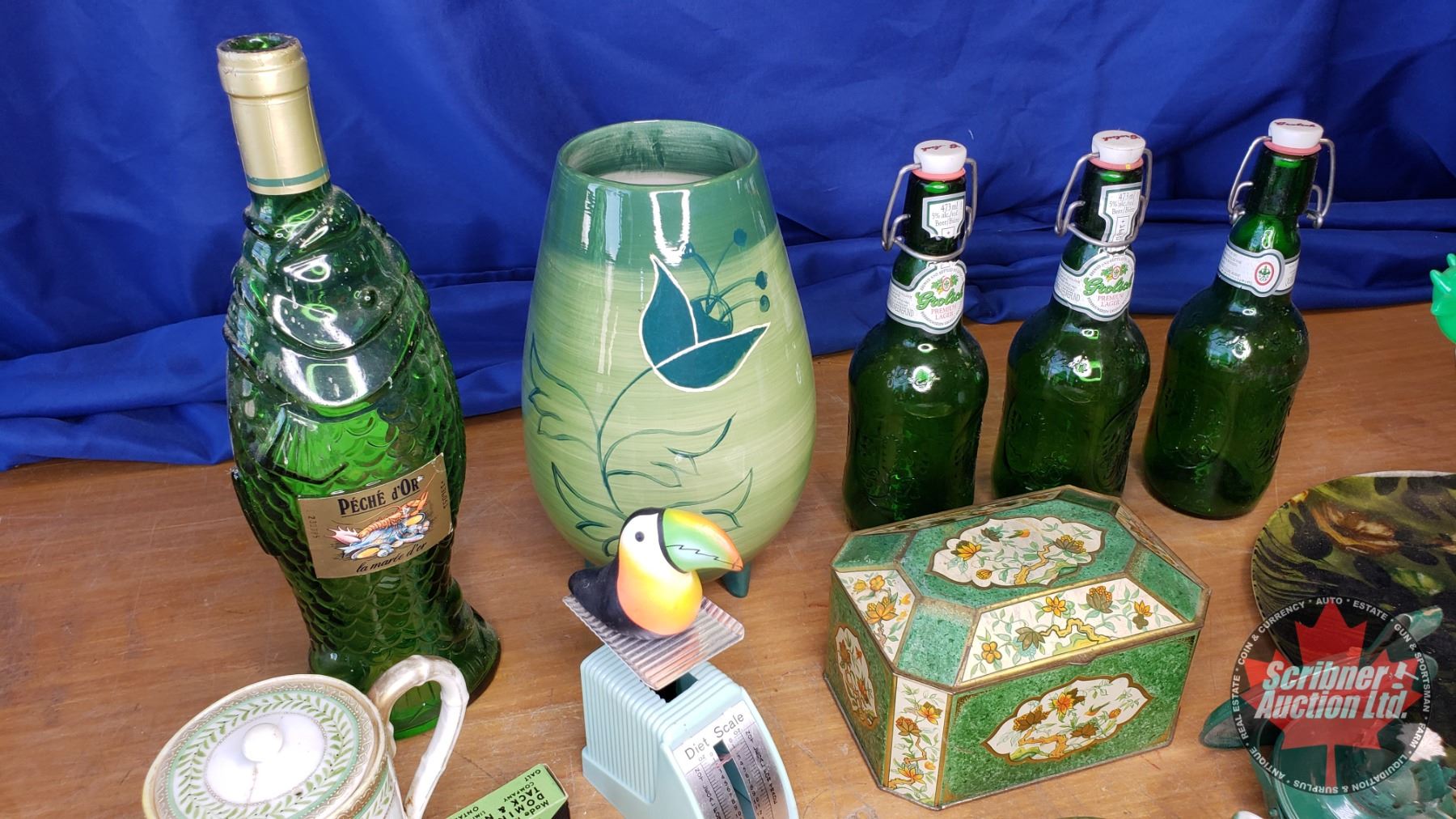 Tray Lot - Green Theme: Old Vase, Teapot, Scale, Salt & Pepper Shakers, Coffee Mug, Tie Tin, etc (See Pics)