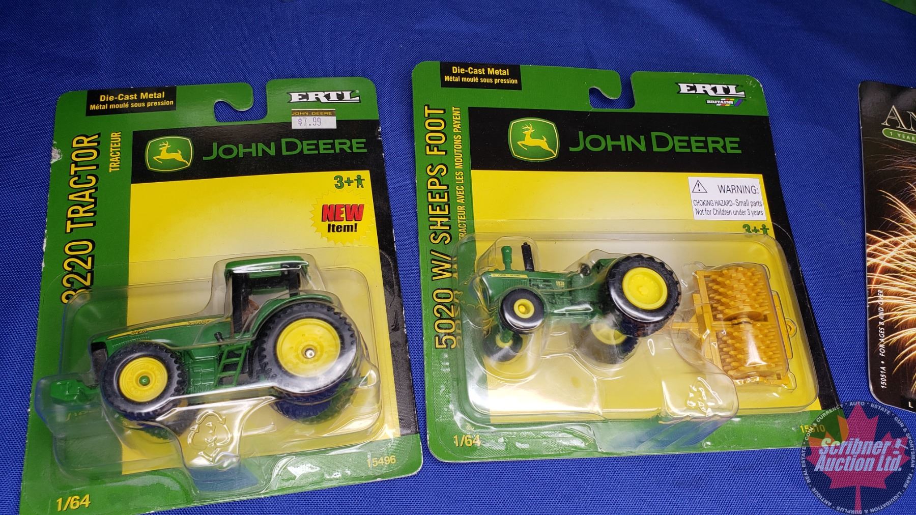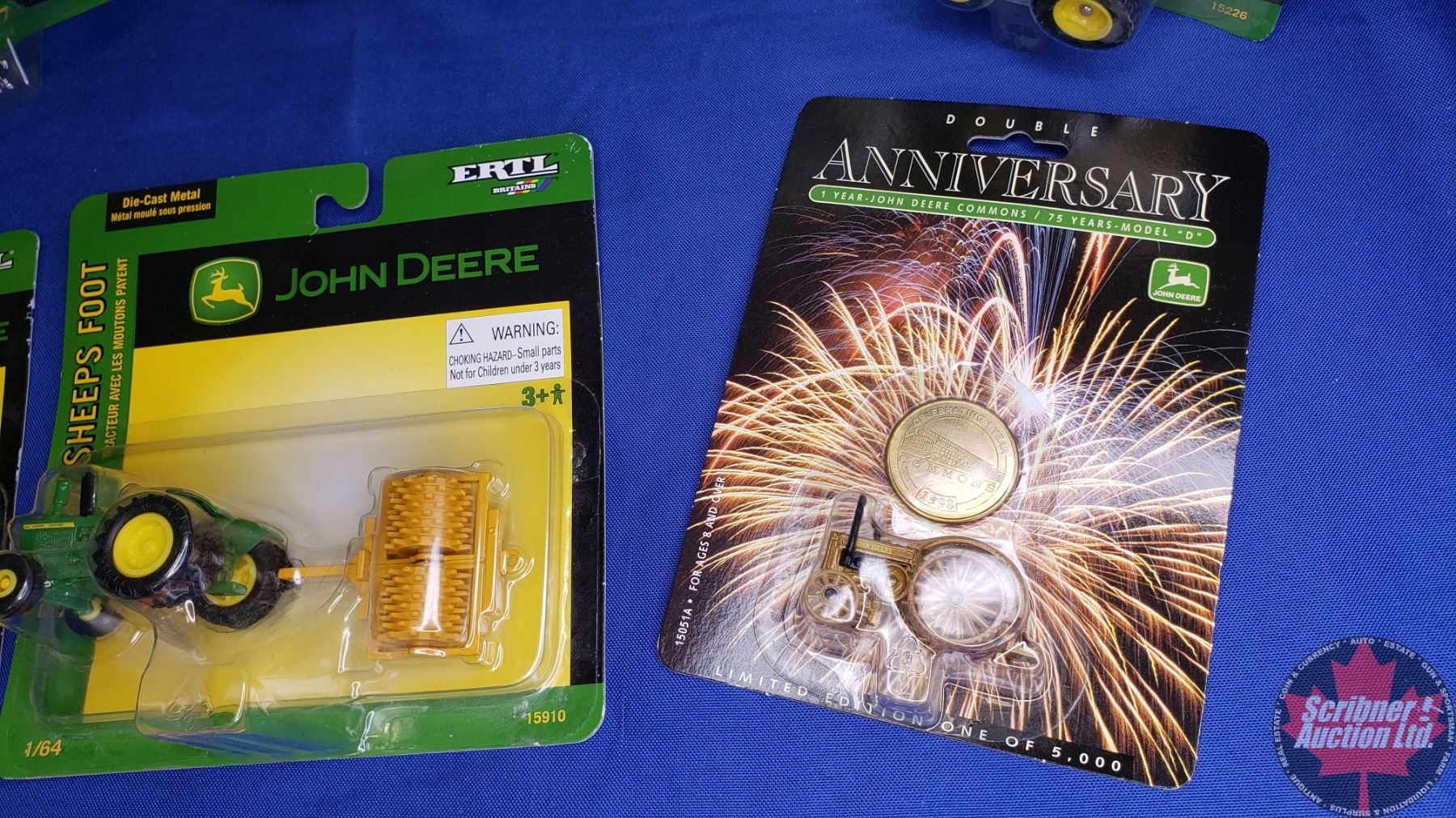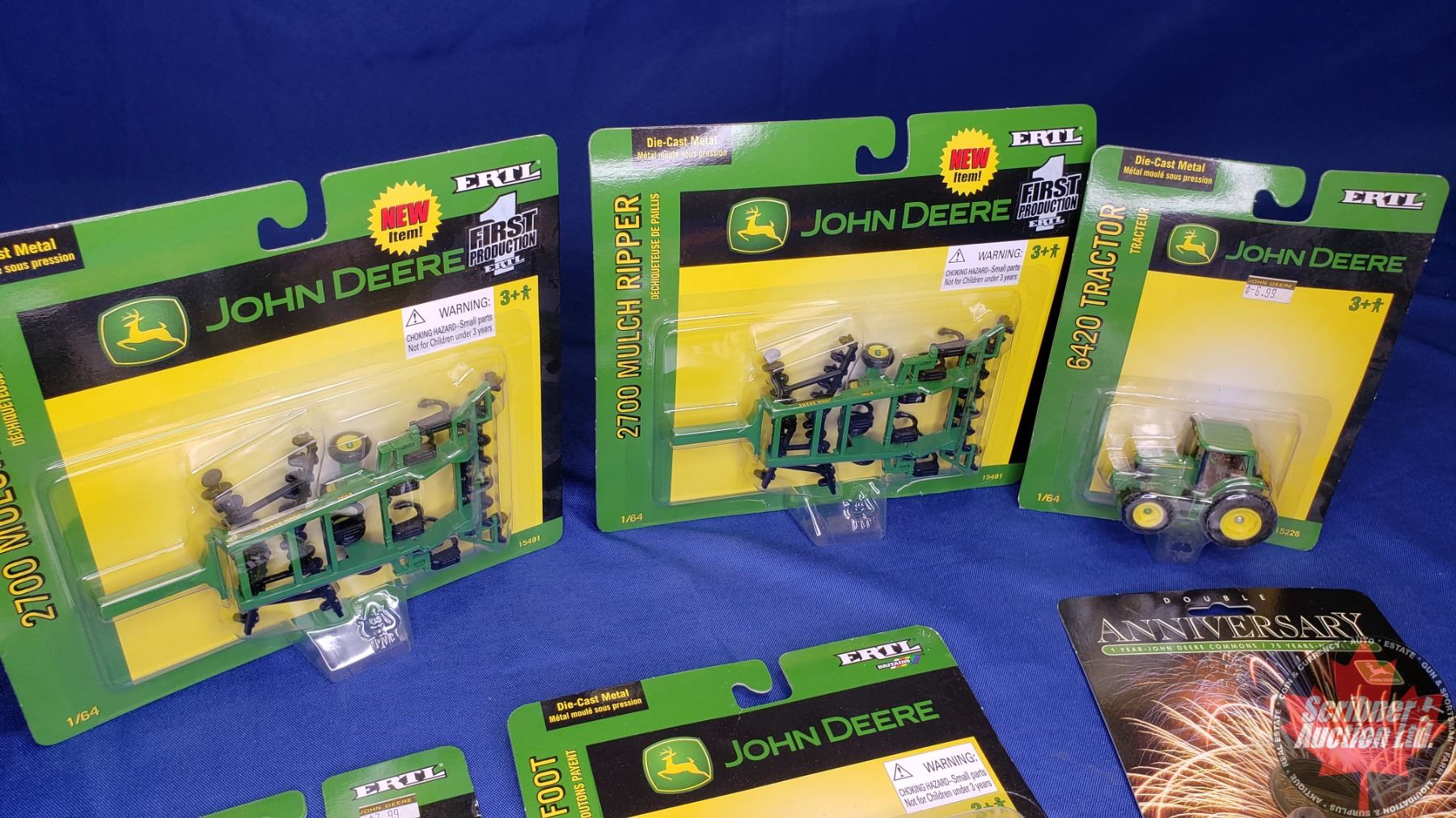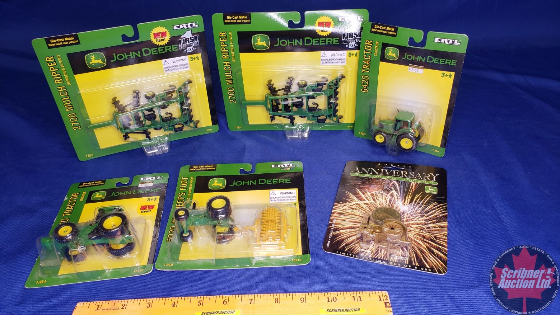 Tray Lot: John Deere Tractors (3) & John Deere First Production Mulch Ripper (2) & John Deere 75th Anniversary Tractor w/Coin (6 Pkgs) (Scale: 1/64) (See Pics!)