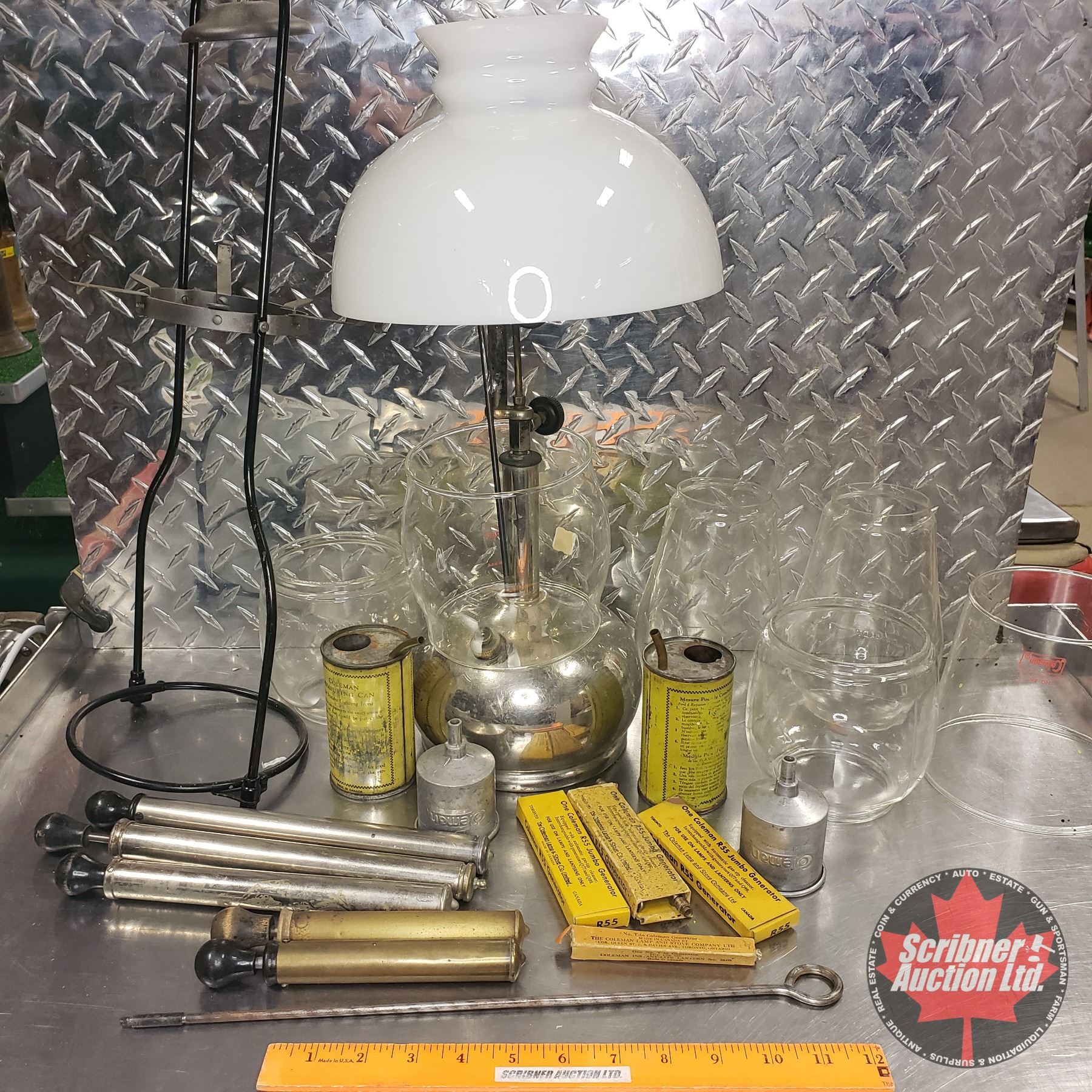 Tray Lot - Lantern Items: (Incl: Lantern Globes, Pumps, Funnel, Measuring Cans & Generators, Coleman Lantern) See Pics!