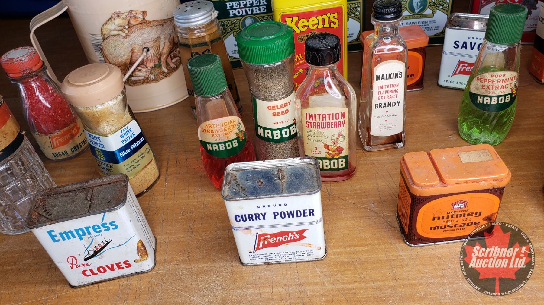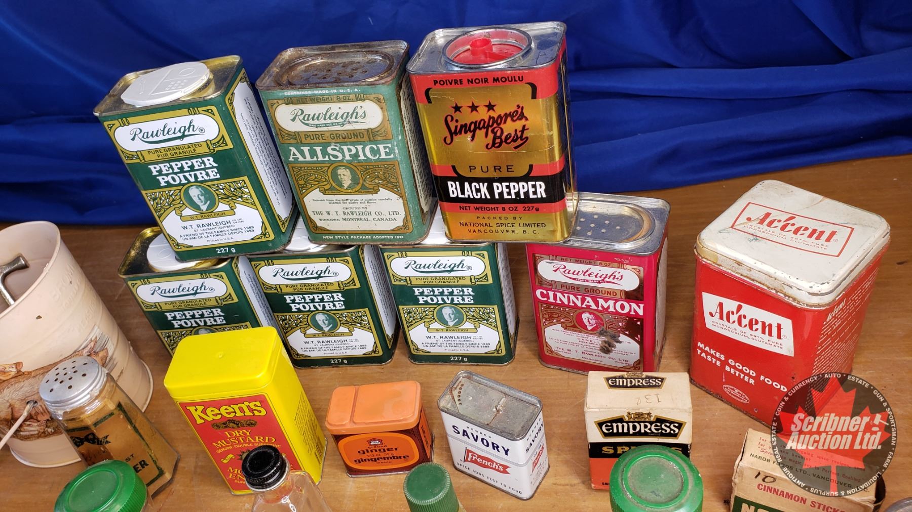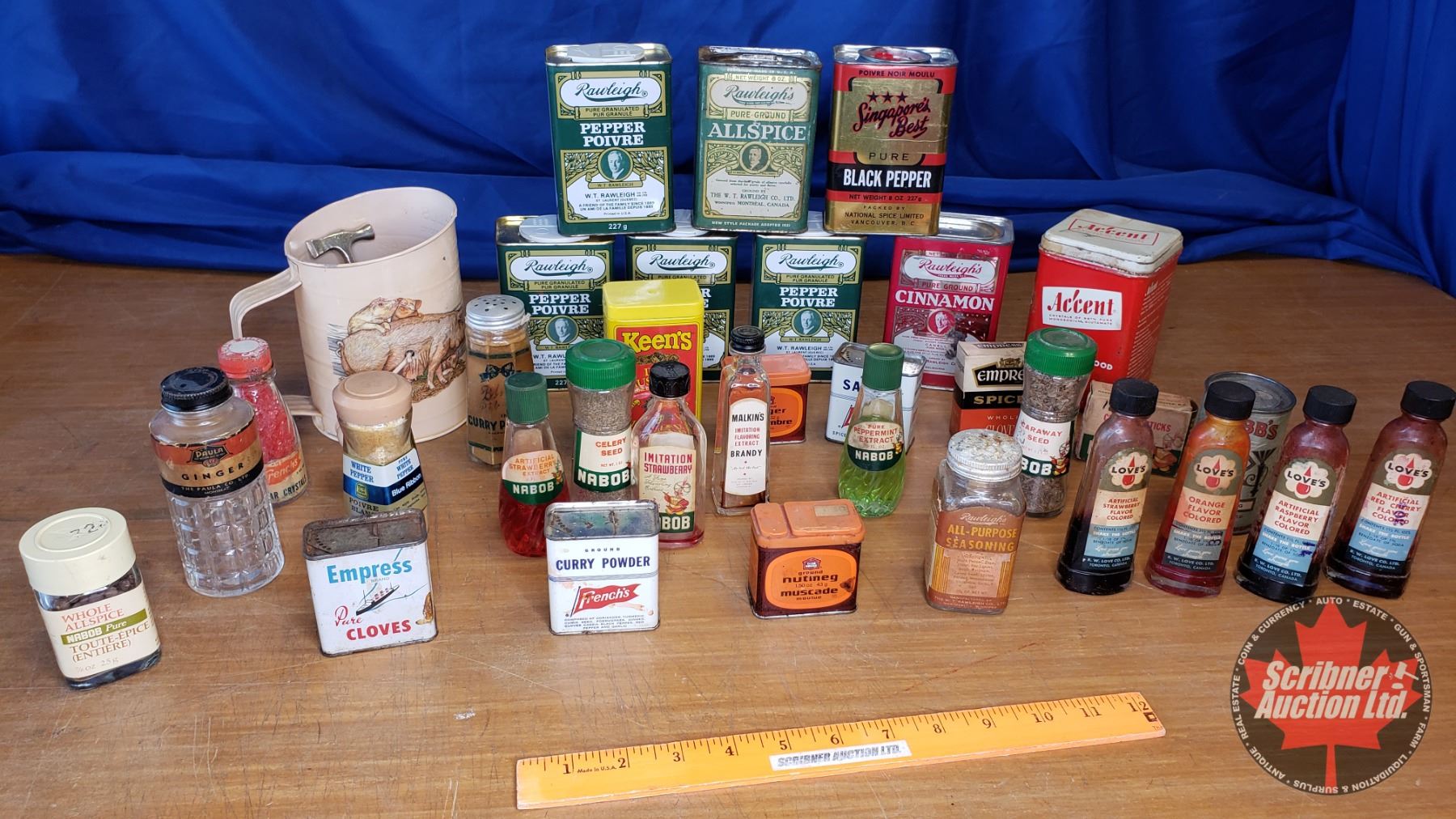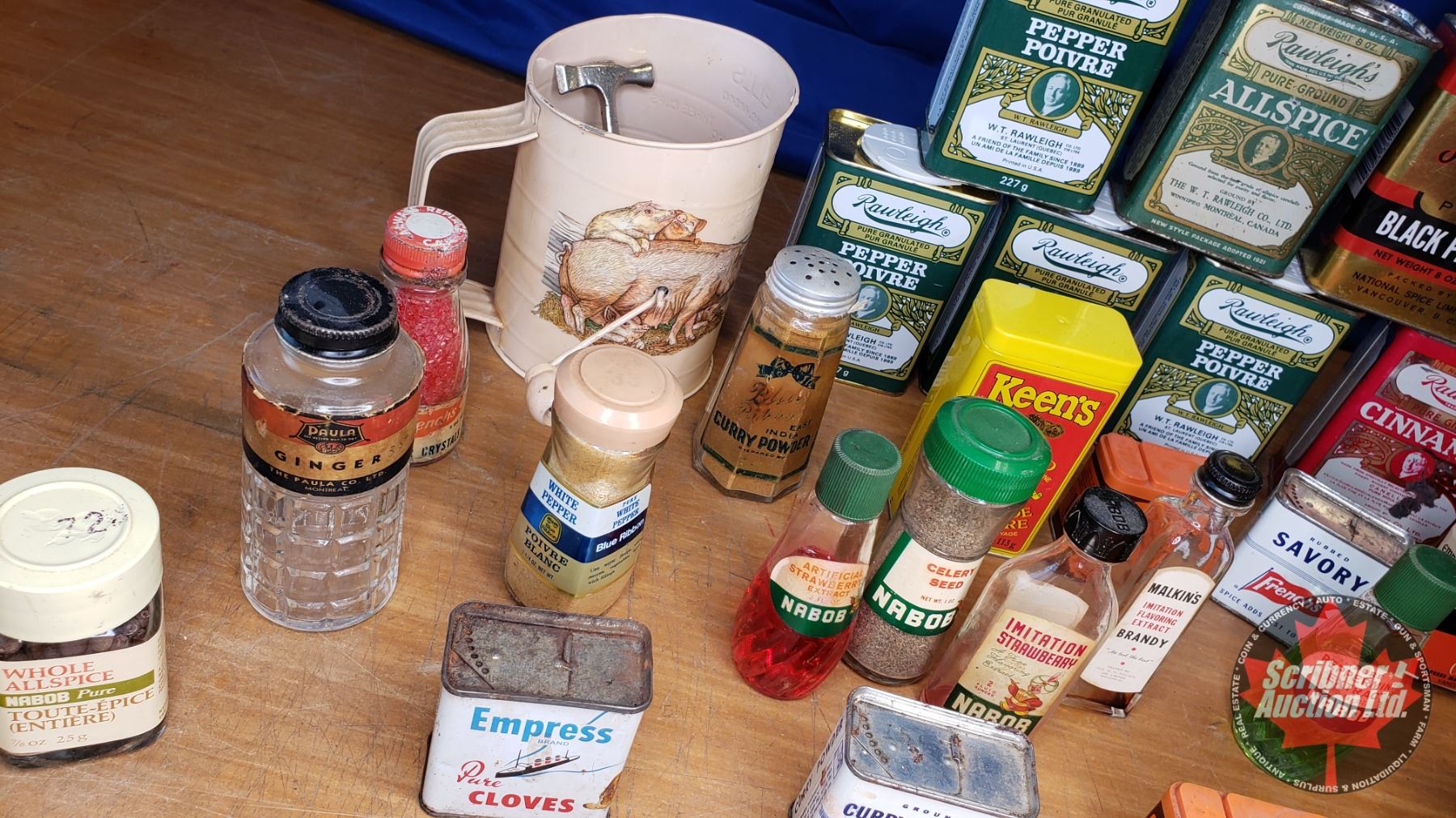 Tray Lot: Old Spice Tins & Bottles, Flour Sifter, Toffee Hammer (See Pics)