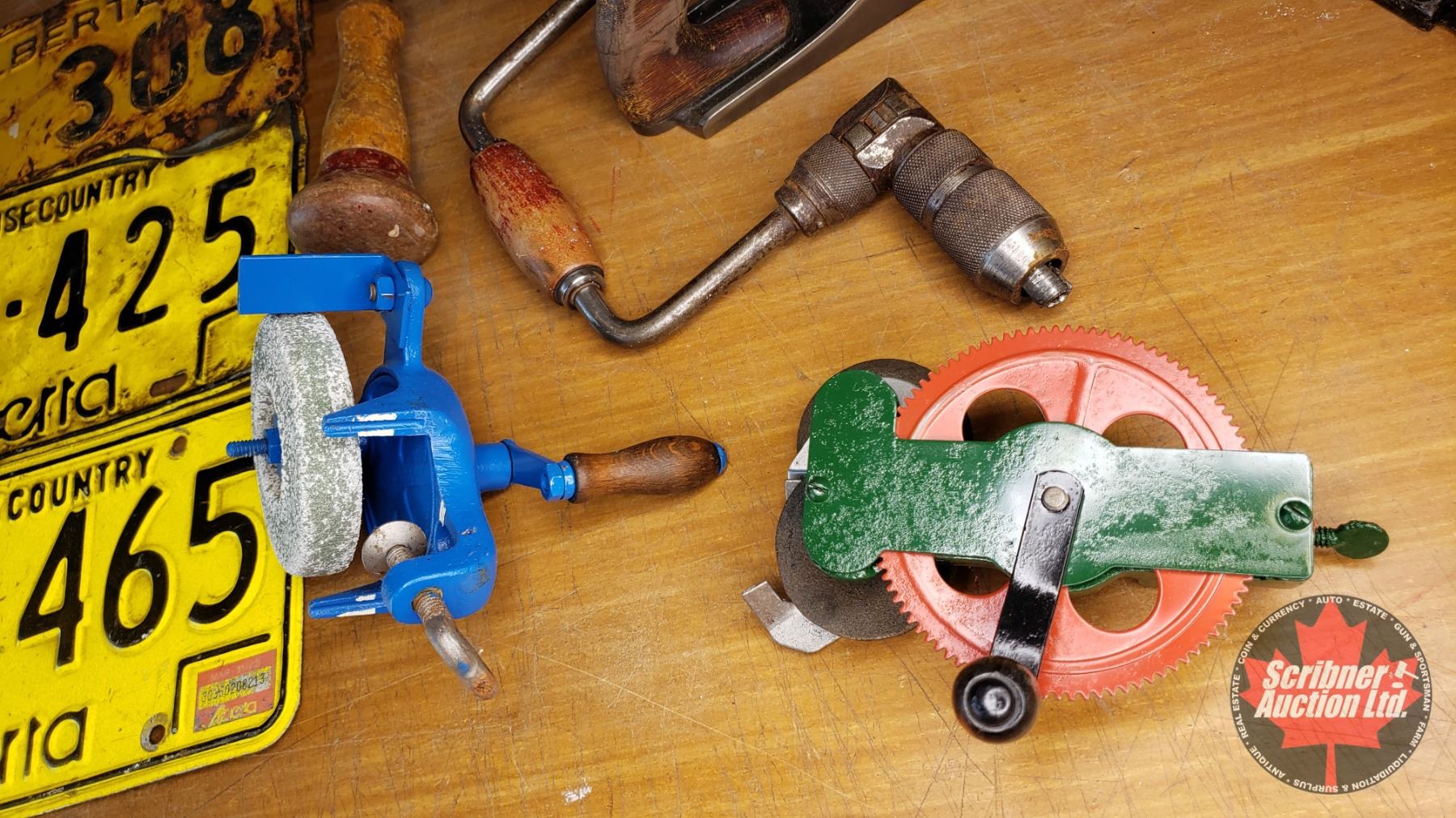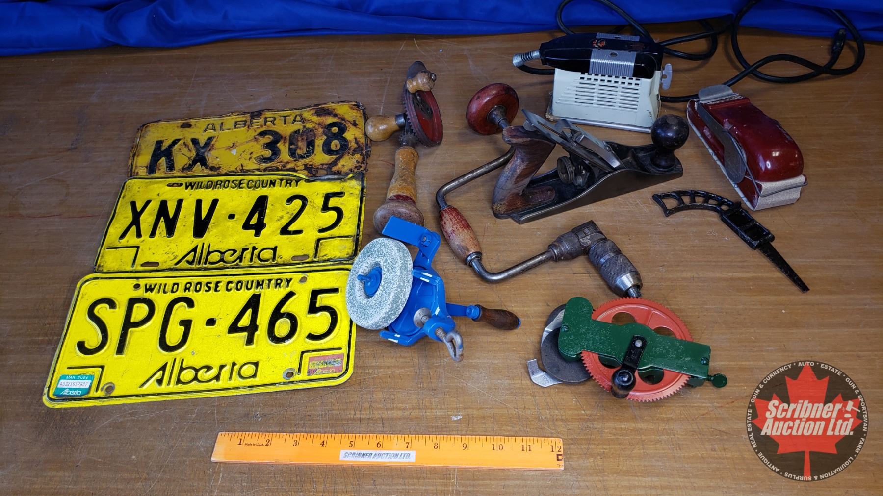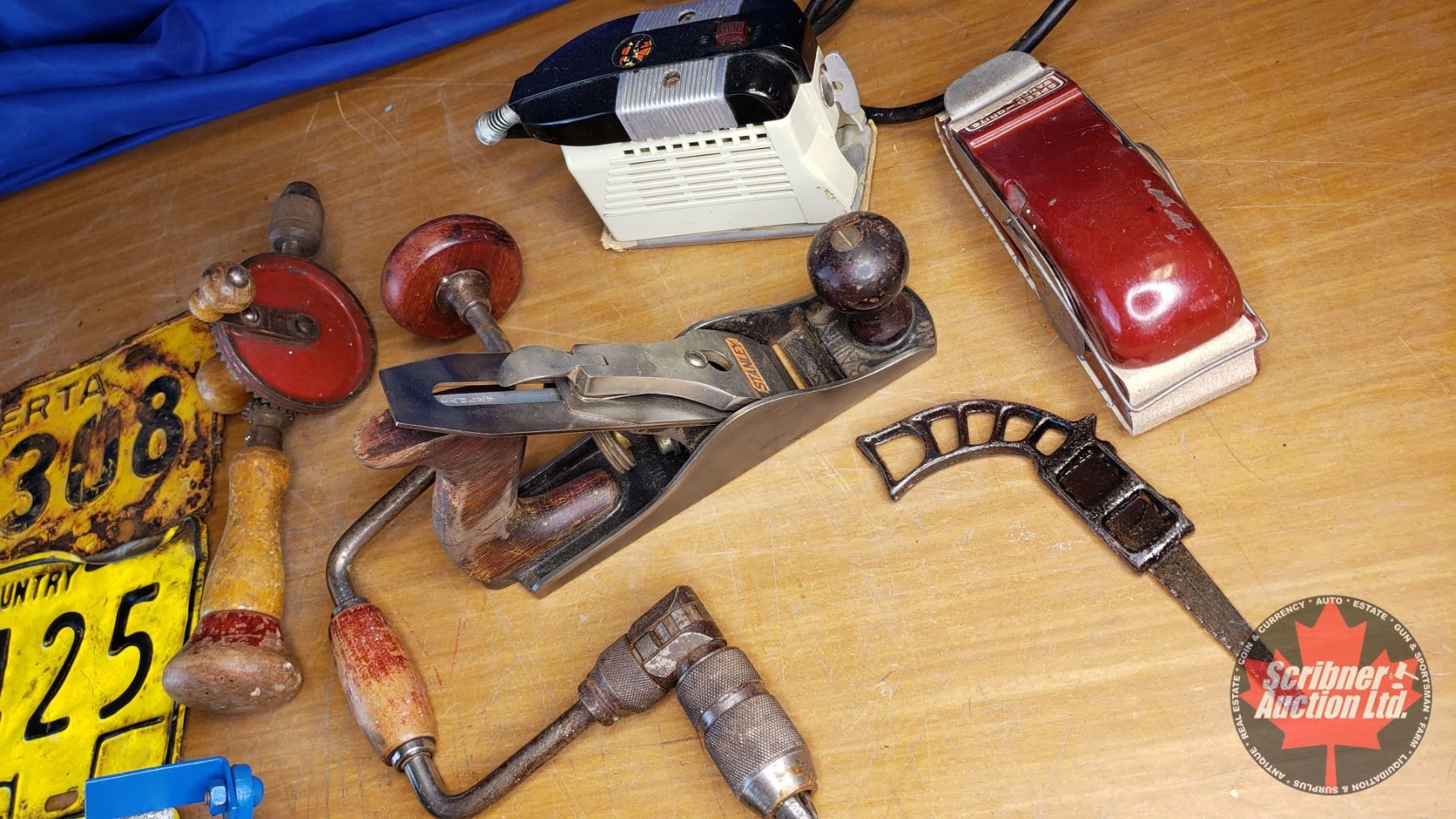 Tray Lot: Palm Sander, Stanley Wood Plane, Small Grinding Wheels, Electric Palm Sander, Lic Plates, Brace, etc (See Pics!)