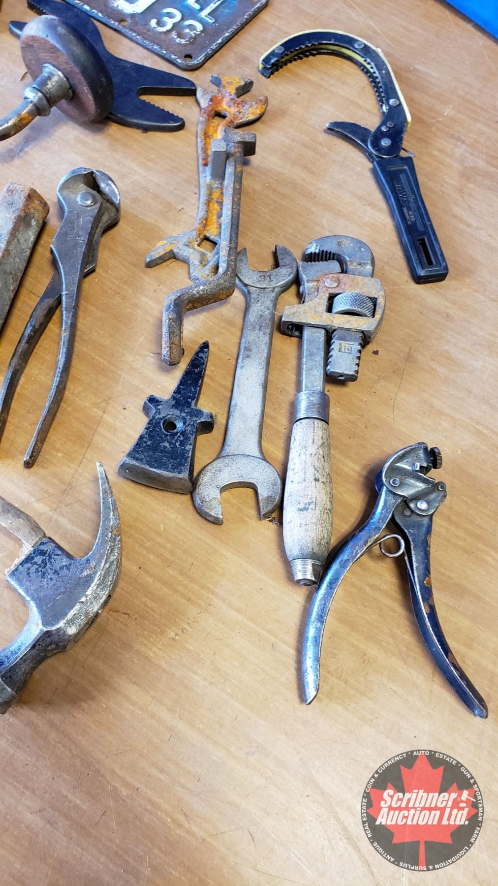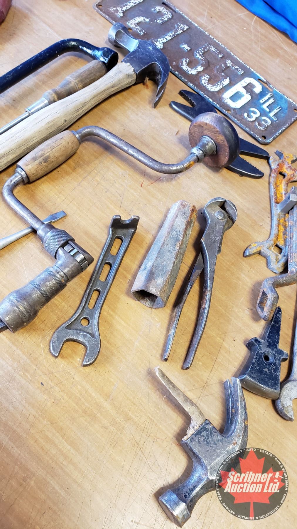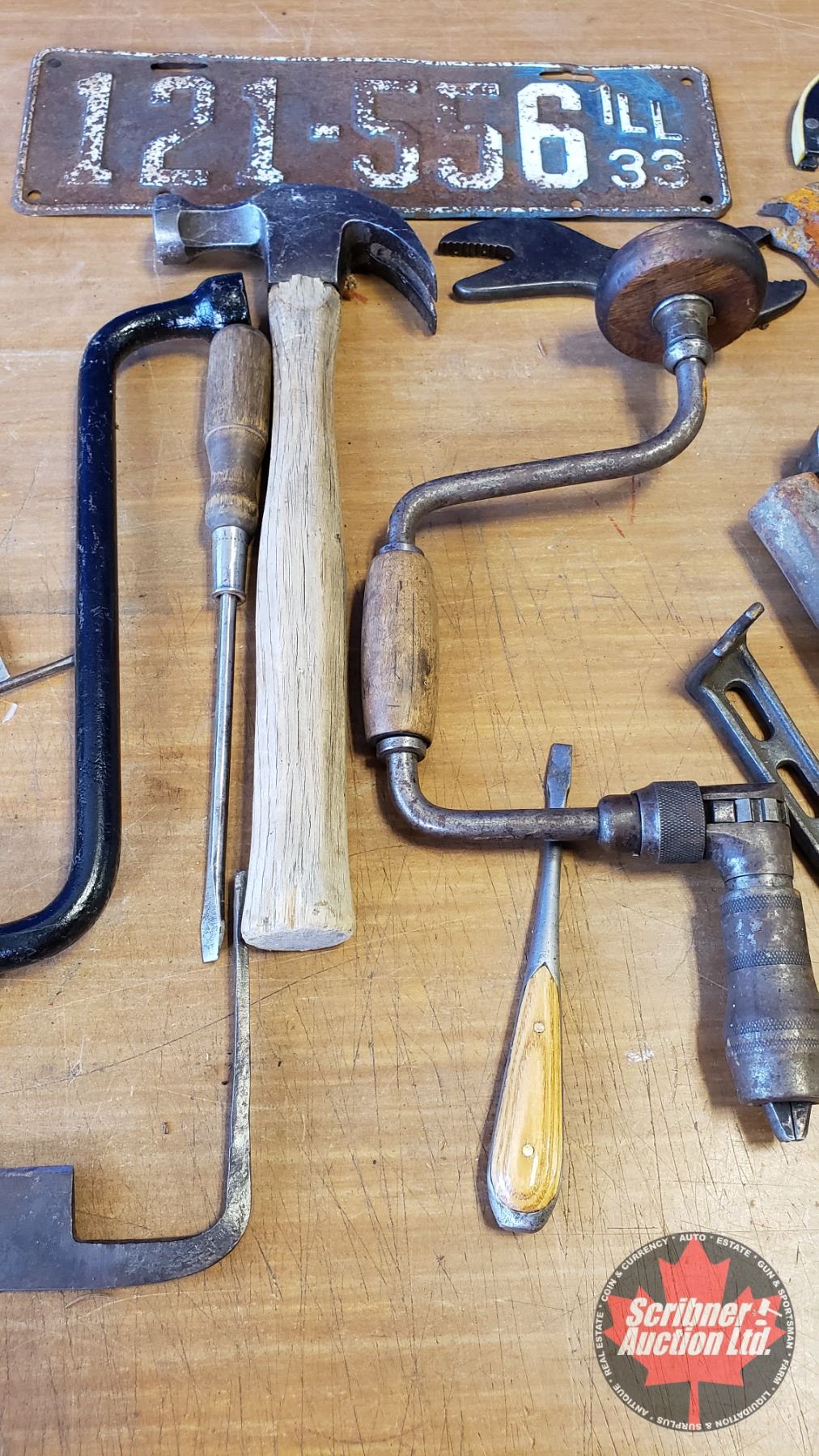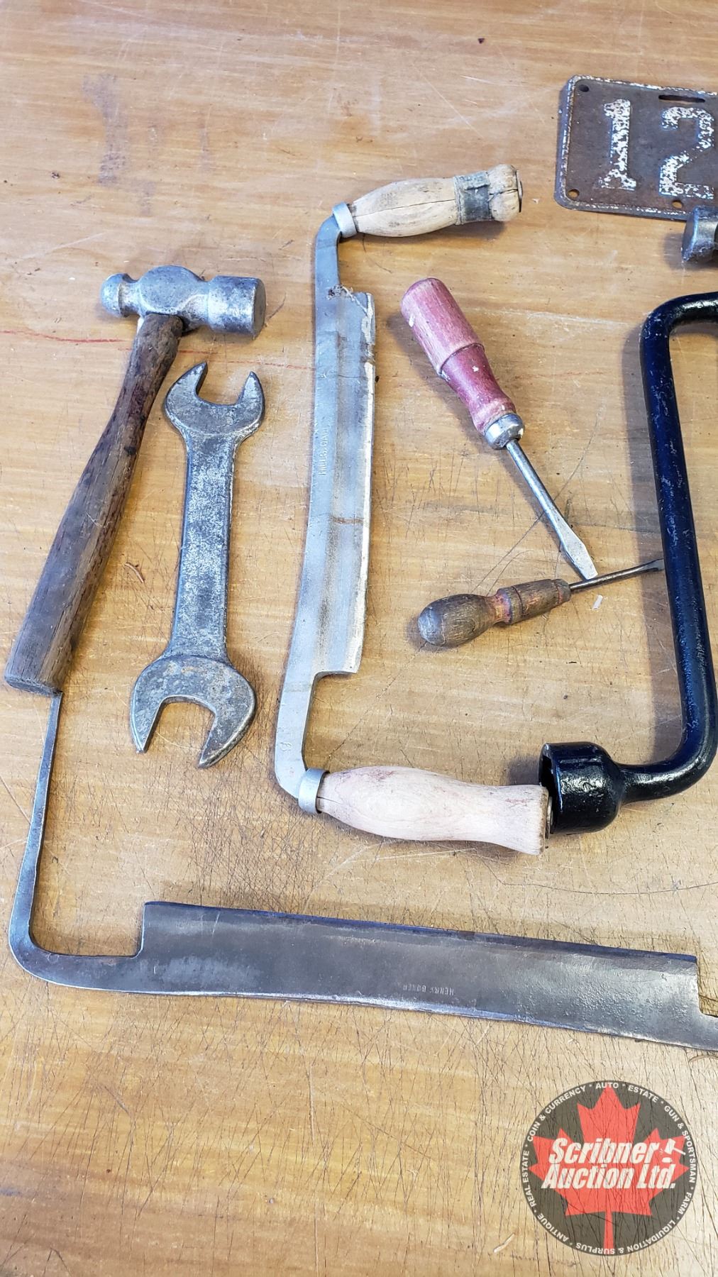 Tray Lot - Tools (Draw Knives, Wrenches, Hammer, Screw Drivers, 1933 Illinois Lic Plate, etc)