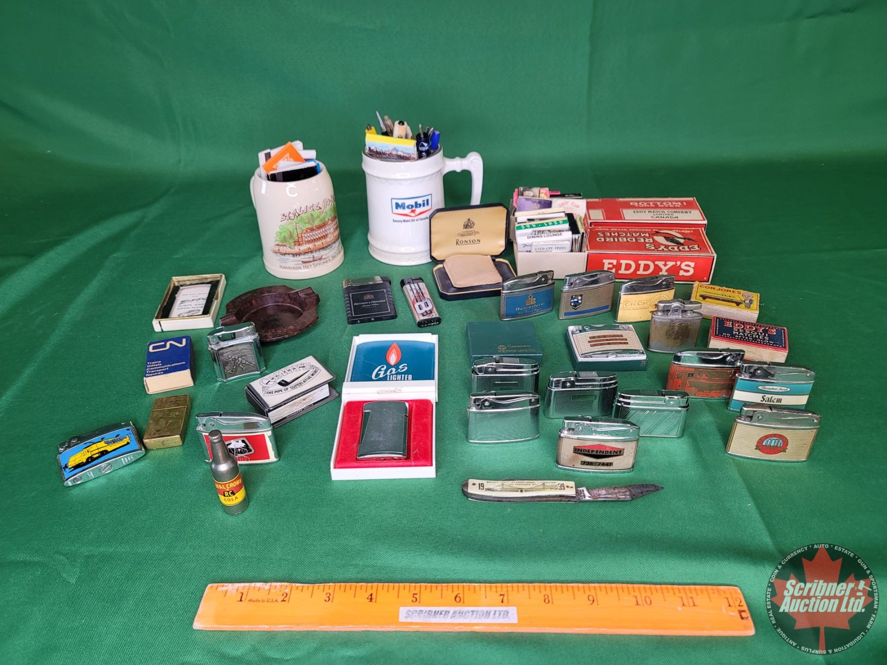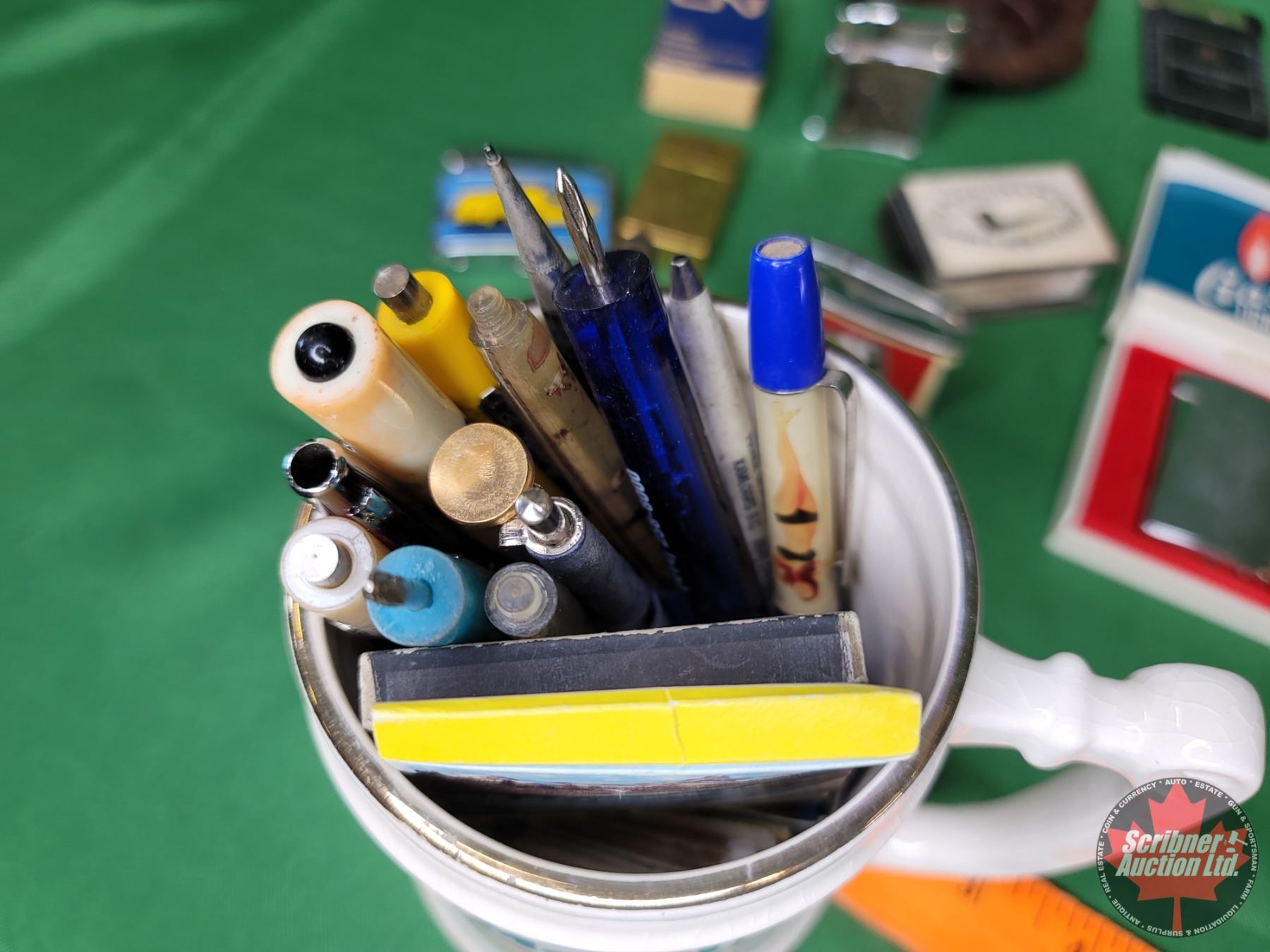 Tray Lot: Variety Lighters, Matches, Ashtray, Pens & Mugs (Must See!) (See Pics!)