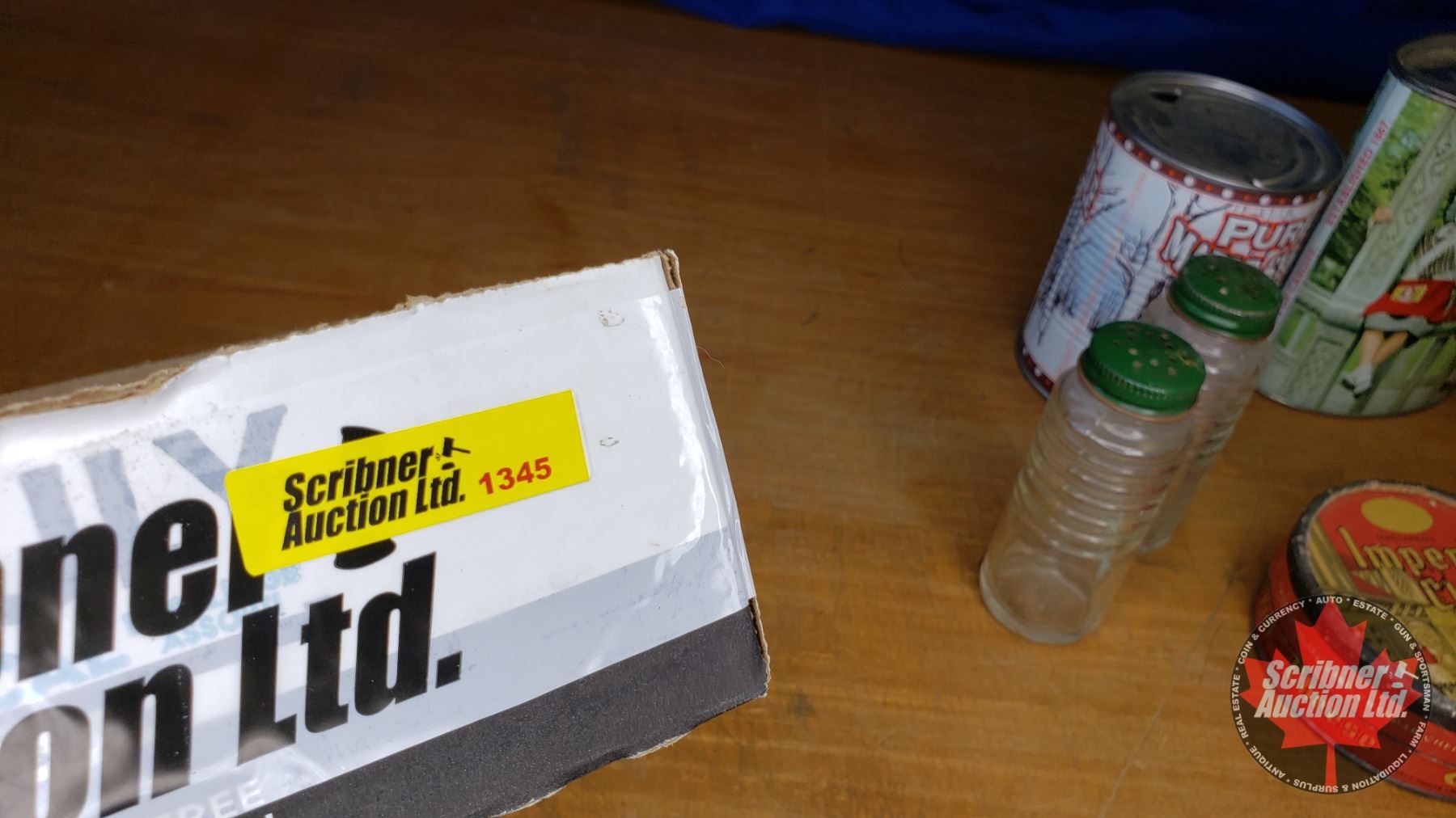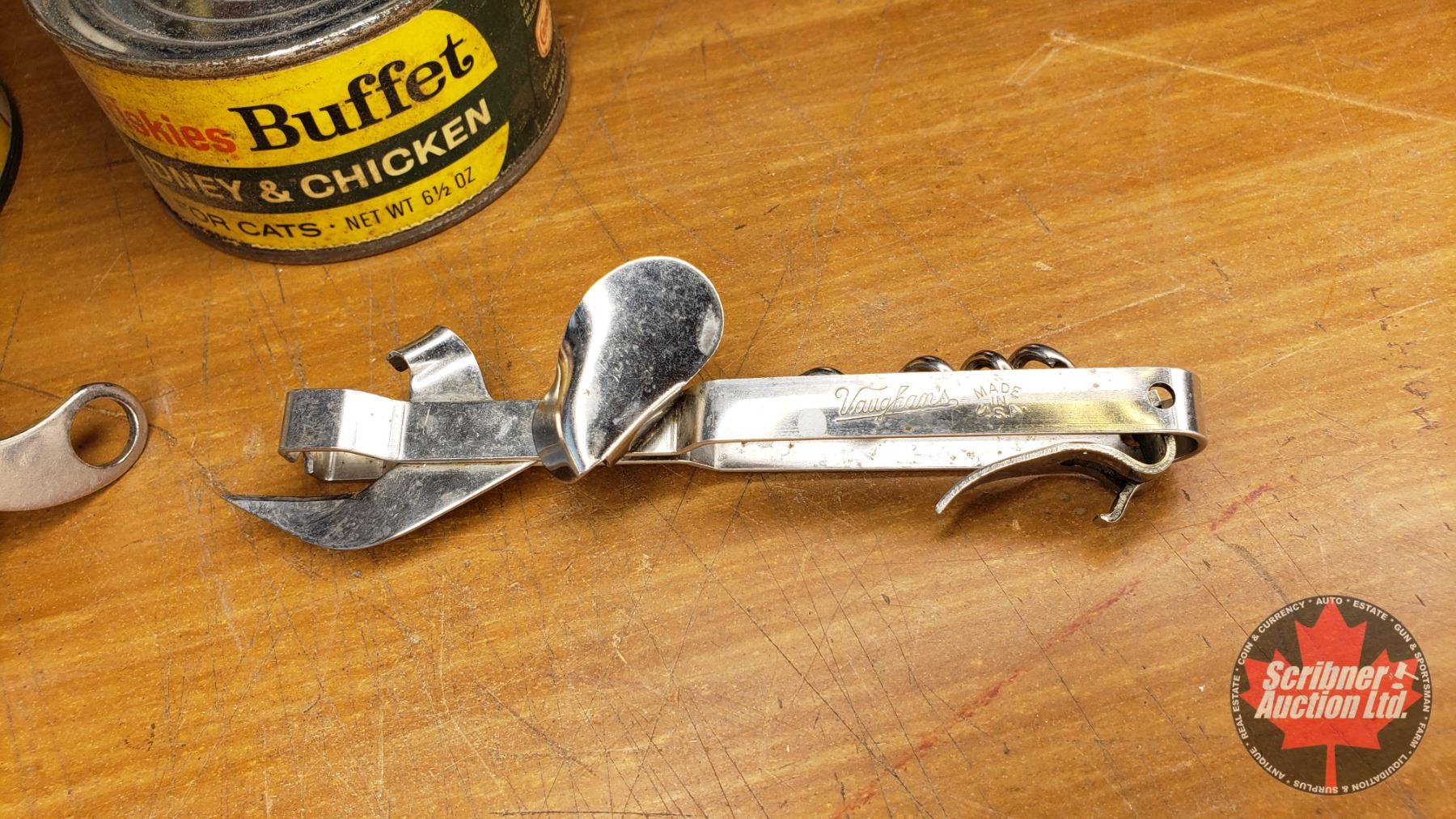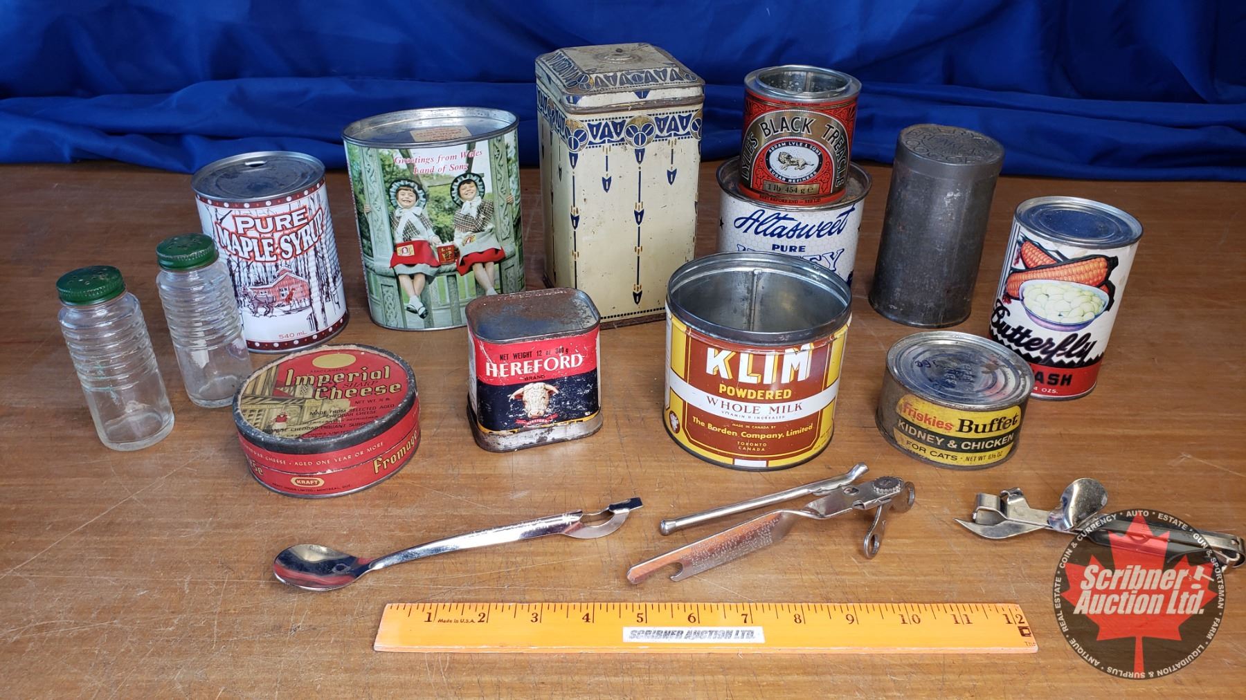 Tray Lot: Variety of Confectioner Tins, Salt & Pepper Shakers, Can Openers (See Pics)