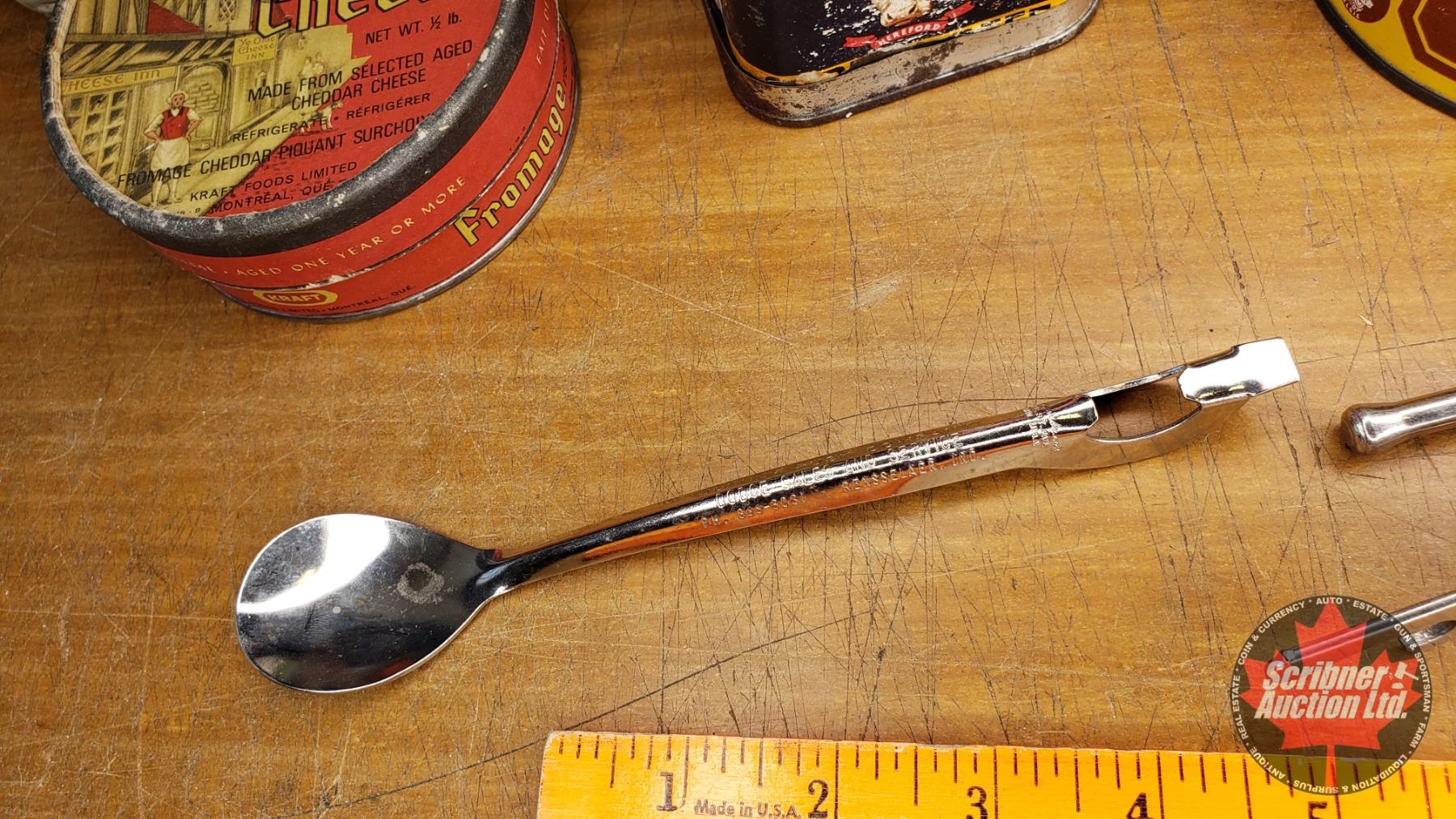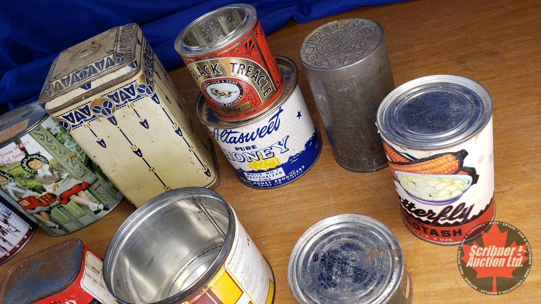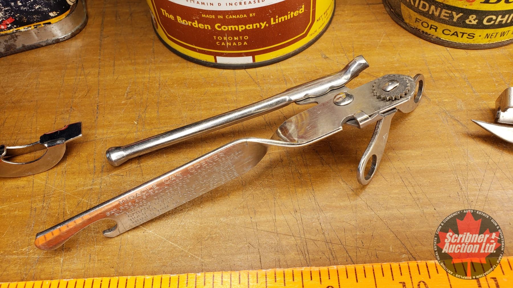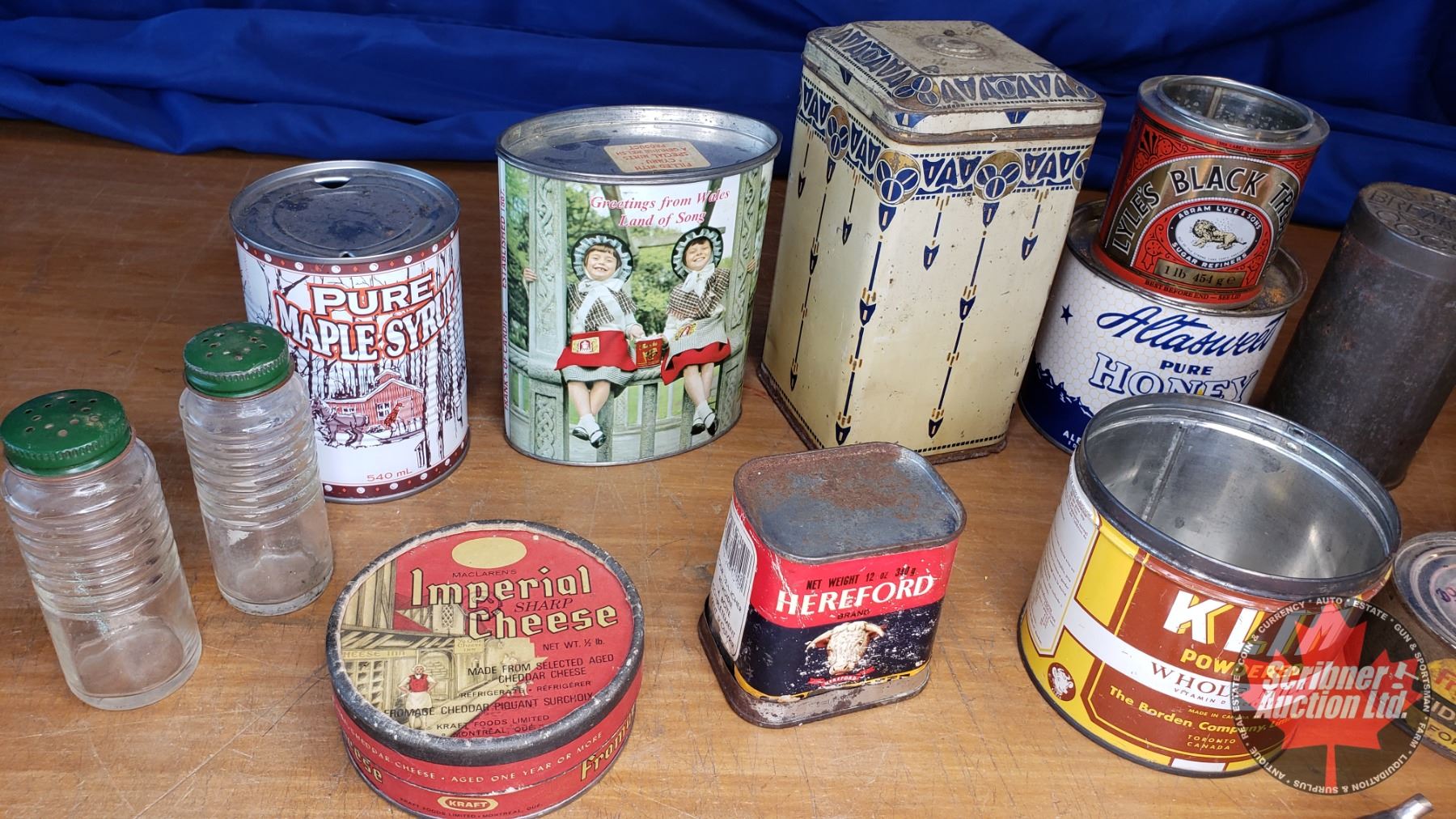 Tray Lot: Variety of Confectioner Tins, Salt & Pepper Shakers, Can Openers (See Pics)