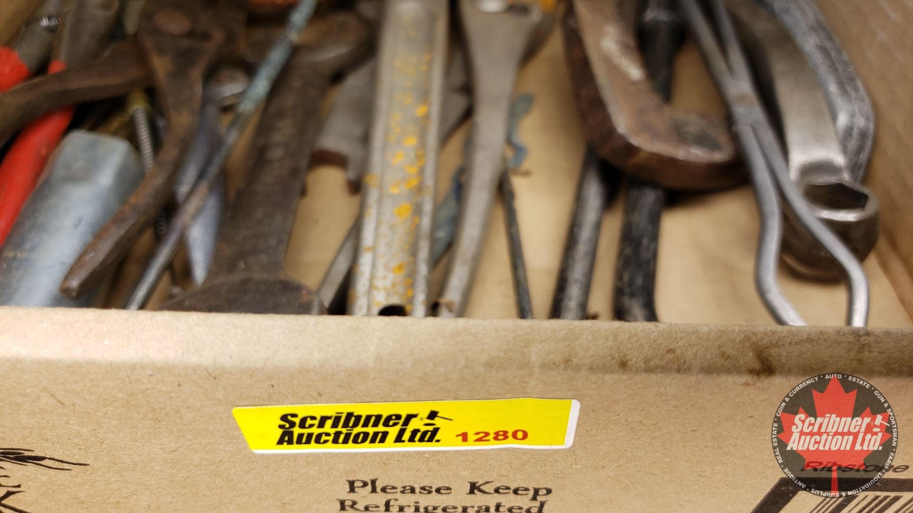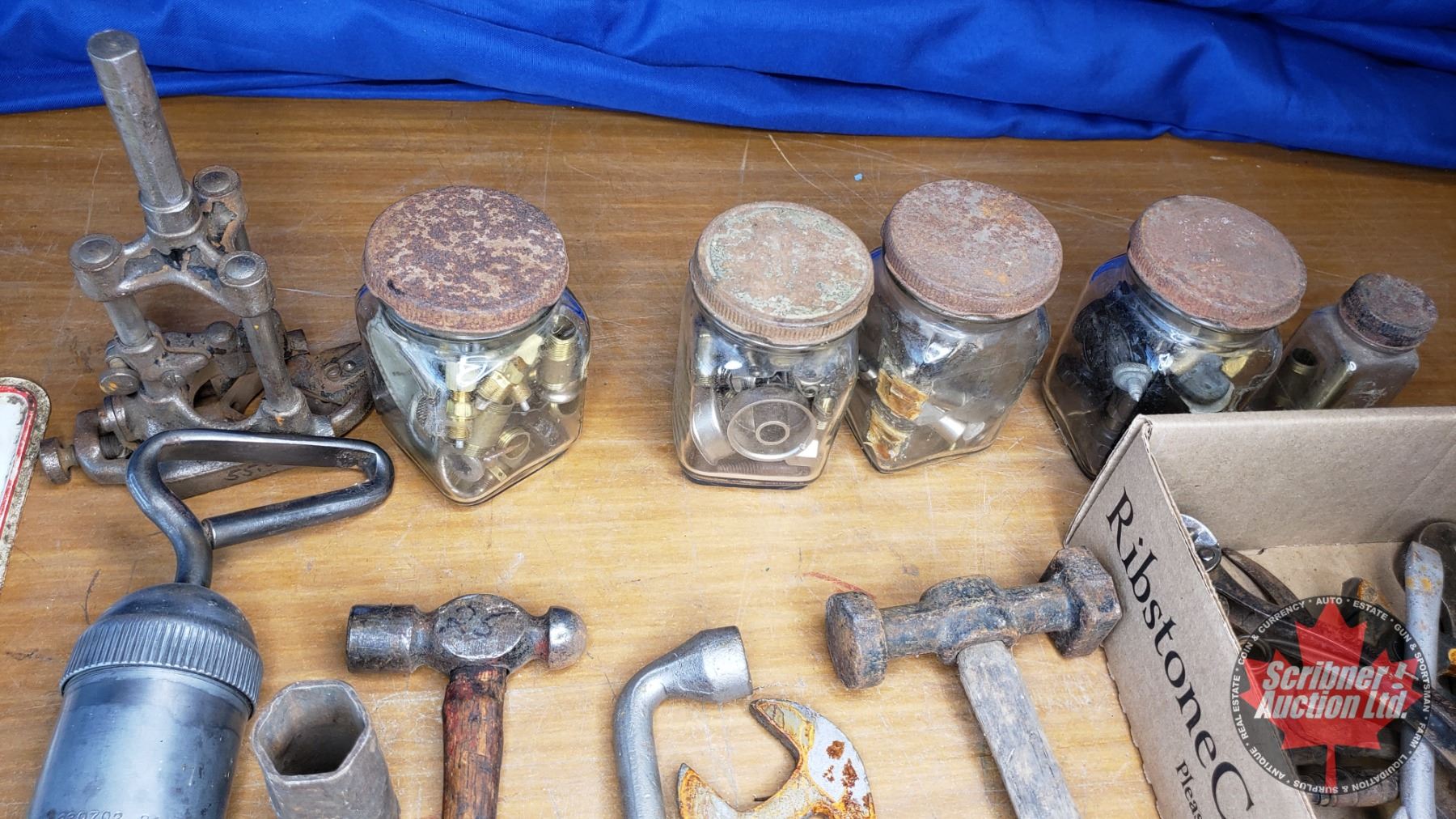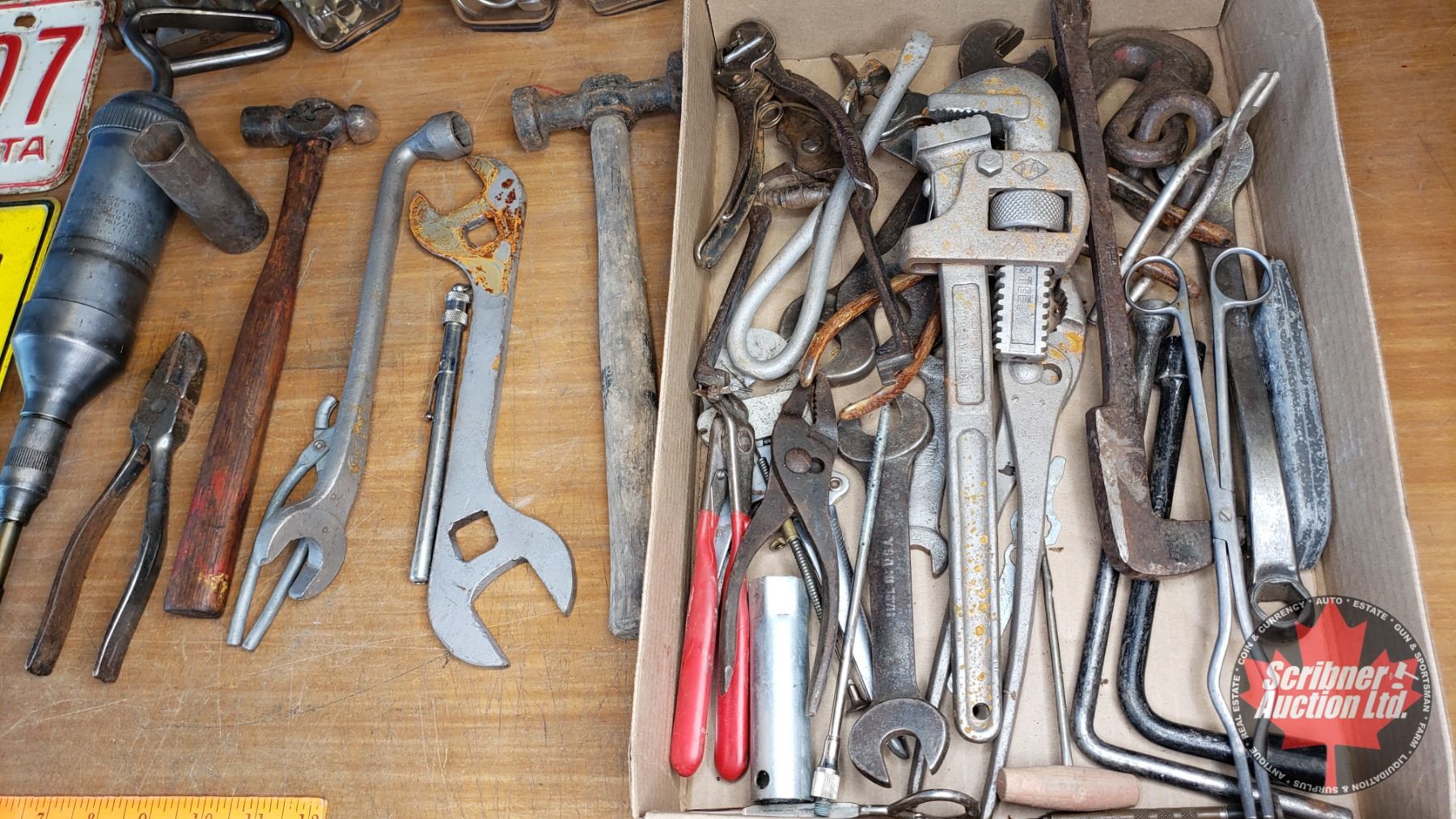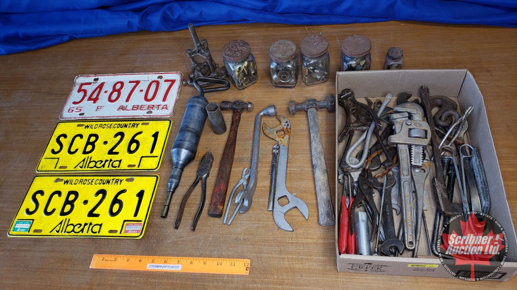 Tray Lot: Vintage Tools (Grease Gun, Wrenches, Pliers, Jars of Brass Fittings, Lic Plates, Ball Peen Hammer, Spoke Cutter, etc) (See Pics!)