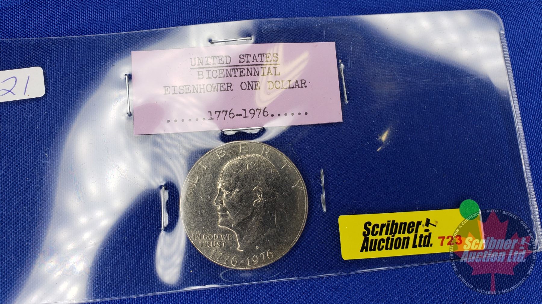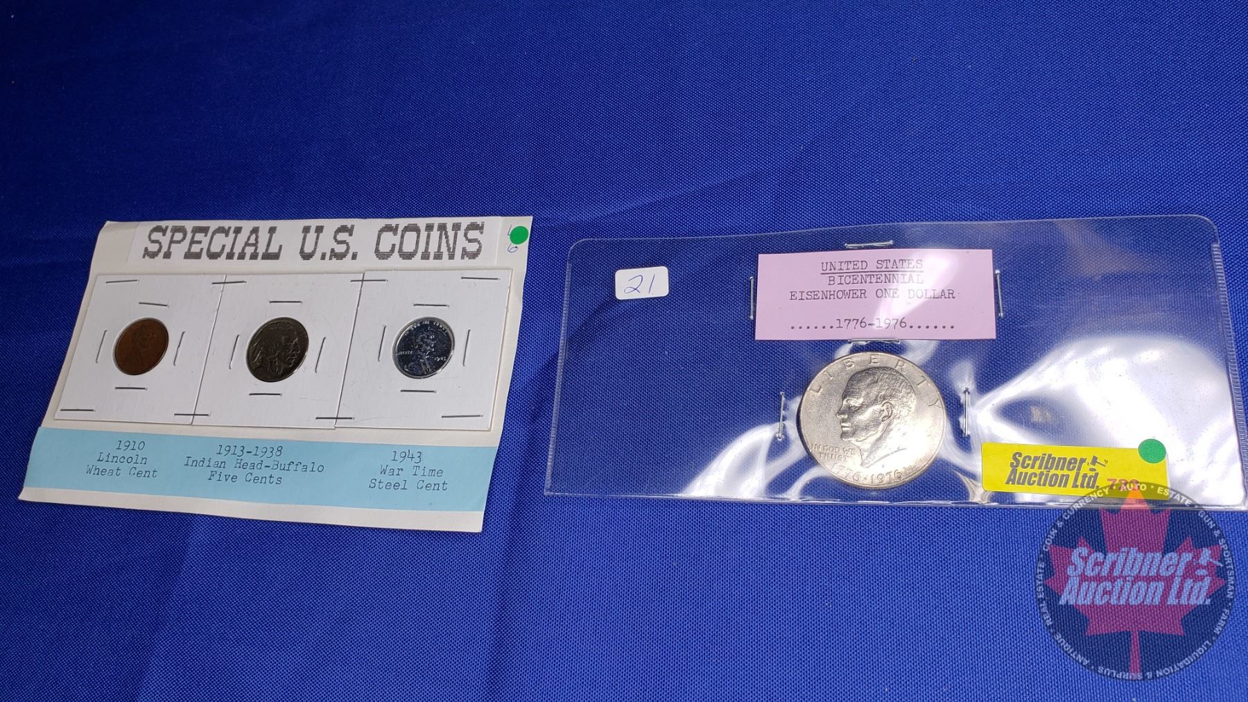 US Coins (4) : One Cent, Five Cent, Steel War Time Cent & 1976 Eisenhower Dollar