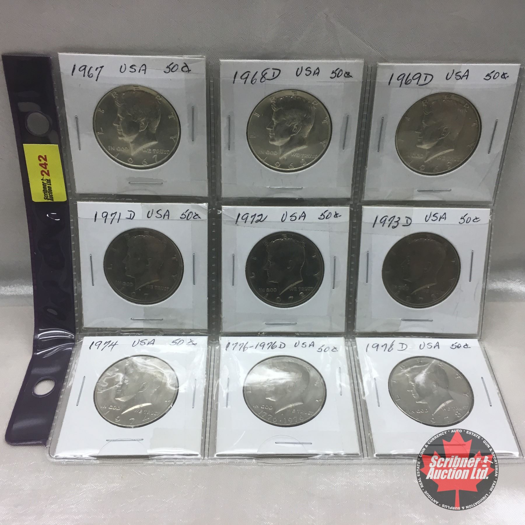 US Fifty Cent - Sheet of 9: 1967; 1968D; 1969D; 1971D; 1972; 1973D; 1974; 1776-1976D; 1978D