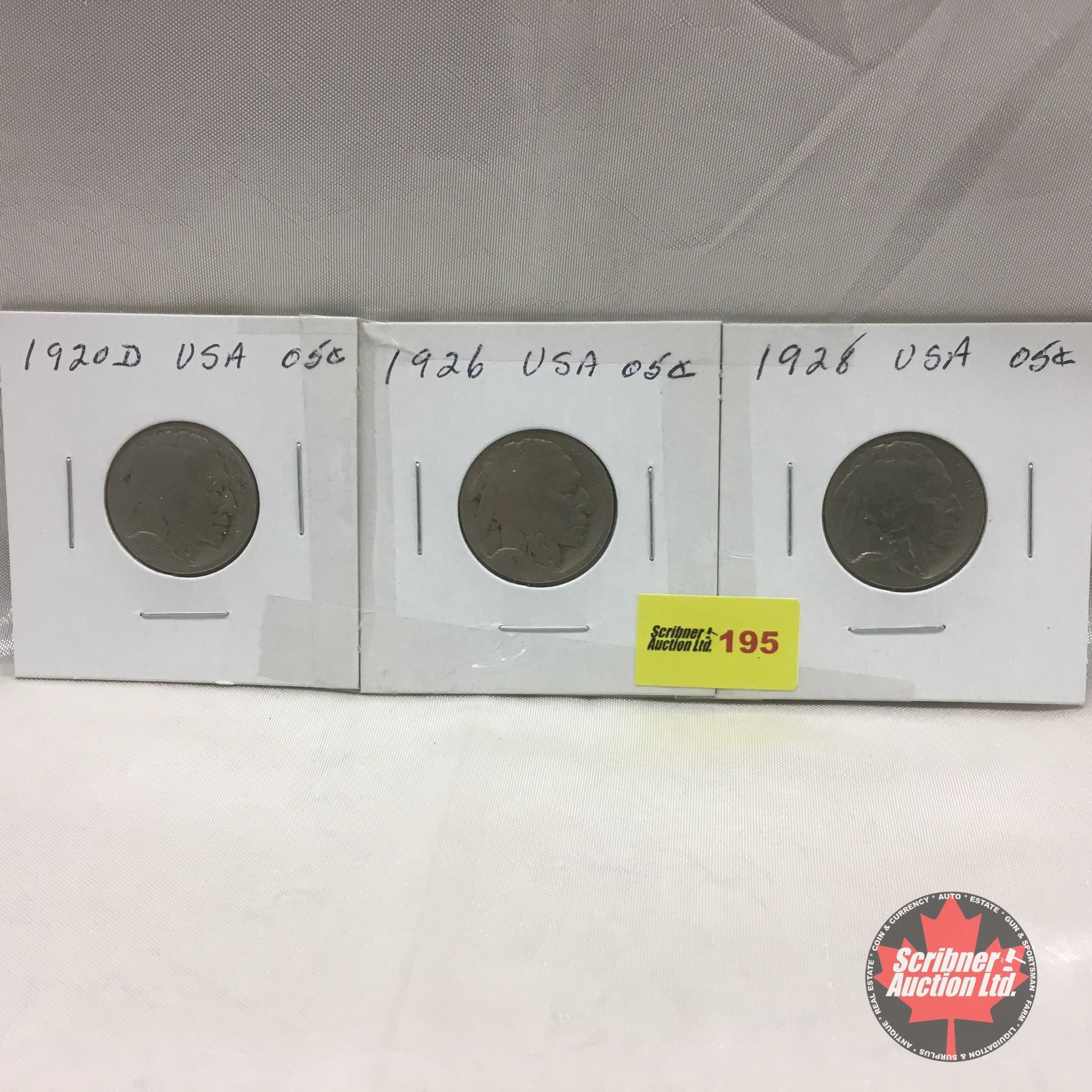 US Five Cent - Strip of 3: 1920D; 1926; 1928