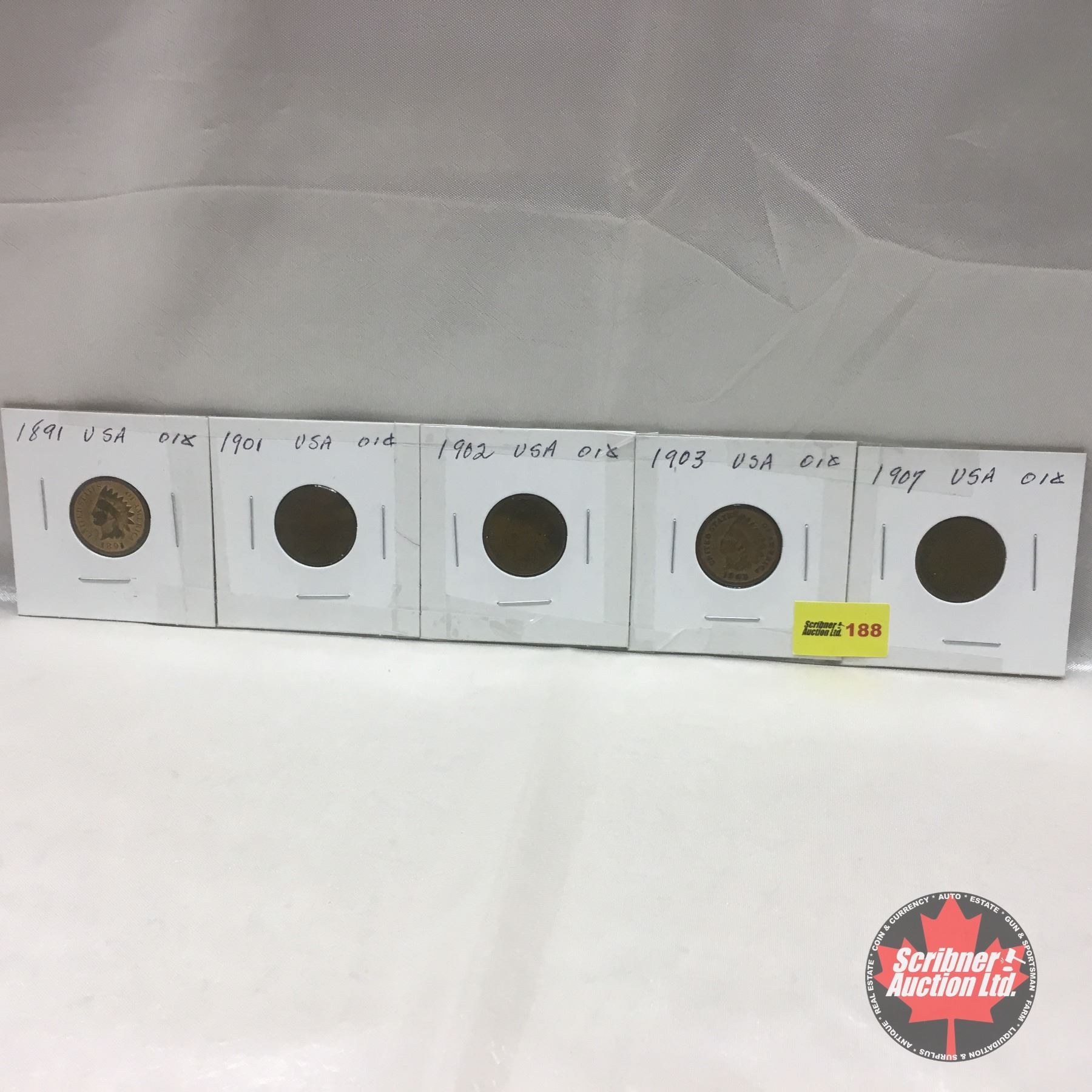 US One Cent - Strip of 5: 1891; 1901; 1902; 1903; 1907