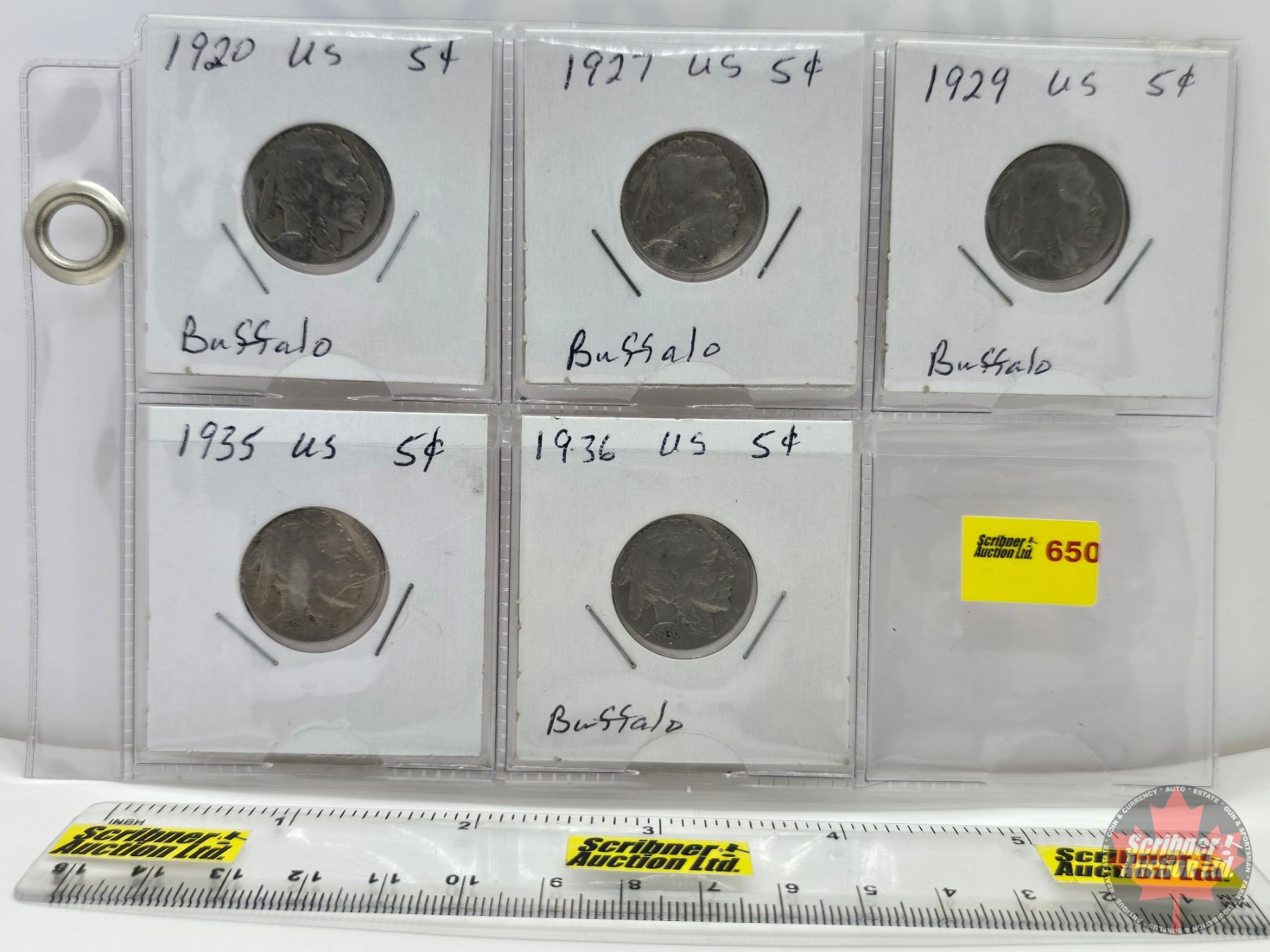 USA Five Cent (5): 1920; 1927; 1929; 1935; 1936 (SEE PICS!) (Listing & Descriptions are a GUIDE ONLY and are subject to changes, errors, additions or deletions. Please use the provided pictures to satisfy yourself to the Condition and/or Grades. Please Read & Understand All Terms & Conditions for this Auction Sale.)