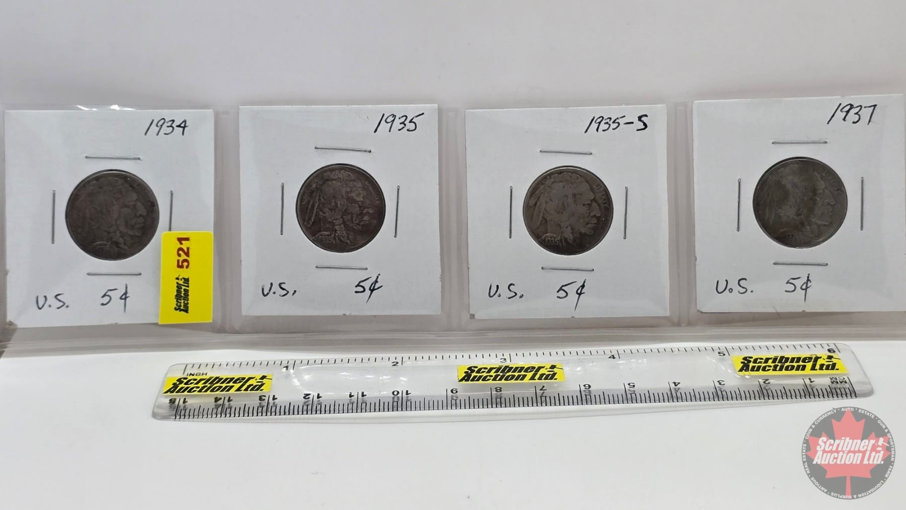 USA Nickels (4): 1934; 1935; 1935S; 1937 (SEE PICS!) (Listing & Descriptions are a GUIDE ONLY and are subject to changes, errors, additions or deletions. Please use the provided pictures to satisfy yourself to the Condition and/or Grades. Please Read & Understand All Terms & Conditions for this Auction Sale.)