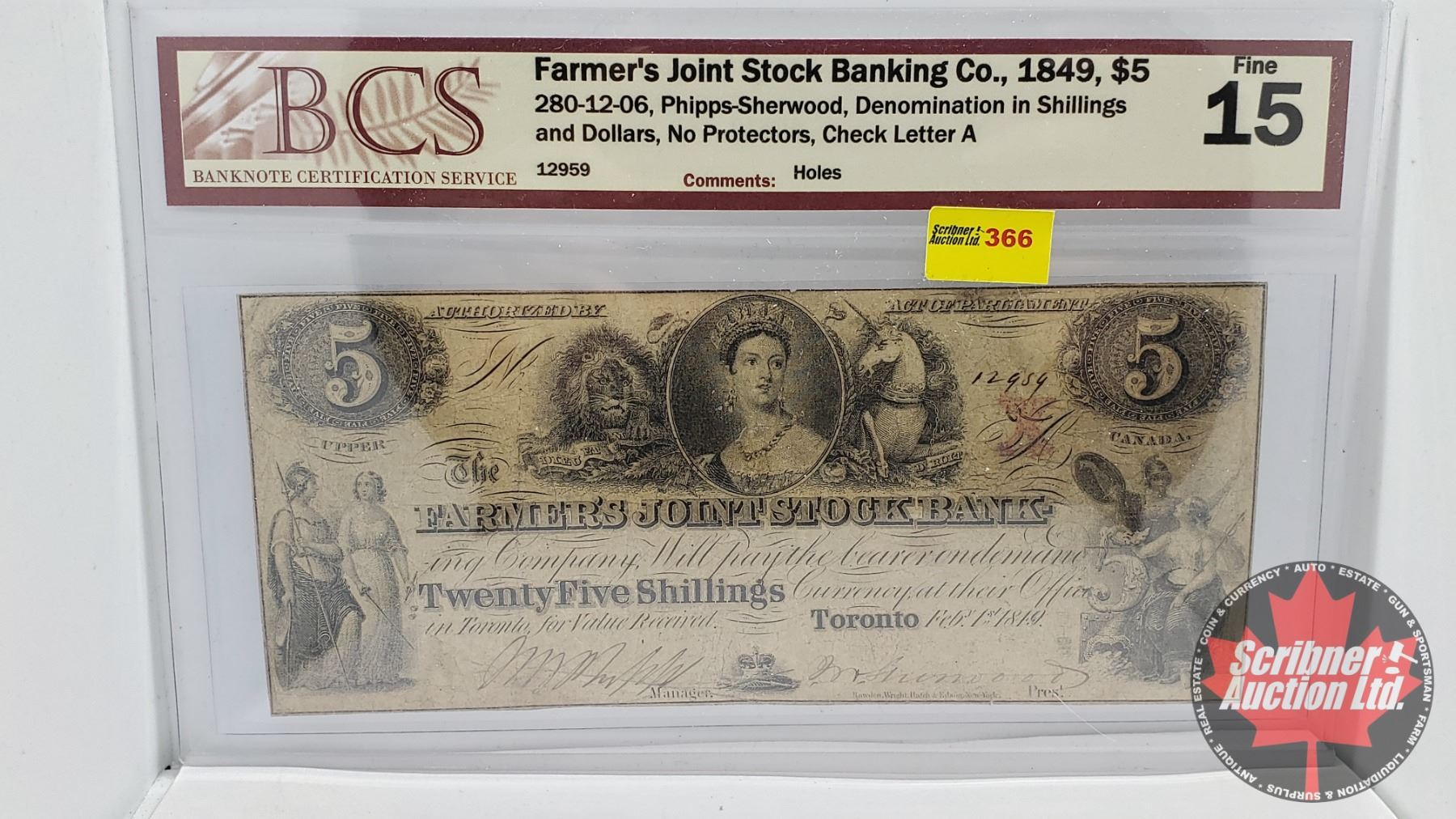 Upper Canada : Farmer's Joint Stock Banking Co. 1849 $5 Bill or Twenty Five Shillings (BCS Certified : Fine 15) (See Pics for Signatures/Serial Numbers)