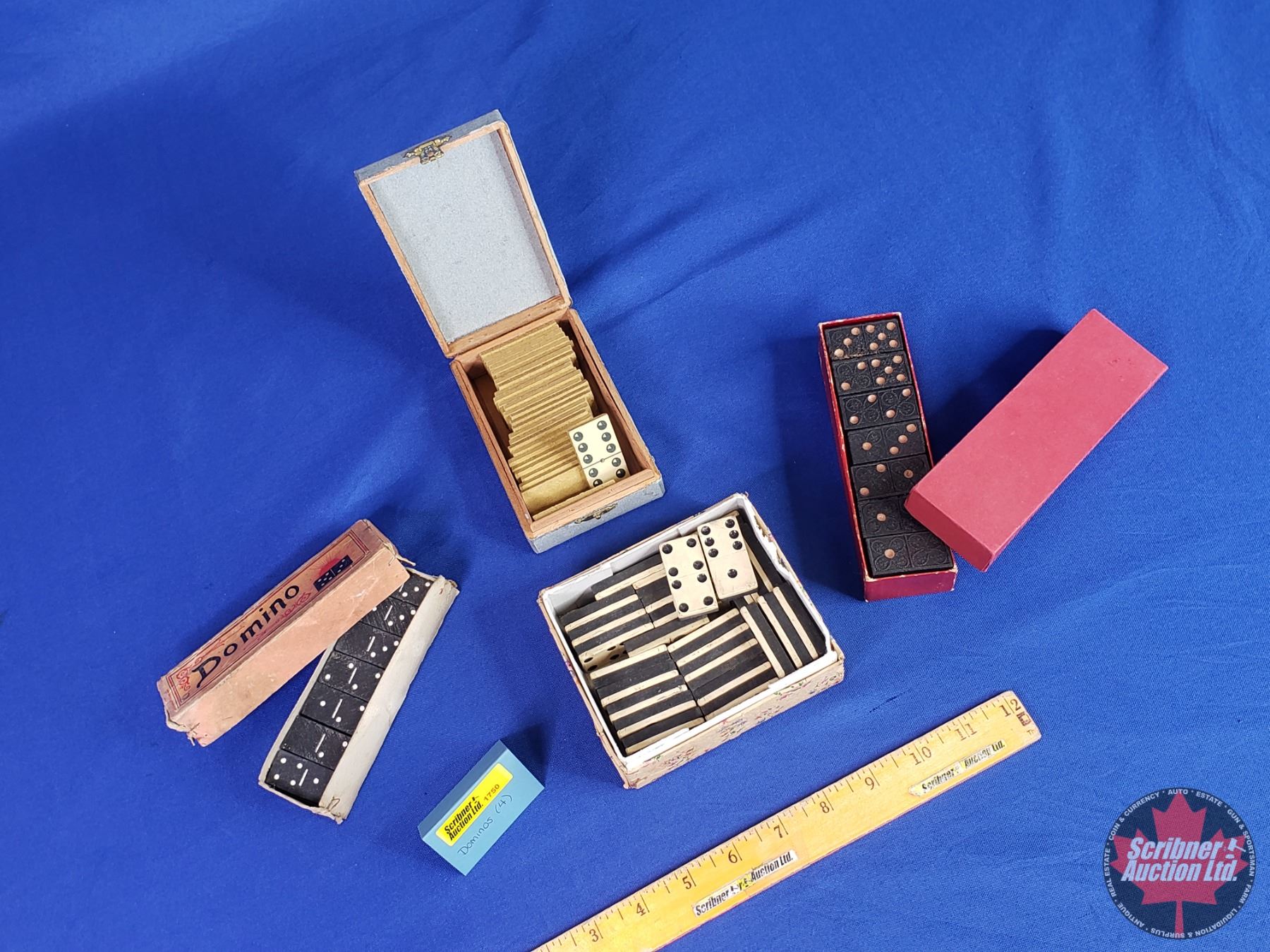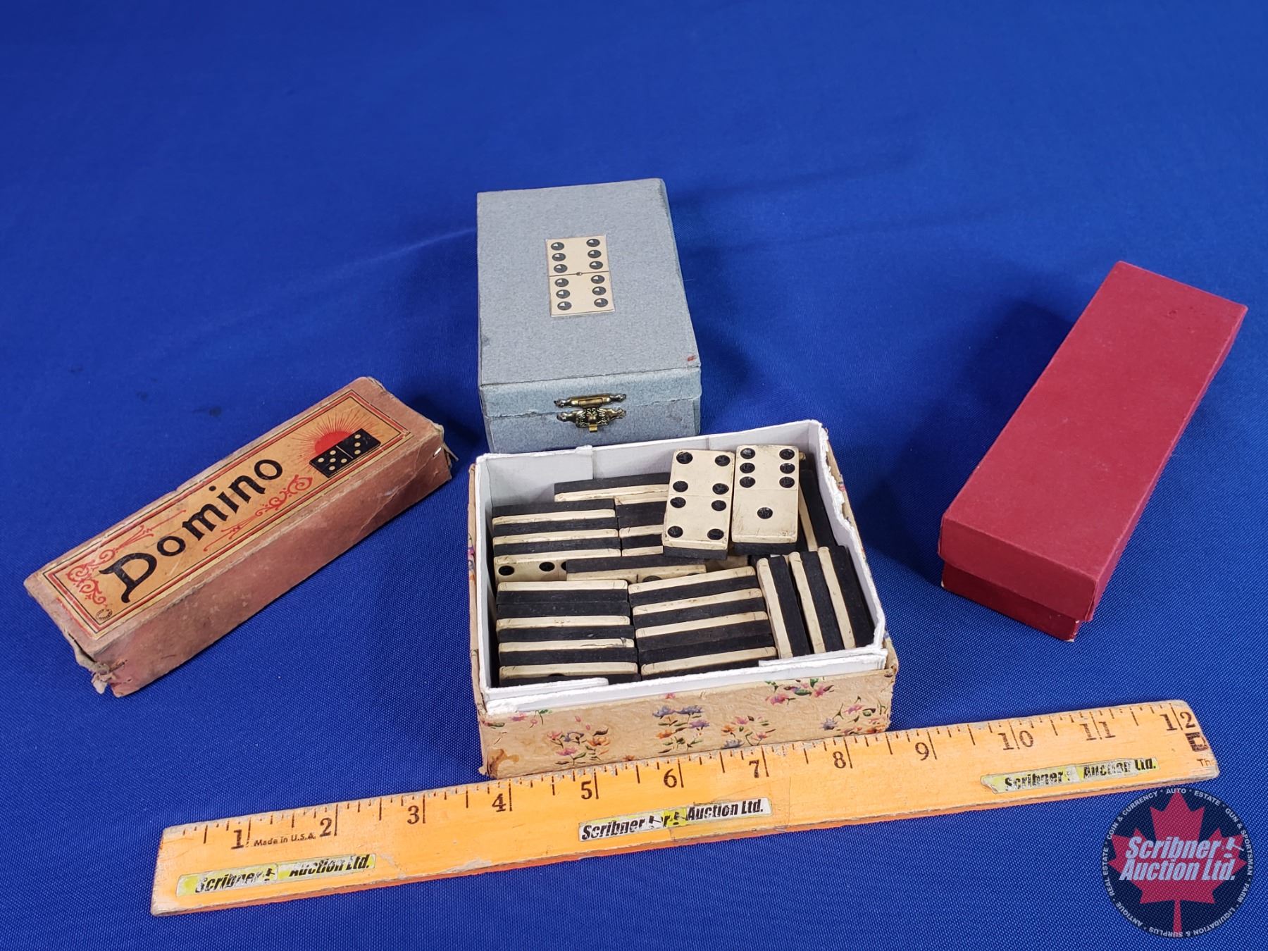 Variety of Vintage/Antique Domino Sets in Boxes (1 Wood - 1 Pressed Board - 2 Hard Plastic / Tiles) (Largest Square Box Measures: 2"H x 5"W x 4"D) (SEE PICS!)