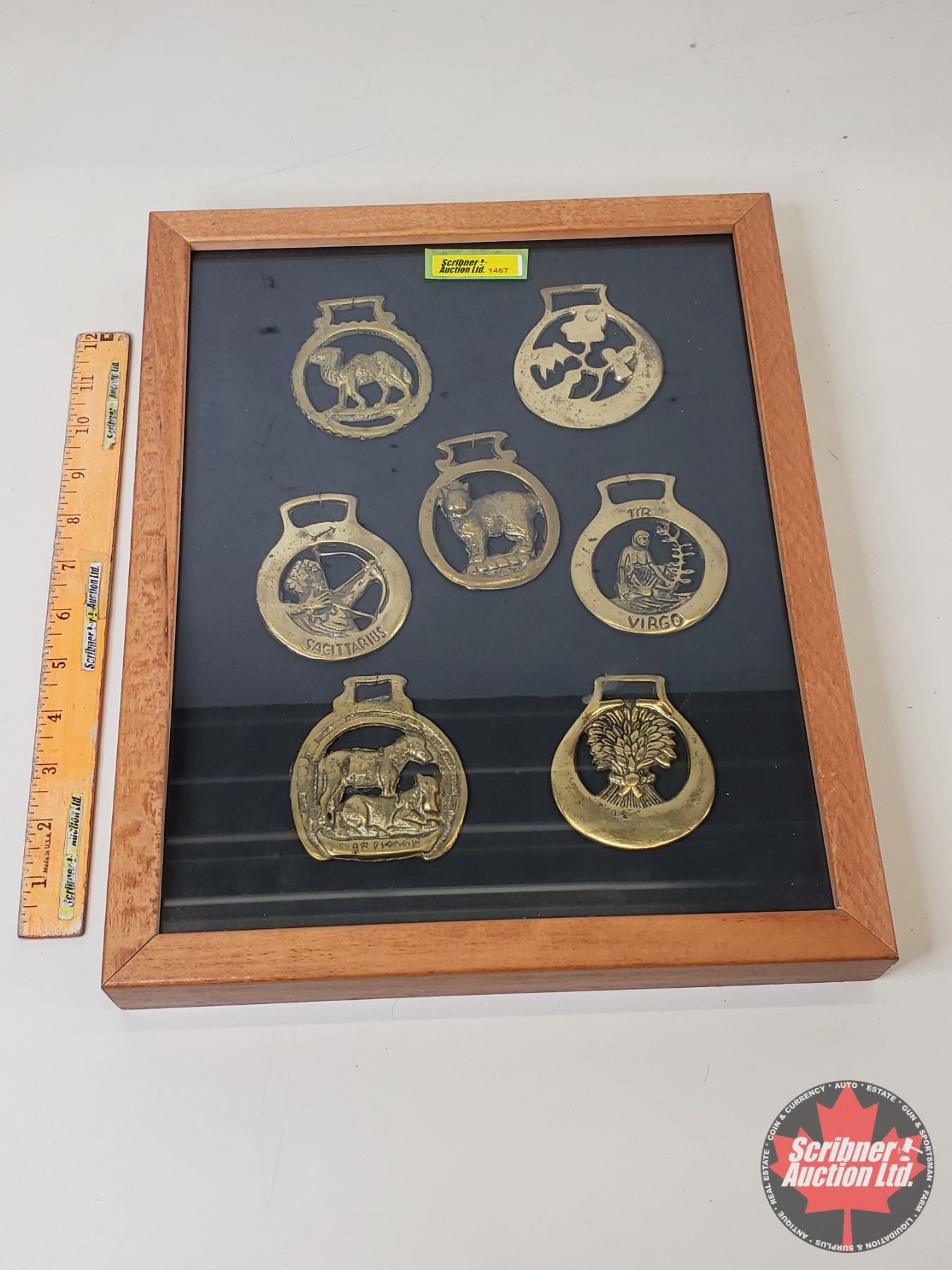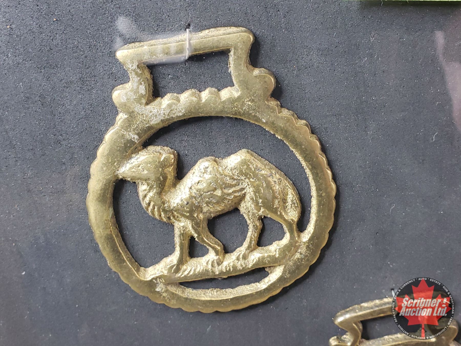 Variety of Vintage Brass Horse Harness Medallions (7) (Displayed in Frame) (Frame Measures: 15-1/4"H x 12-1/4"W) (SEE PICS!)